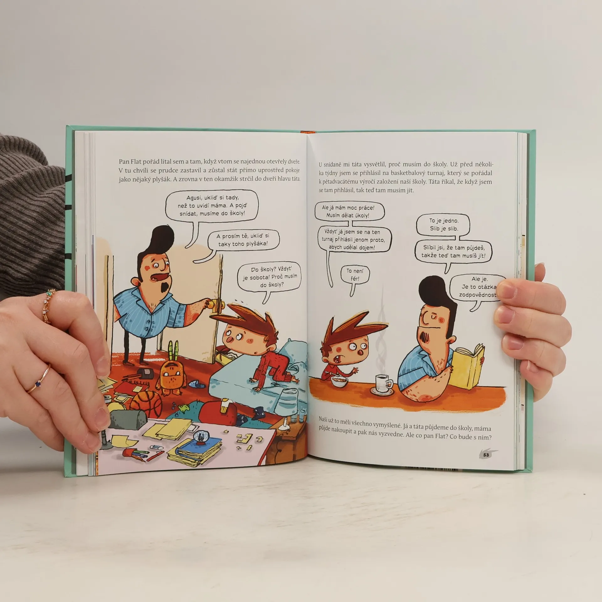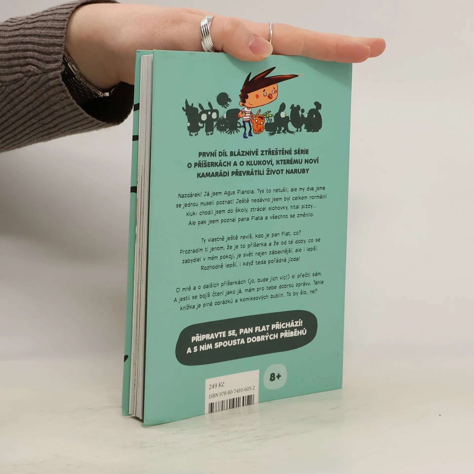 První díl bláznivě ztřeštěné série plné příšerek. Nazdárek! Já jsem Agus Pianola. Tys to netušil, ale my dva jsme se jednou museli poznat! Ještě nedávno jsem byl celkem normální kluk: chodil jsem do školy, ztrácel slohovky, hltal pizzy… Ale pak jsem poznal pana Flata a všechno se změnilo. Ty vlastně ještě nevíš, kdo je pan Flat, že jo? Prozradím ti jedině to, že je to příšerka a že od té doby, co se zabydlel v mém pokoji, je svět nejen zábavnější, ale i lepší. Rozhodně lepší, i když teda samý průšvih! O mně a o dalších příšerkách (jo, bude jich víc!) si přečti sám. A jestli se bojíš čtení jako já, mám pro tebe dobrou zprávu. Tahle knížka je plná obrázků a komiksových bublin. To by šlo, ne?