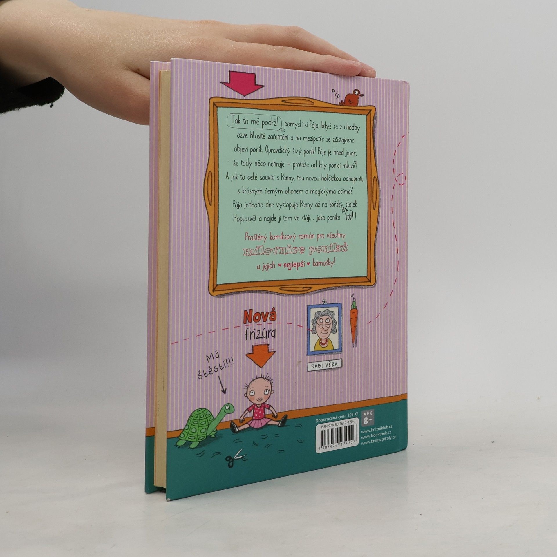 Tak to mě podrž! pomyslí si Pája, když se z chodby ozve hlasité zařehtání a na mezipatře se zčistajasna objeví poník. Opravdický živý poník! Páje je hned jasné, že tady něco nehraje – protože od kdy poníci mluví?! A jak to celé souvisí s Penny, tou novou holčičkou odnaproti, s krásným černým ohonem a magickýma očima? Pája jednoho dne vystopuje Penny až na koňský statek Hoplasvět a najde ji tam ve stáji... jako poníka!