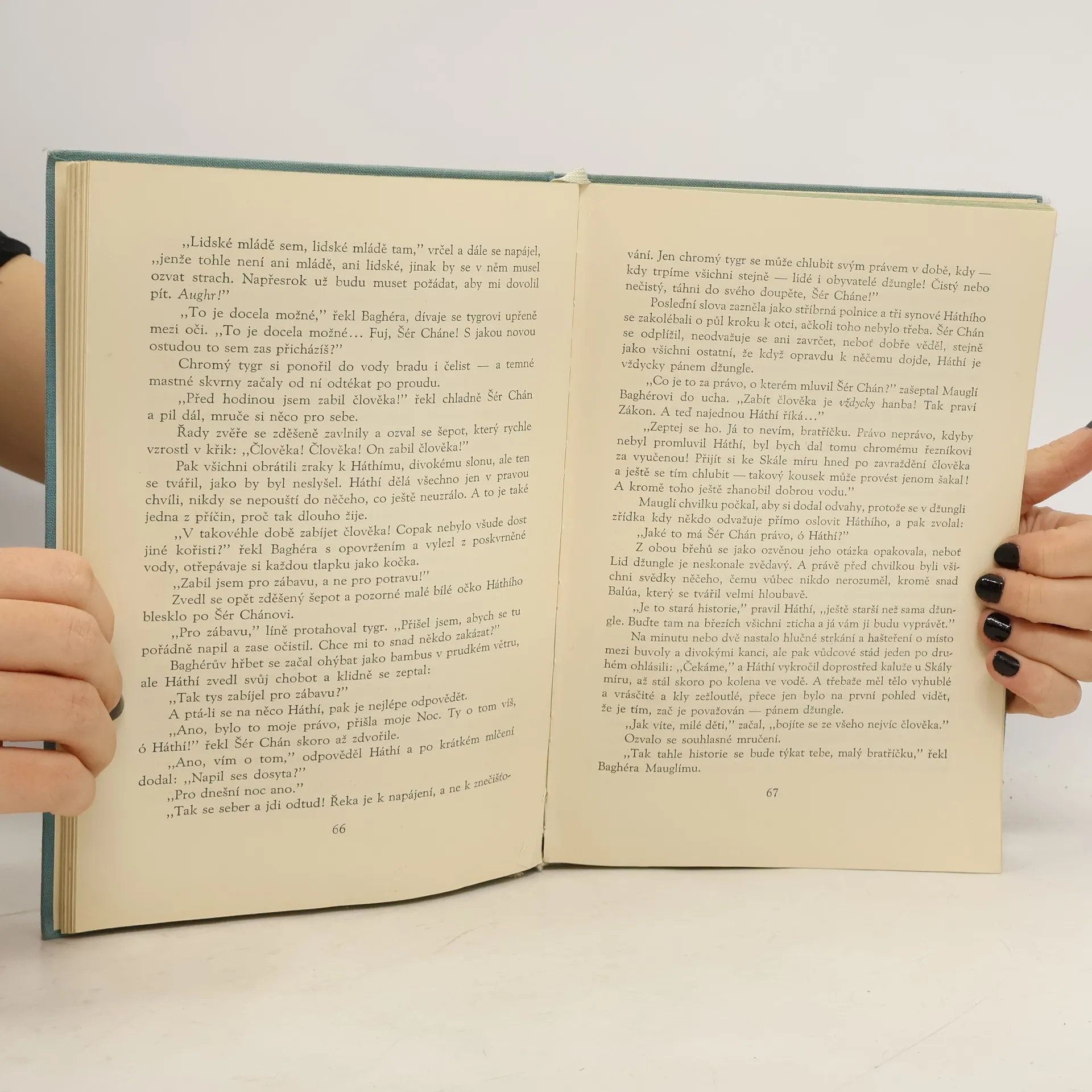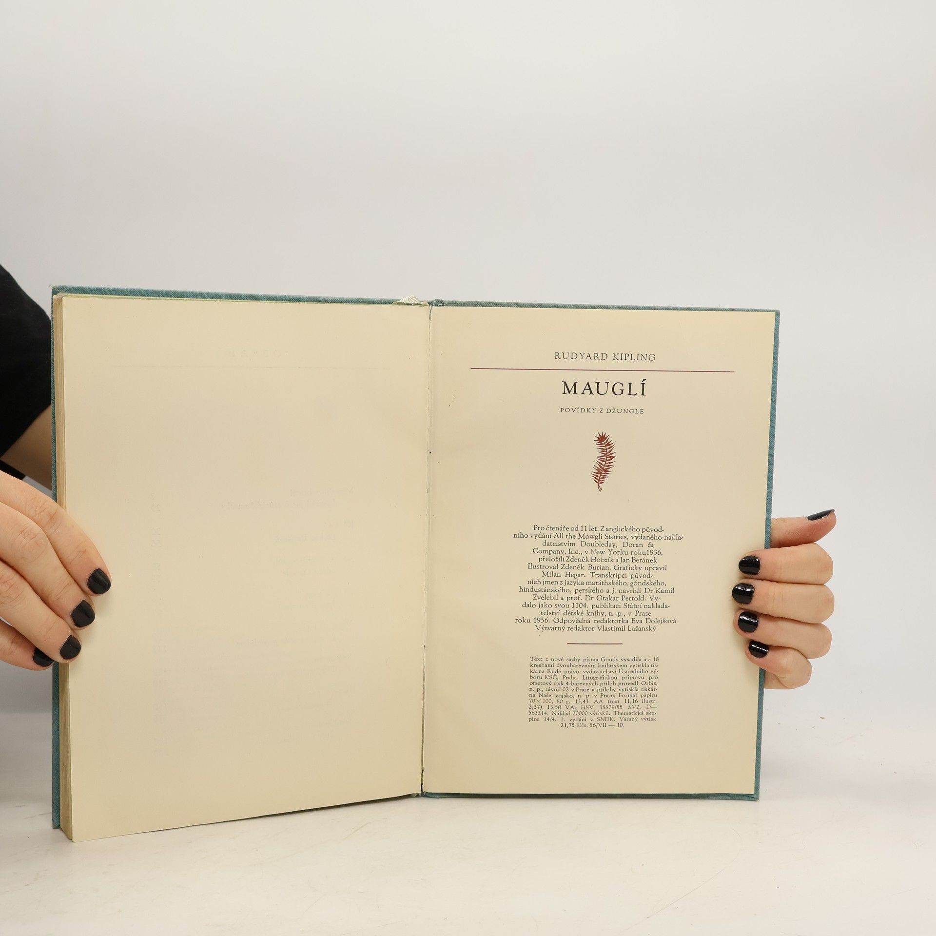Povídky z džungle. Příběh Mauglího. Dejištěm povídek o Mauglím jsou překrásné, rozlehlé džungle v jižní části střední Indie-v provincii Madhjapradéš. Město Séóní leží při silnici, jež spojuje Džabalpur a Nágpur, zhruba uprostřed vzdálenosti mezi nimi. Séóníský okres je skorocelý pokryt hlubokými hustými lesy, kde žije ve velikých množstvích rozmanitá divoká zvěř. V těchto džunglích, které patří k nejkrásnějším v celé Indii, loví obyvatelstvo jednak zvěř, jednak se živí těžbou bambusu nebo tvrdého, načervenalého těkového dřeva, výborného na stavbu lodí. Séóníským okresem se vine horní tok řeky Vajngangy, jež dosahuje šíře až 270 m a jejíž celková délka od pramene po soutok s Gódávarou činí 560 km. Kapitoly: Mauglího bratři-Lovecká píseň séóníské smečky, Ká loví-Pochod Bandarů, Jak se zrodil Strach-Zákon džungle, "Tygr ! Tygr !-Mauglího píseň, Vpád džungle-Mauglího zpěv proti lidem, Králův ankus-Píseň malého lovce, Rezavý pes-Čílův zpěv, Jarní běh-Zpěv na rozloučenou. První vydání v SNDK. Cena knihy v čase vydání: 21,75 Kčs.