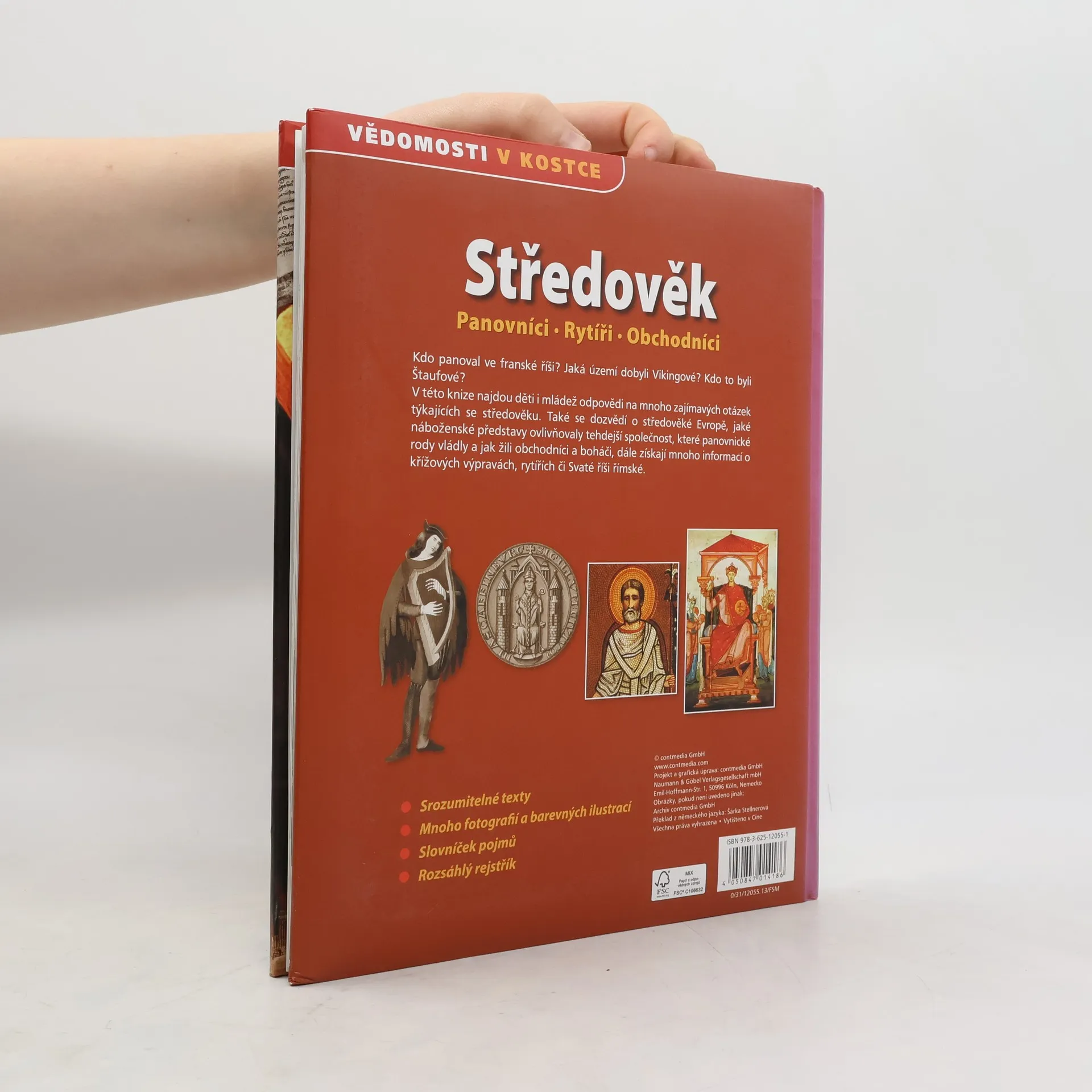 V této knize najdou děti odpovědi na mnoho zajímavých otázek týkajících se středověku. Dozvědí se, jaké náboženské představy ovlivňovaly středověkou společnost, které panovnické rody vládly a jak žili obchodníci a boháči. Získají mnoho informací o křížových výpravách, rytířích i Svaté říši římské.