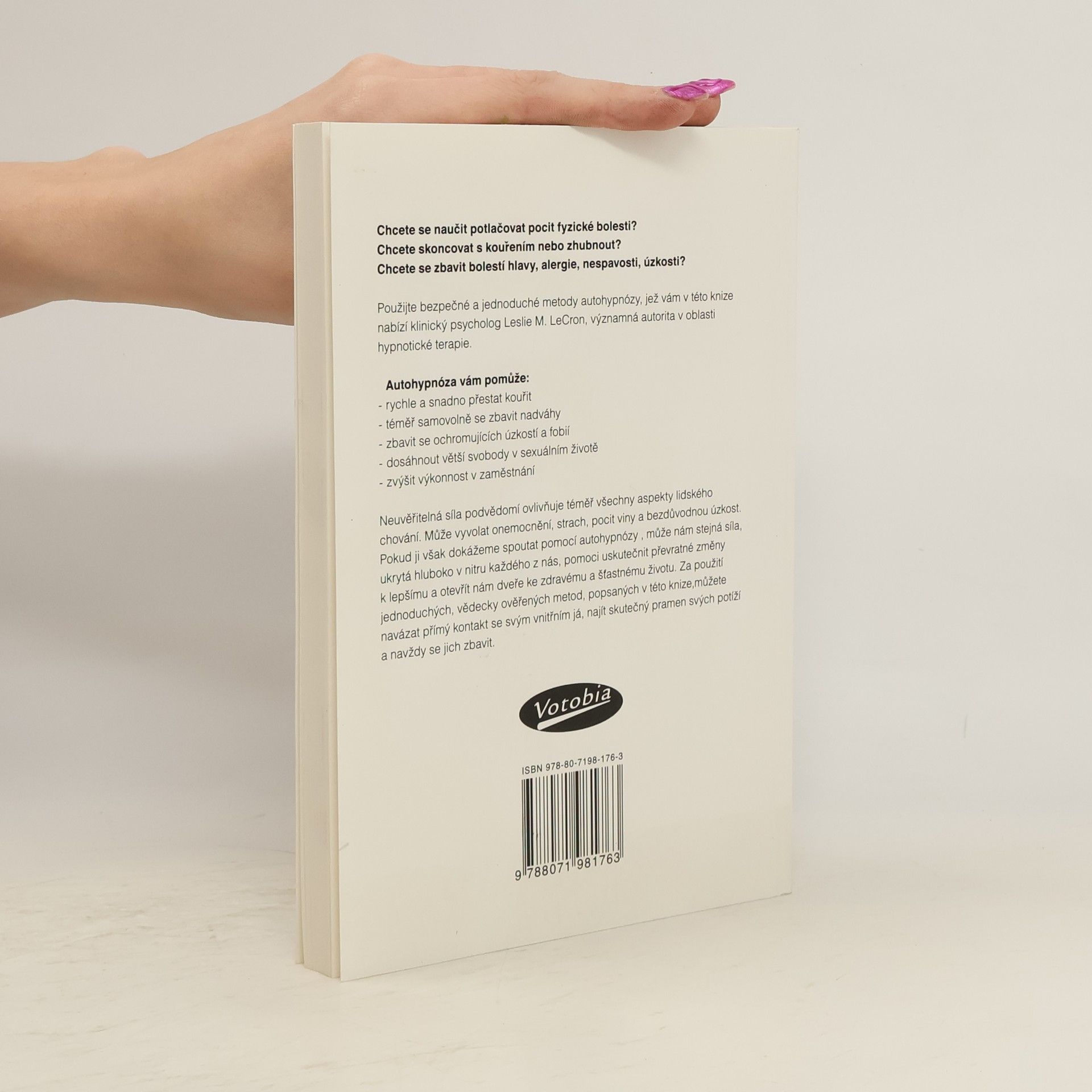 Chcete se naučit potlačovat pocit fyzické bolesti? Chcete skoncovat s kouřením nebo zhubnout? Chcete se zbavit bolesti hlavy, alergie, nespavosti a úzkosti? Použijte bezpečné a jednoduché metody autohypnózy, jež vám v této knize nabízí klinický psycholog Leslie M. LeCron, významná autorita v oblasti hypnotické terapie.