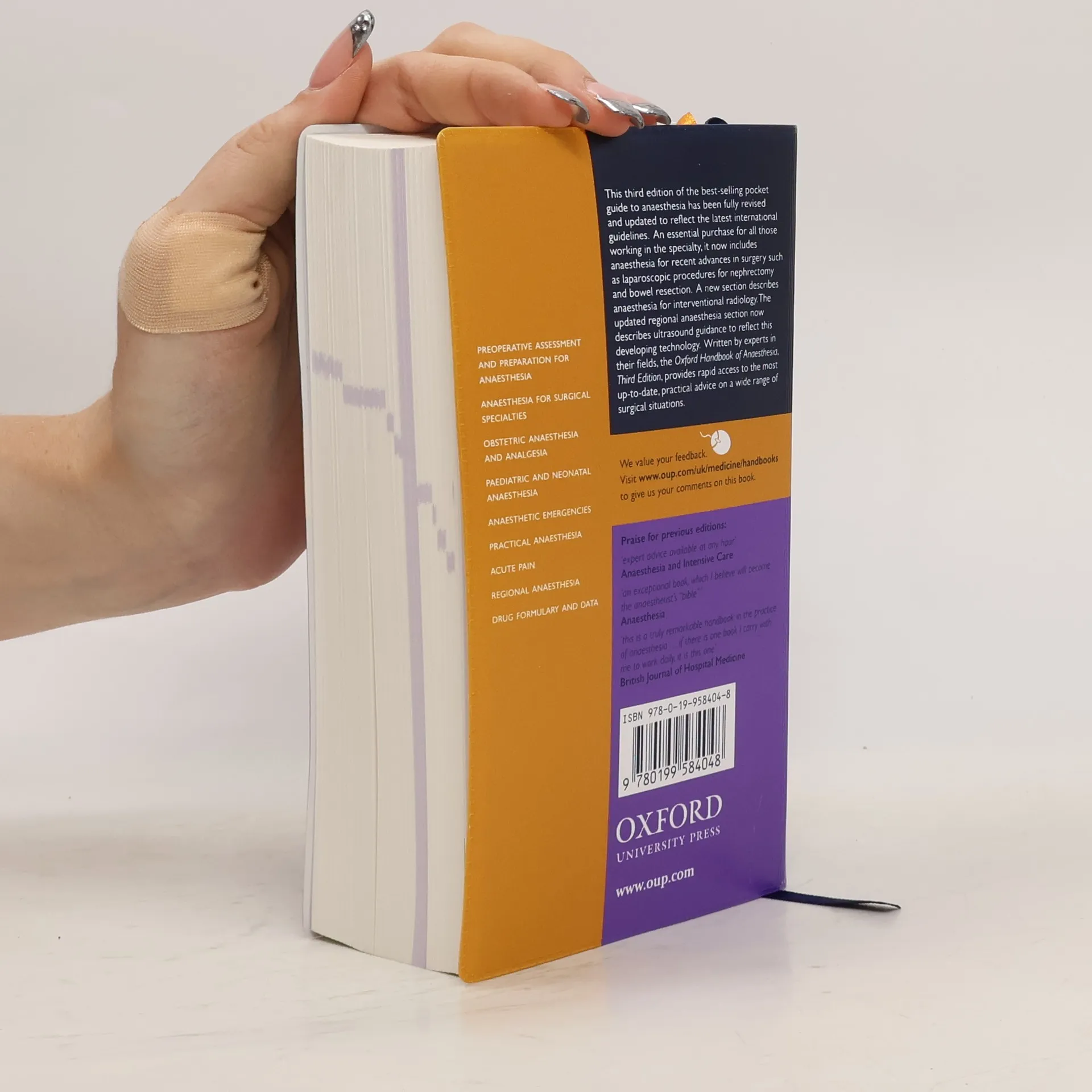 The 'Oxford Handbook of Anaesthesia' continues to provide state of the art information on anaesthetic practice. The third edition has a new colour layout and includes new topics on risk, consent, organ donation, anaesthesia for the critically ill patient, and management of perioperative IV fluids.