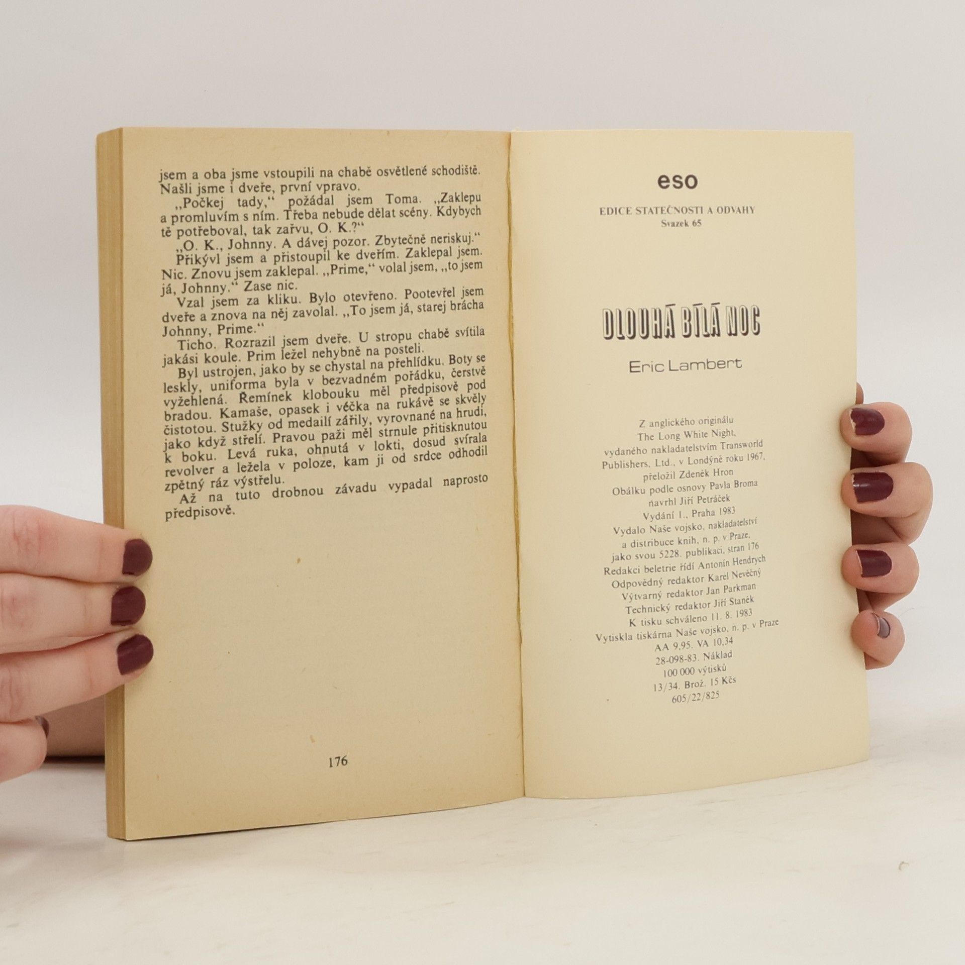 Ilustroval Pavel Brom Edice Eso 65, 1 vydání v českém jazyce Předposlední román Erica Lamberta Dlouhá bílá noc (The Long White Night) je postaven na vzájemném kontrastu proplétajících se časových rovin: retrospektivy válečného příběhu a jeho obrazu v dramatické přítomnosti i v osudecha osobních tragédiích zúčastněných postav. Pečlivě gradovaný děj kulminuje právě v dlouhé bílé noci, pod jejímž úplňkem se v zuřivém boji odkrývá pravá podstata lidských hodnot, povah i charakterů.