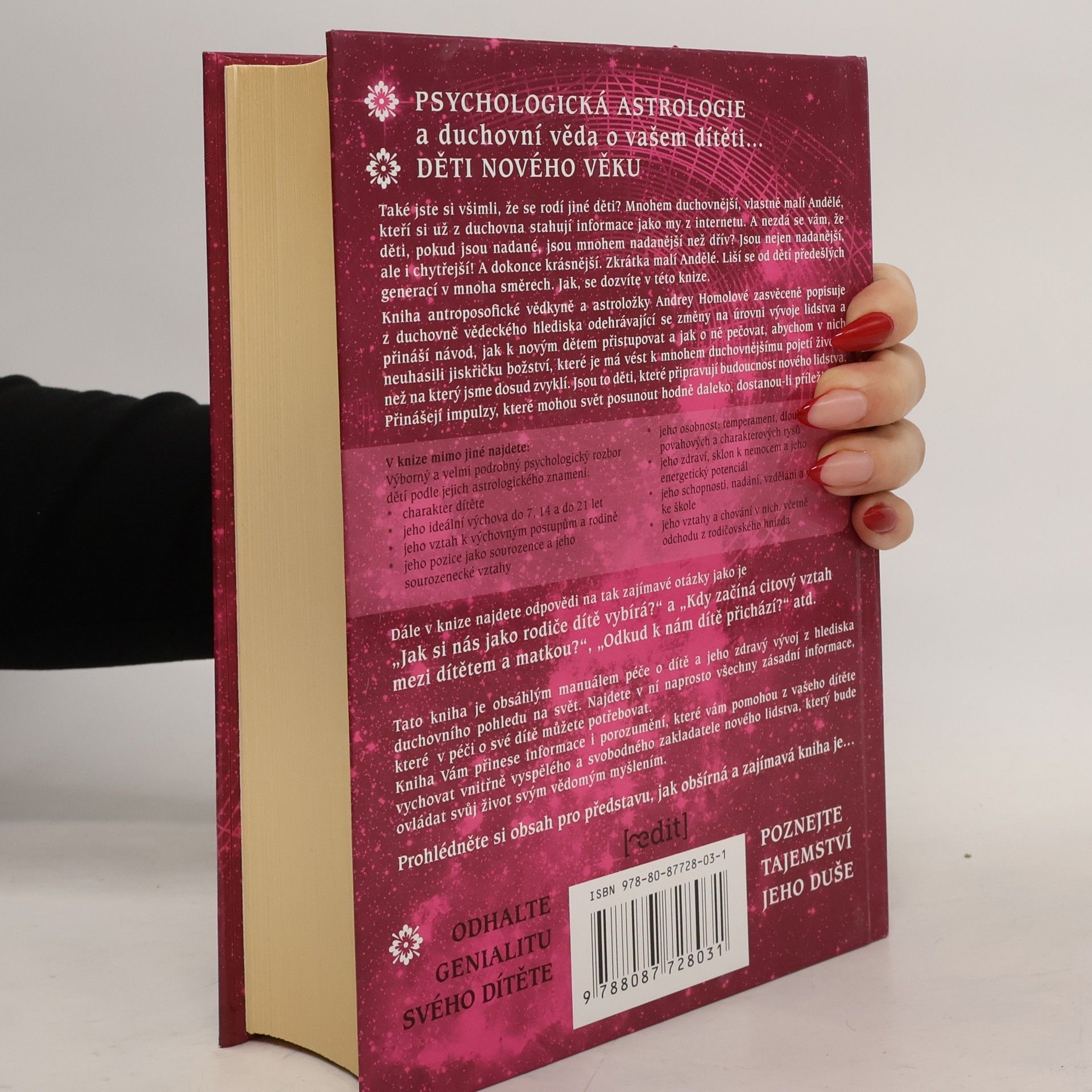 Tato kniha je obsáhlým manuálem péče o dítě a jeho zdravý vývoj z hlediskaduchovního pohledu na svět. Najdete v ní naprosto všechny zásadní informace, které v péči o své dítě můžete potřebovat. Kniha Vám přinese informace i porozumění, které vám pomohou z vašeho dítětevychovat vnitřně vyspělého a svobodného zakladatele nového lidstva, který bude ovládat svůj život svým vědomým myšlením.