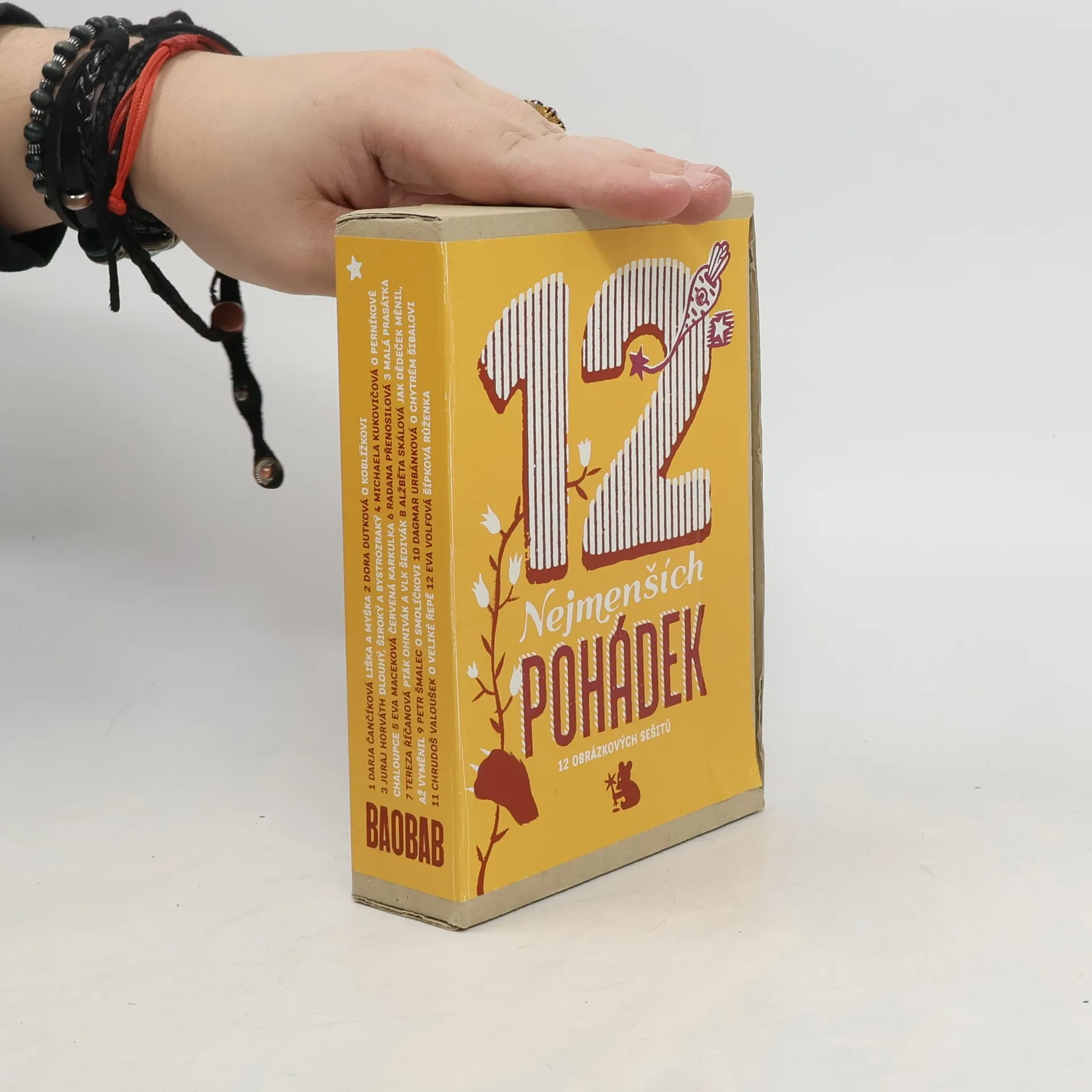 12 let Baobabu — 12 sešitků, 12 klasických evropských pohádek vyprávěných obrazem na 16 stranách 12 výtvarníky Baobabu v 1 krabičce. 12 pohádek = 12 autorských bilderbuchů = 12 malých sešitků do malých ručiček, především k prohlížení, ale také ke čtení, domýšlení a vyprávění. Od klasického komiksového převyprávění Alžběty Skálové (Jak stařeček měnil až vyměnil) a Dagmar Urbánkové (O chytrém šibalovi), přes fantastické karetní kresby Juraje Horvátha (Dlouhý, Široký a Bystrozraký), přímočarou linorytovou taškařici Chrudoše Valouška (O řepě), spontánní malby Terezy Říčanové (Pták Ohnivák a vlk Šedivák) i chytře popové Radany Přenosilové (Tři malá prasátka), dekorativní koláž Michaely Kukovičové (O perníkové chaloupce), vtipnou sprejovanou zkratku Dory Dutkové (O koblížkovi), hravé symbolické vyprávění Evy Macekové (Červená Karkulka), důvtipné šablony Petra Šmalce (O Smolíčkovi) po vyšívaný „naivismus“ Evy Volfové (Šípková Růženka), či poetické „mrázkovské“ malování Darji Čančíkové (Liška a myška)...