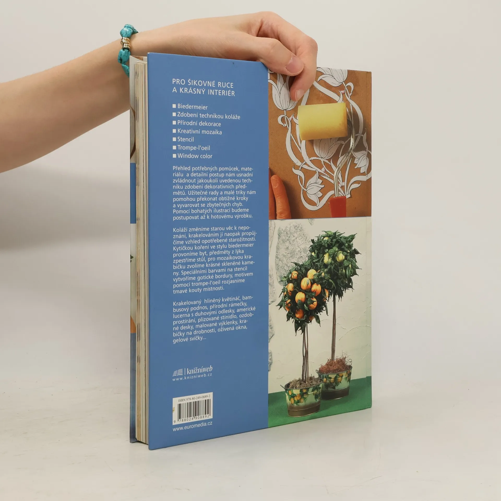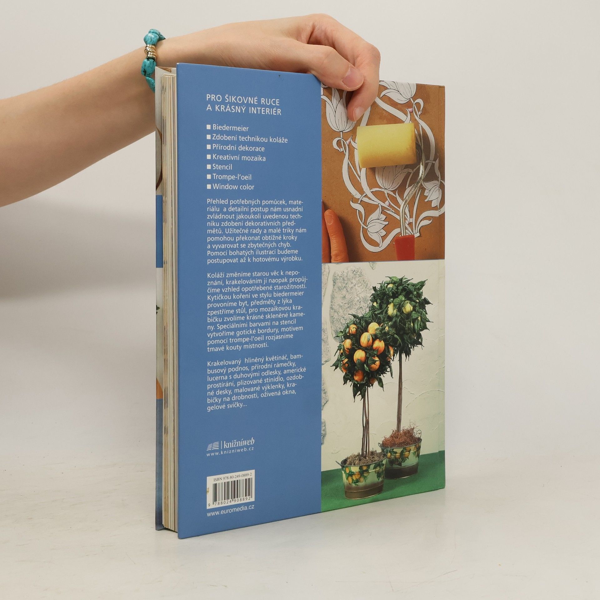 Kniha určená všem, kteří si chtějí vylepšit interiér, mají fantazii a šikovné ruce. Přehled potřebných pomůcek, materiálu a detailní postup usnadní zvládnout moderní techniky zdobení dekorativních předmětů. Koláží změníme starou věc k nepoznání, krakelováním jí naopak propůjčíme vzhled opotřebené starožitnosti. Kytičkou koření ve stylu biedermeier provoníme byt, předměty z lýka zpestříme stůl, pro mozaikovou krabičku zvolíme krásné skleněné kameny.