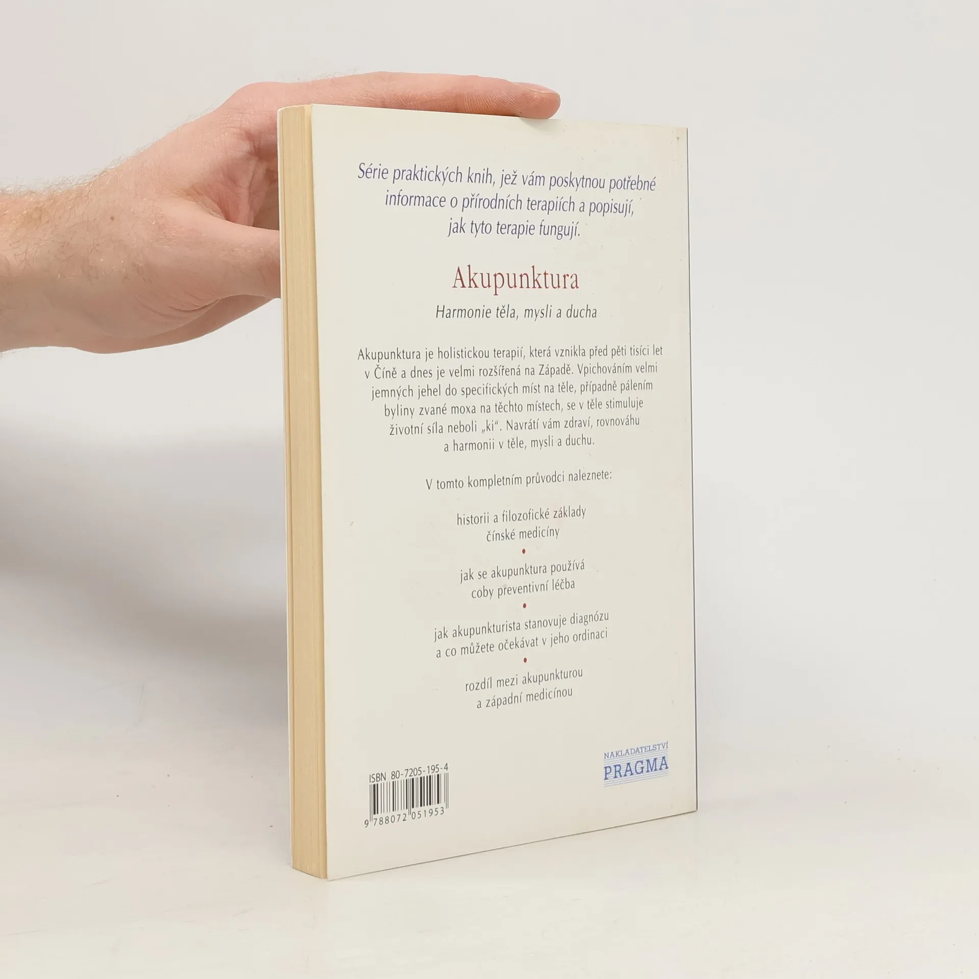 Další ze série praktických knih, jež vám poskytnou potřebné informace o přírodních terapiích a popisují, jak tyto terapie fungují. Akupunktura je holistickou terapií, která vznikla před pěti tisíci let v Číně a dnes je velmi rozšířená na Západě. Vpichováním velmi jemných jehel do specifických míst na těle, případně pálením byliny zvané moxa na těchto místech, se v těle stimuluje životní síla neboli "ki". Navrátí vám zdraví, rovnováhu a harmonii v těle, mysli a duchu. V tomto kompletním průvodci naleznete: - historii a filozofické základy čínské medicíny - jak se akupunktura používá coby preventivní léčba - jak akupunkturista stanovuje diagnózu a co můžete očekávat v jeho ordinaci - rozdíl mezi akupunkturou a západní medicínou