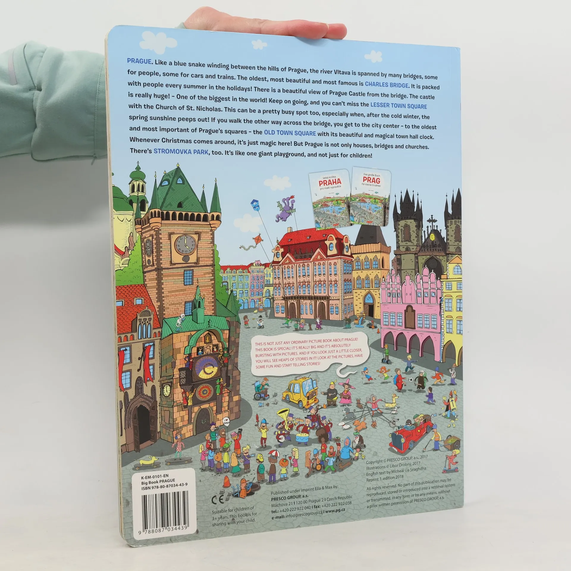 Toto není jen tak nějaká obyčejná obrázková kniha o Praze. Je speciální! Je velká a plná obrázků nejznámějších pražských míst, které znají turisté z celého světa. Najdete v ní Karlův most, Malostranské náměstí, Staroměstské náměstí a Stromovku. Každé její otevření přináší nové objevy a dobrodružství. A když se podíváte blíže, uvidíte, že kniha ukrývá mnoho příběhů! Jejich pokračování a spoustu nových si s pomocí rodičů určitě vymyslíte samy. Možná ještě neumíte číst písmenka, ale tvořit zajímavé příběhy zvládnete určitě. Hurá do toho! Kniha je v anglickém jazyce.