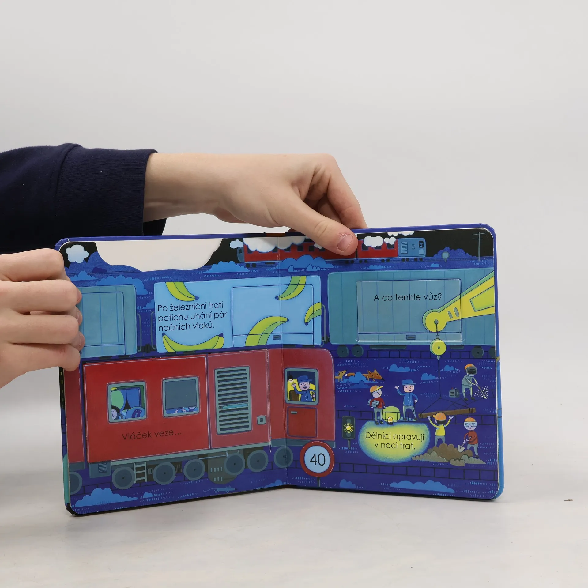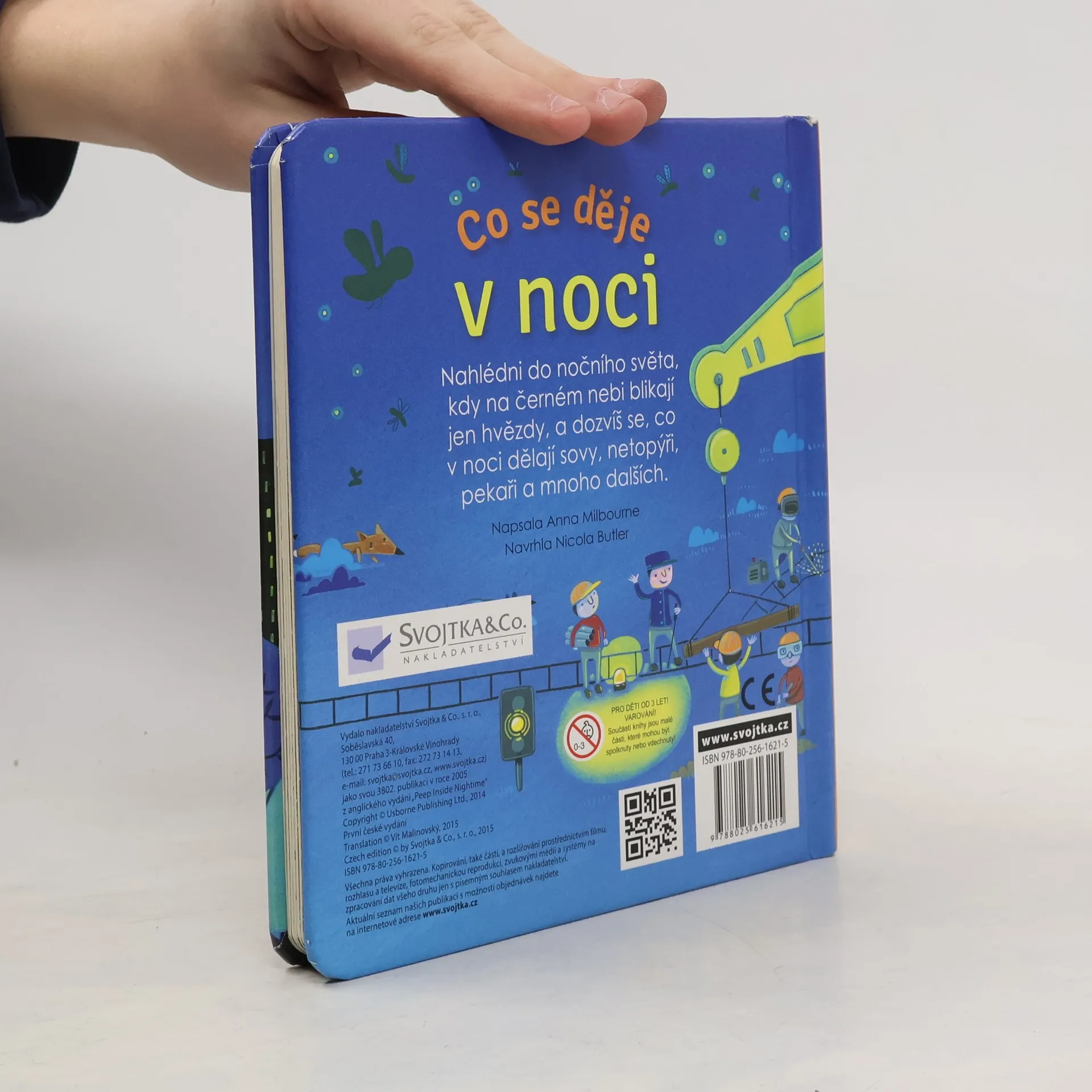 V noci, když vyjde měsíc a zatřpytí se hvězdy, rozhostí se v ulicích klid. Už všichni spí? Copak se to děje v pekárně? Kdo to tu visí hlavou dolů? Kdo se tu schovává pod listem? Kdo se v noci vydává na průzkum? Co všechno se děje v noci? S touto krásně ilustrovanou knížkou můžeš nahlédnout do nočního světa, kdy na černém nebi blikají jen hvězdy. Tak honem, zalistuj v knížce, odklop všechna okénka a podívej se pod ně. Dozvíš se, co v noci dělají sovy, netopýři, pekaři a mnoho dalších.