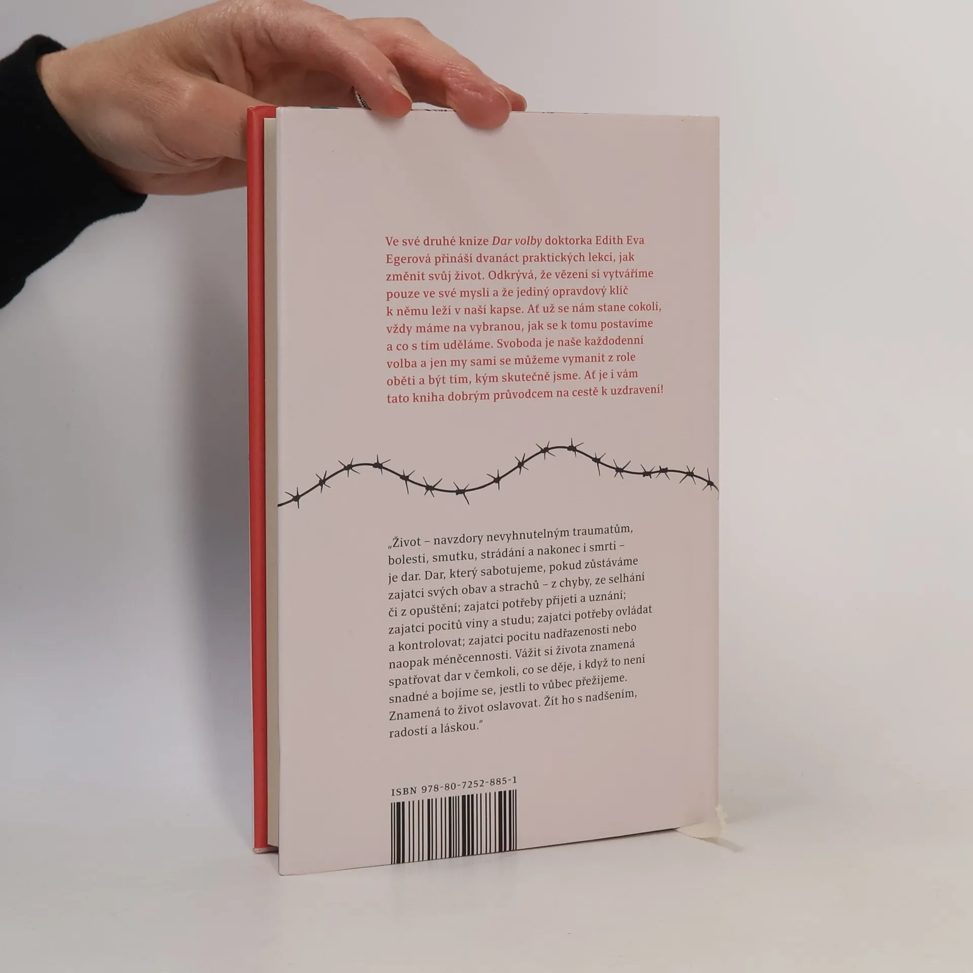 Ve své druhé knize Dar volby doktorka Edith Eva Egerová přináší dvanáct praktických lekcí, jak změnit svůj život. Odkrývá, že vězení si vytváříme pouze v naší mysli a že jediný opravdový klíč k němu leží v naší kapse. Ať už se nám stane cokoli, vždy máme na vybranou, jak se k tomu postavíme a co s tím uděláme. Svoboda je naše každodenní volba a jen my sami se můžeme vymanit z role oběti a být tím, kým skutečně jsme. Ať je i vám tato kniha dobrým průvodcem na cestě k uzdravení! „Život – navzdory nevyhnutelným traumatům, bolesti, smutku, strádání a nakonec i smrti – je dar. Dar, který sabotujeme, pokud zůstáváme zajatci svých obav a strachů – z chyby, ze selhání či z opuštění. Vážit si života znamená spatřovat dar v čemkoli, co se děje, i když to není snadné a bojíme se, jestli to vůbec přežijeme. Znamená to život oslavovat. Žít ho s nadšením, radostí a láskou.“