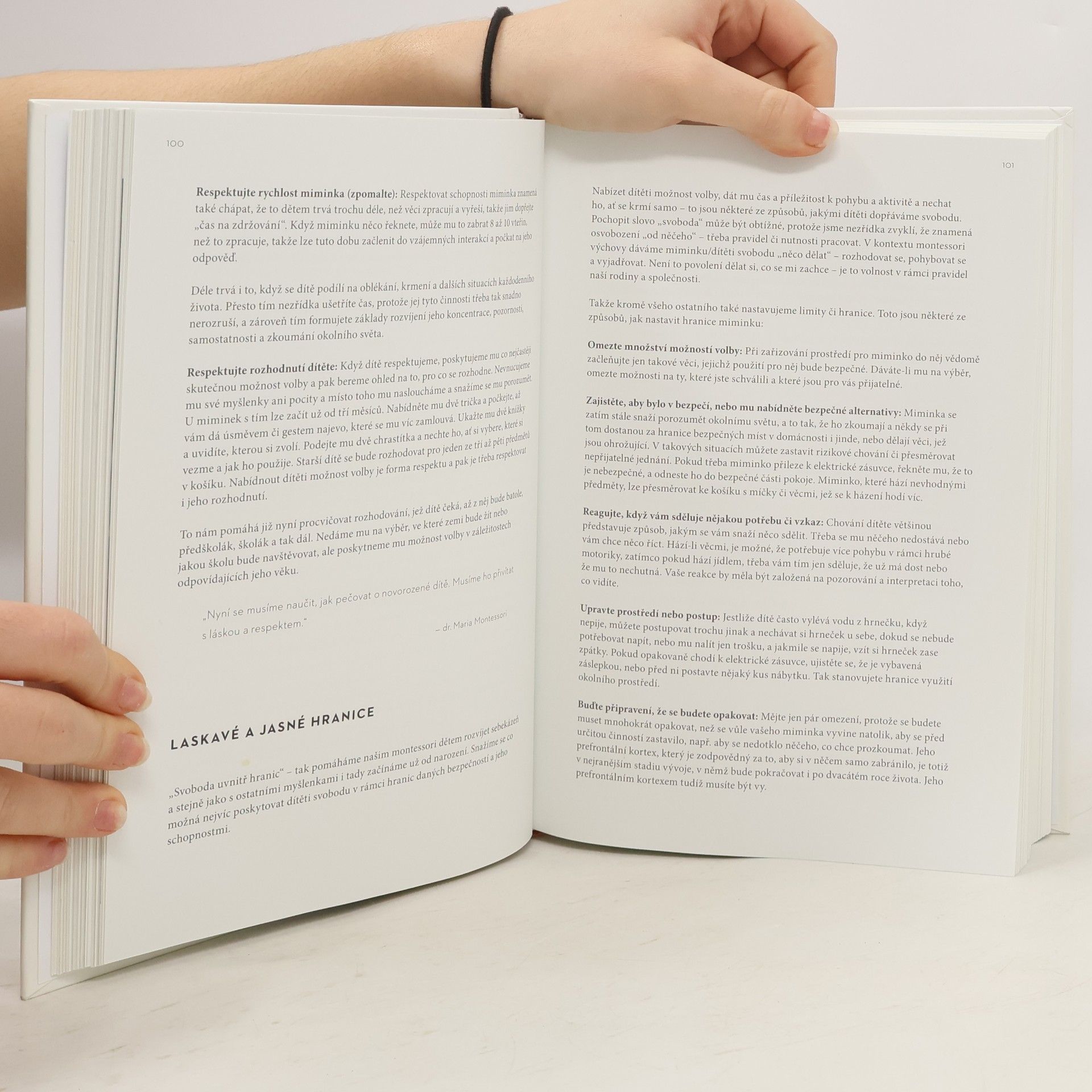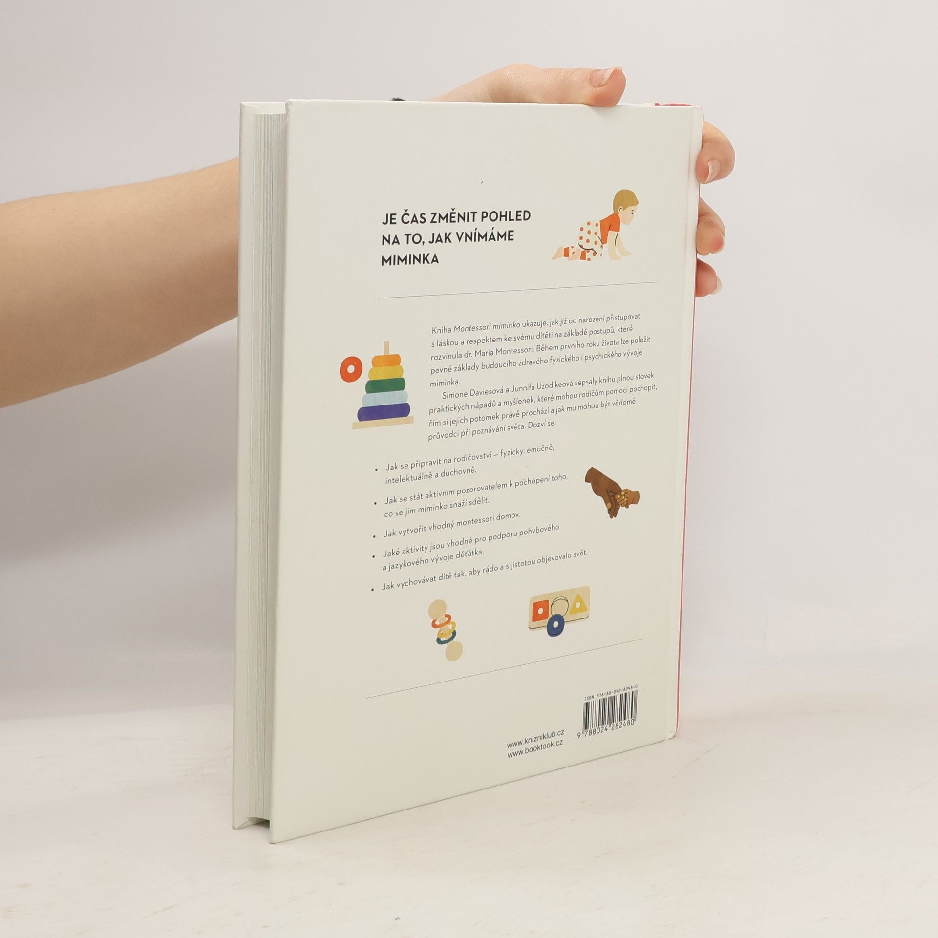 Miminka se toho v prvních měsících spoustu naučí, což však bohužel vede ke snaze o zbytečné urychlování jejich vývoje. Na trh se dostaly všelijaké pomůcky, které mají děťátku pomoci lépe spát, dříve sedět či rychleji chodit. Naučte se s touto knihou lépe vnímat své drobečky, pozorujte je, vnímejte je jako silná a schopná stvoření, která objevují okolní svět coby neúnavní badatelé. Zpomalte a dopřejte miminku čas, aby se samo protahovalo a poznávalo své tělo. Každý rodič a každé dítě mohou těžit z Montessori přístupu od prvních týdnů, prvních dnů, prvních hodin života děťátka – dokonce už v době, kdy je ještě v matčině děloze.