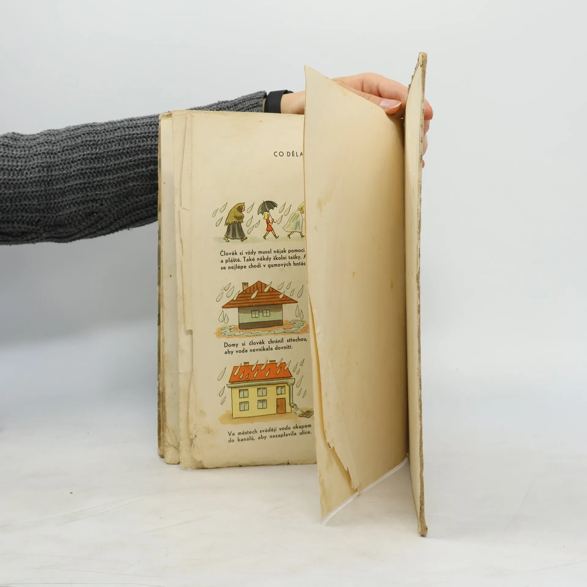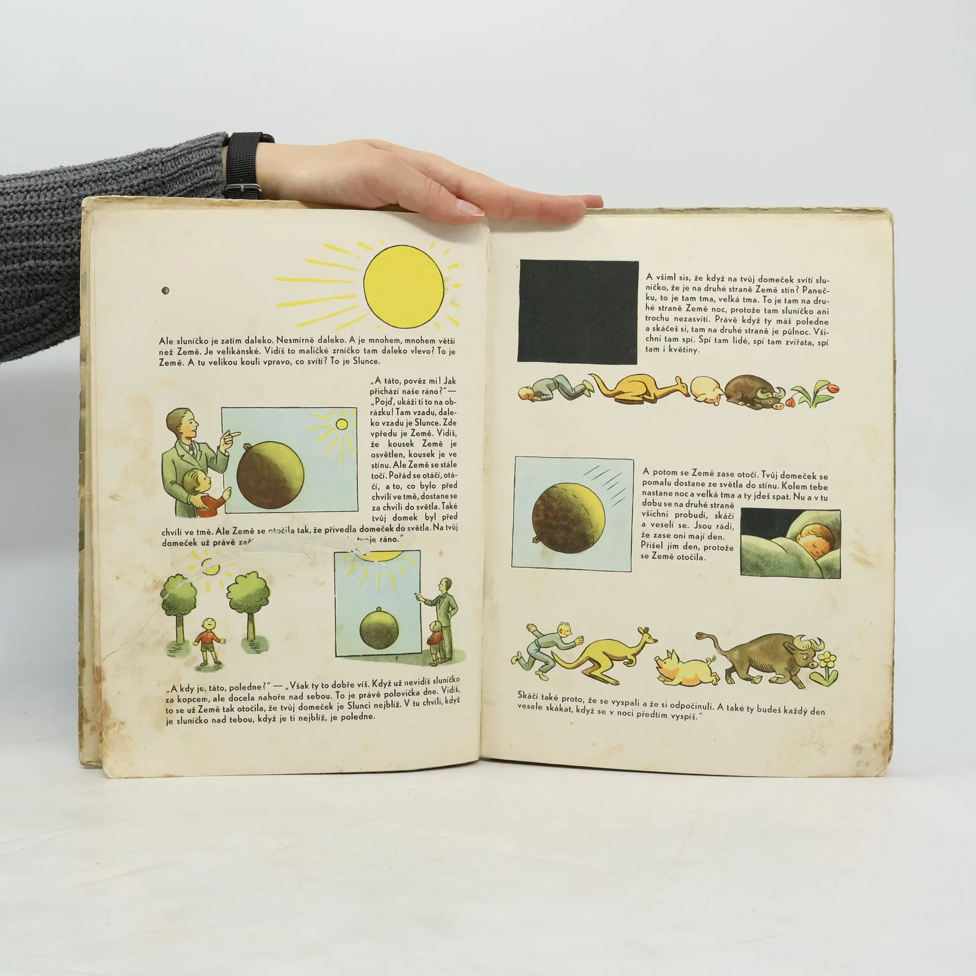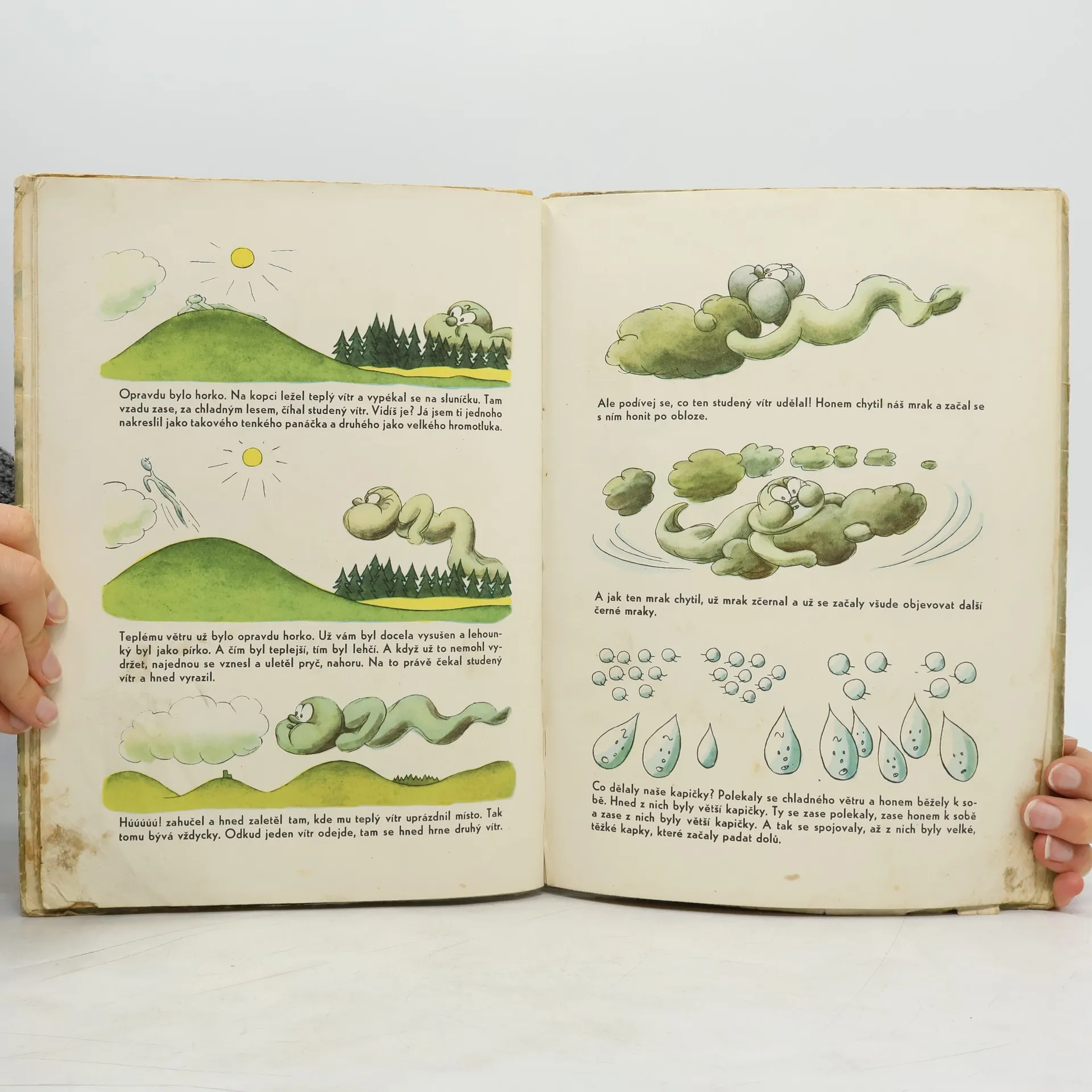 Co je to den a co je to noc. Co jsou mraky a co je déšť. Co dělá elektřina. Co dělá voda a co dělá počasí. Co dělal člověk (proti vodě, proti blesku, jak využil větru, proti tmě, proti zimě, jak využívá sluníčka. jak staví přehrady, zřizuje větrolamy, buduje zavodňovací kanály). A co ještě bude dělat člověk (další ovládnutí mraků, slunce, větrů, využití vody a elektřiny atd.). Barevné obrázky doprovázené vysvětlujícím textem.