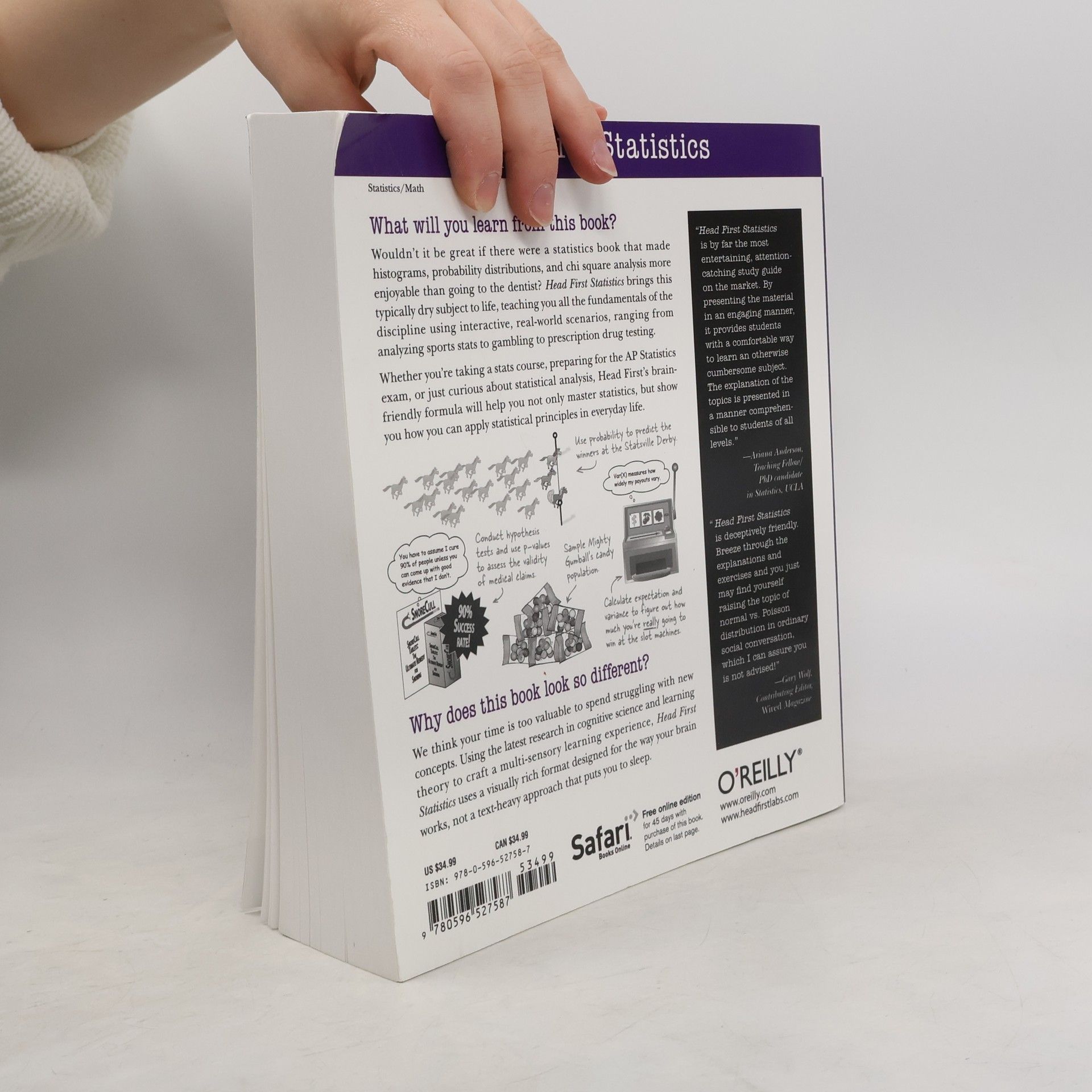 Wouldn't it be great if there were a statistics book that made histograms, probability distributions, and chi square analysis more enjoyable than going to the dentist? Head First Statistics brings this typically dry subject to life, teaching you everything you want and need to know about statistics through engaging, interactive, and thought-provoking material, full of puzzles, stories, quizzes, visual aids, and real-world examples.Whether you're a student, a professional, or just curious about statistical analysis, Head First's brain-friendly formula helps you get a firm grasp of statistics so you can understand key points and actually use them. Learn to present data visually with charts and plots; discover the difference between taking the average with mean, median, and mode, and why it's important; learn how to calculate probability and expectation; and much more.Head First Statistics is ideal for high school and college students taking statistics and satisfies the requirements for passing the College Board's Advanced Placement (AP) Statistics Exam. With this book, you'Before you know it, you'll not only have mastered statistics, you'll also see how they work in the real world. Head First Statistics will help you pass your statistics course, and give you a firm understanding of the subject so you can apply the knowledge throughout your life.