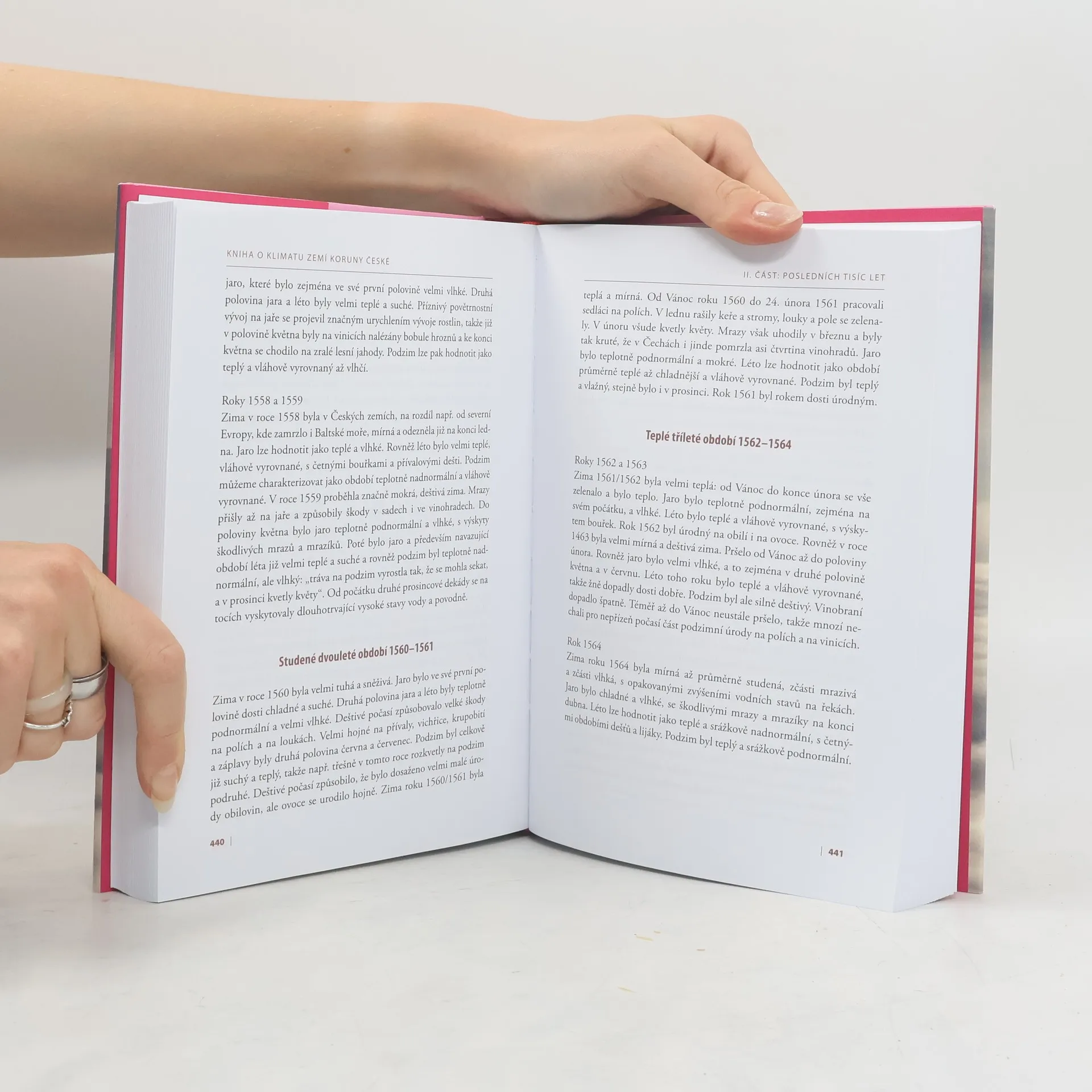 První část této mimořádné a nedocenitelně důležité knihy se zabývá obecným vývojem klimatu, přičemž se věnuje základním přirozeným mechanismům klimatických změn. Vysvětluje základní termíny, seznamuje s metodami klimatického výzkumu včetně jeho dějin a přináší odpovědi na důležité otázky, z nichž vybíráme: Proč jsou důležité mořské oscilace? – Je naše doba skutečně klimaticky extrémnější? – Proč se Země otepluje méně, než bychom čekali?Druhá, hlavní část knihy popisuje průběh počasí a klimatické epizody minulých staletí, přičemž je založena na rozsáhlém souboru čtyřiceti pěti tisíc výpisků z kronik a dalších historických dokumentů pro roky 1000–1775, a to po jednotlivých letech. Tuto část uzavírá jednak přehled přirozených období malé doby ledové podle teplotních a srážkových řad meteorologické observatoře v pražském Klementinu, jednak stručná charakteristika podnebí 20. stoletíV třetí, závěrečné části knihy se ocitáme v klimatu budoucího světa a hledáme zde konkrétní odpovědi na otázku Co nás čeká a co se s tím dá dělat? Zde najdeme i zcela praktické rady, jak si poradit doma, ve městě, na poli či v lese.