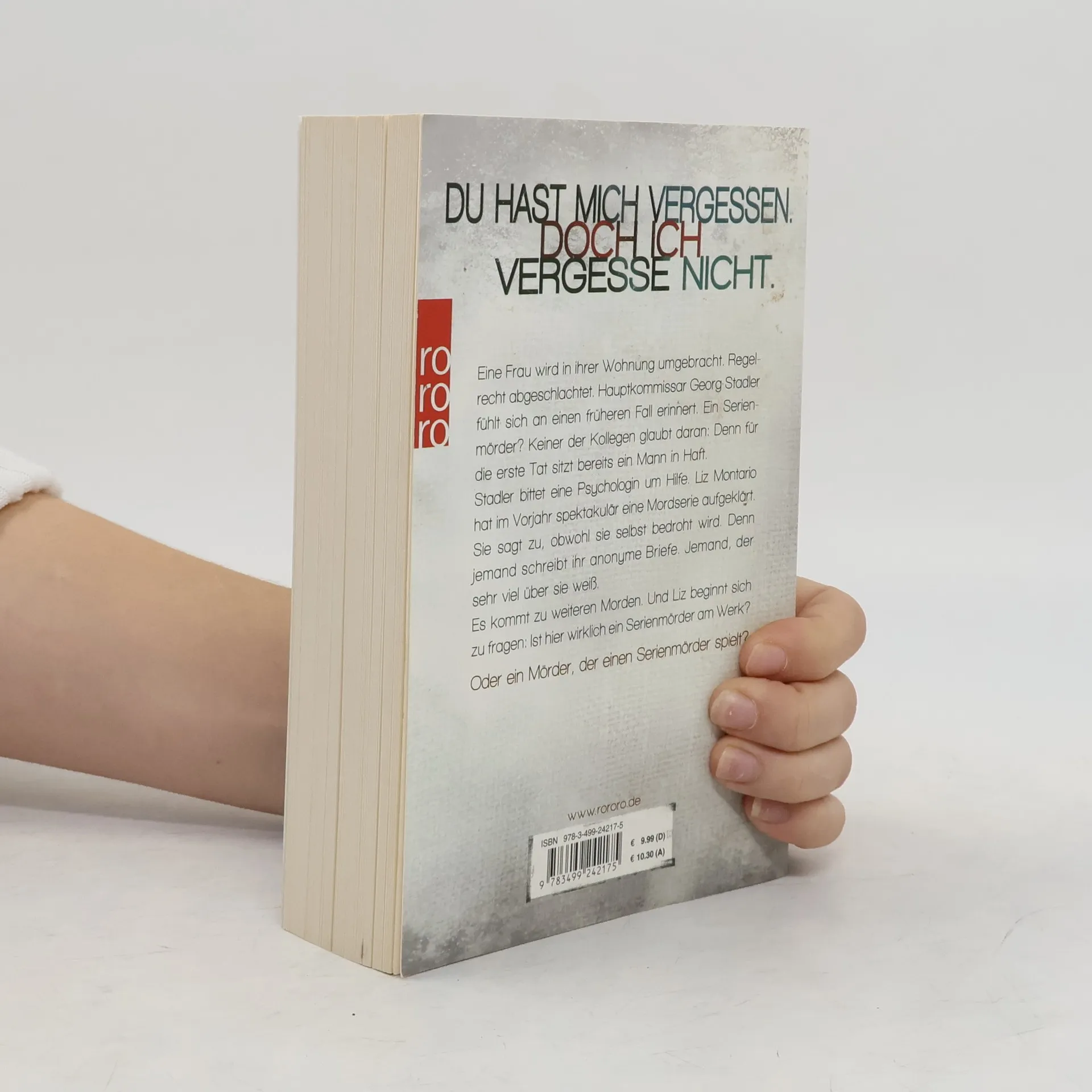Du hast mich vergessen. Doch ich vergesse nicht. Eine Frau wird in ihrer Wohnung umgebracht. Regelrecht abgeschlachtet. Hauptkommissar Georg Stadler fühlt sich an einen früheren Fall erinnert. Ein Serienmörder? Keiner der Kollegen glaubt daran: Denn für die erste Tat sitzt bereits ein Mann in Haft. Stadler bittet eine Psychologin um Hilfe. Liz Montario hat im Vorjahr spektakulär eine Mordserie aufgeklärt. Sie sagt zu, obwohl sie selbst bedroht wird. Denn jemand schreibt ihr anonyme Briefe. Jemand, der sehr viel über sie weiß. Es kommt zu weiteren Morden. Und Liz beginnt sich zu fragen: Ist hier wirklich ein Serienmörder am Werk? Oder ein Mörder, der einen Serienmörder spielt?