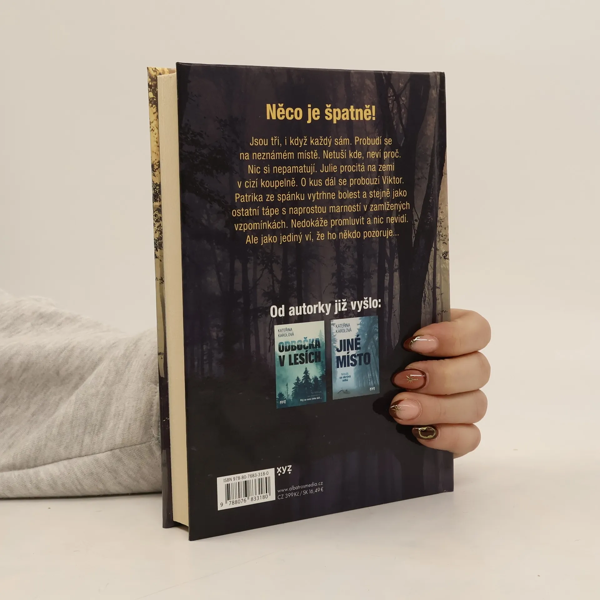 Kdosi je poblíž... Jsou tři, i když každý sám. Probudí se na neznámém místě. Netuší kde, neví proč. Nic si nepamatují. Julie procitá na zemi v cizí koupelně. O kus dál se probouzí Viktor. Patrika ze spánku vytrhne bolest a stejně jako ostatní tápe s naprostou marností v zamlžených vzpomínkách. Nedokáže promluvit a nic nevidí. Ale jako jediný ví, že je někdo poblíž... Český thriller úspěšné blogerky a spisovatelky Kateřiny Karolové vás přesvědčí, že seveřané nejsou jediní mistři napínavé literatury.