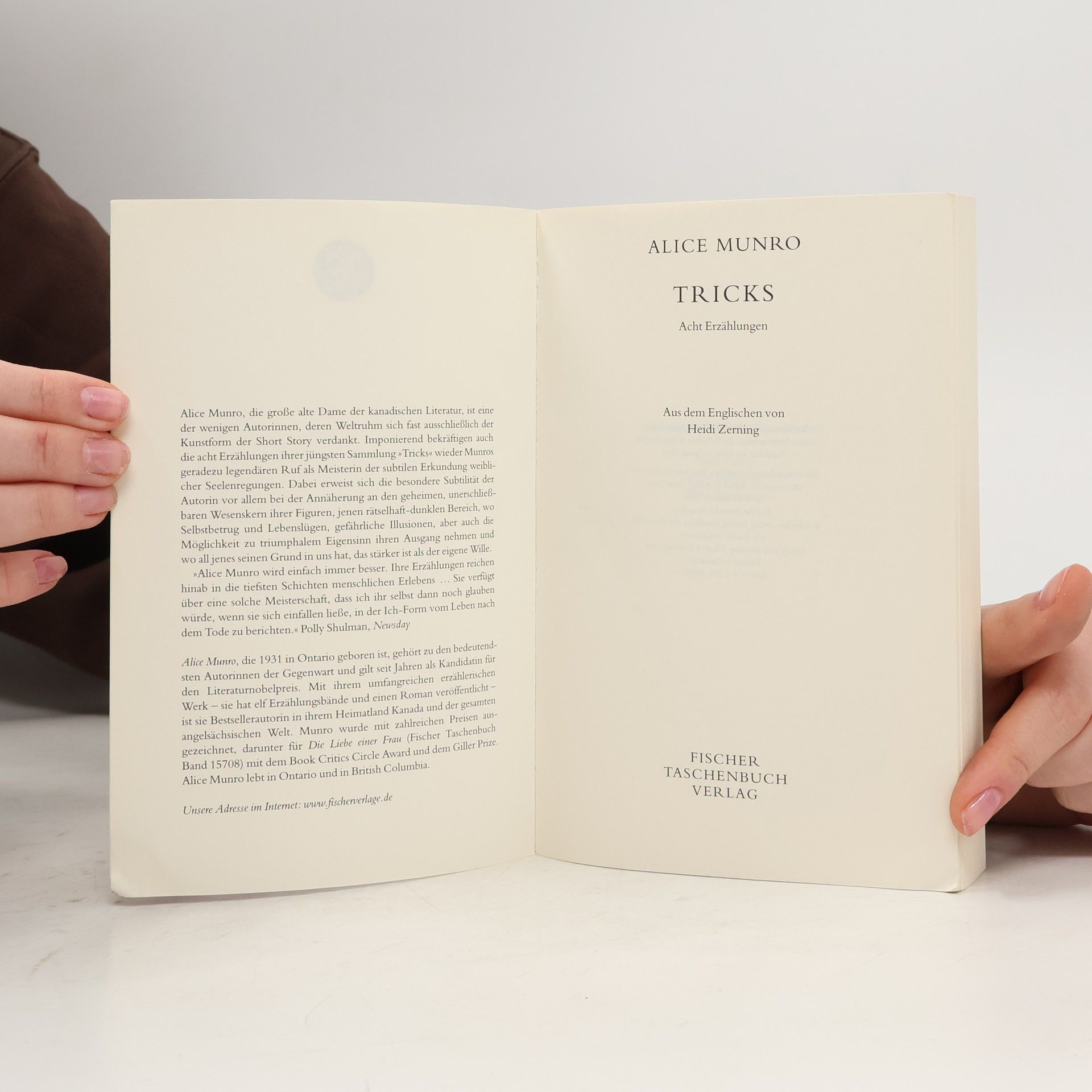 Nobelpreis für Literatur 2013 Tricks, acht meisterliche Erzählungen von Alice Munro: Geschichten über Ausreißer, Entscheidungen, Leidenschaften und Verfehlungen. Wieder beweist Alice Munro besonderes Gespür für das Geheimnis ihrer Figuren, jenen rätselhaften Bereich, wo Selbstbetrug auf Hoffnungen, gefährliche Illusionen auf die kleinen Tricksereien des Alltags treffen. Der Leser kommt in ihren Geschichten seinem eigenen Leben so nah, dass er schwindlig wird vor Herzleid und Glück.