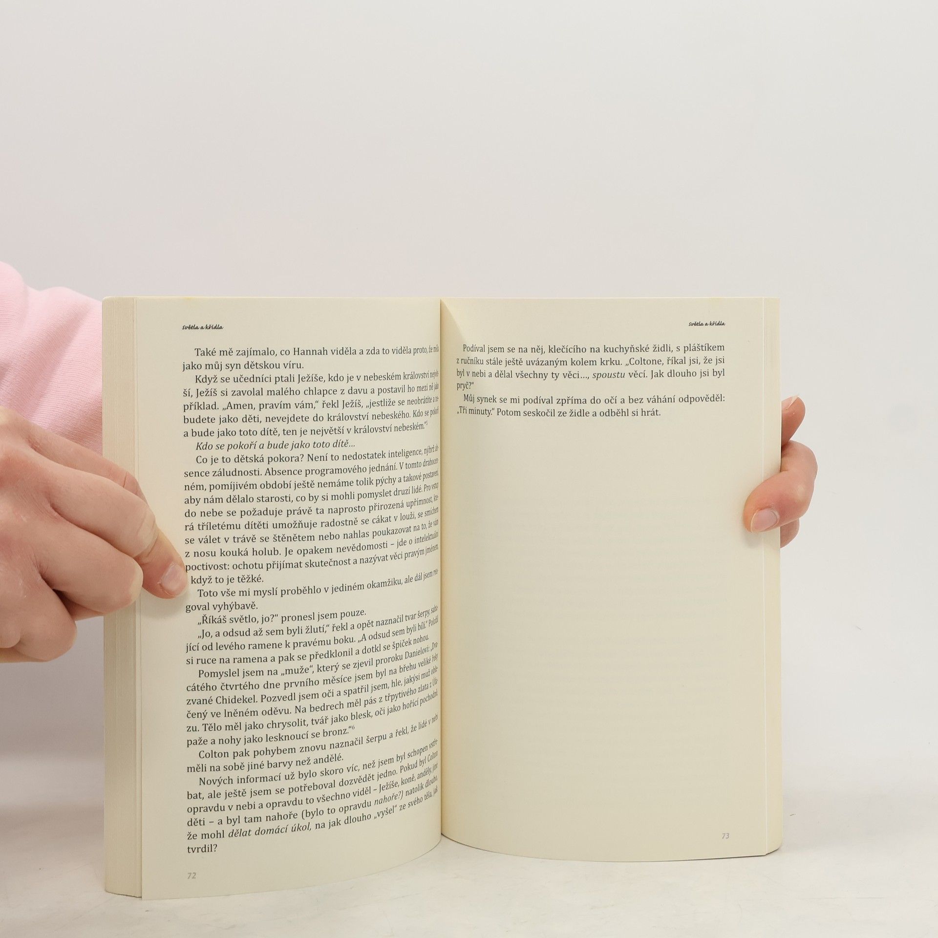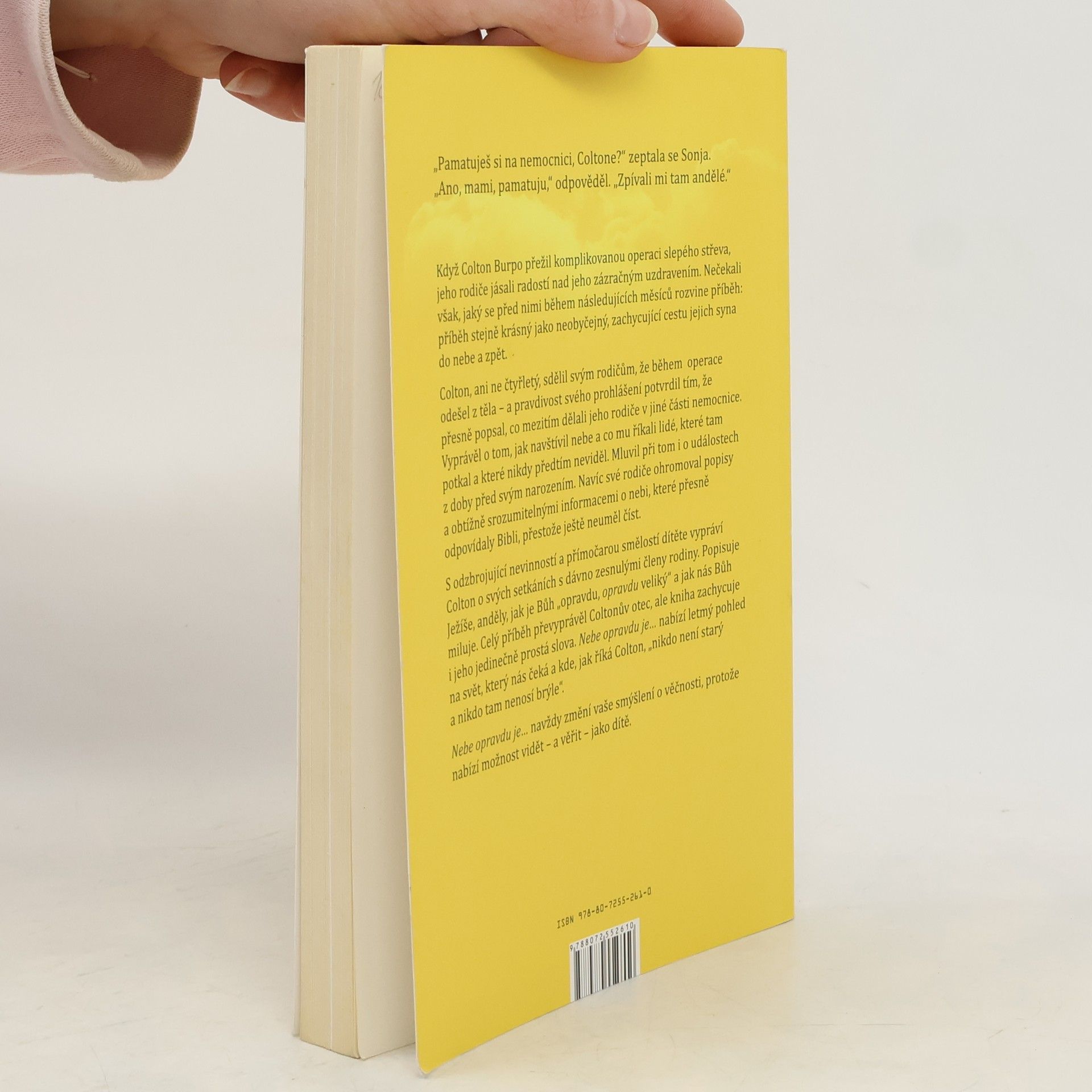 Neuvěřitelné vyprávění o cestě malého chlapce do nebe a zpět Když Colton Burpo přežil komplikovanou operaci slepého střeva, jeho rodiče jásali radostí nad jeho zázračným uzdravením. Nečekali však, jaký se před nimi během následujících měsíců rozvine příběh: příběh stejně krásný jako neobyčejný, zachycující cestu jejich syna do nebe a zpět. Colton, ani ne čtyřletý, sdělil svým rodičům, že během operace odešel z těla - a pravdivost svého prohlášení potvrdil tím, že přesně popsal, co mezitím dělali jeho rodiče v jiné části nemocnice. Vyprávěl o tom, jak navštívil nebe a co mu říkali lidé, které tam potkal a které nikdy předtím neviděl. Mluvil při tom i o událostech z doby před svým narozením. Navíc své rodiče ohromoval popisy a obtížně srozumitelnými informacemi o nebi, které přesně odpovídaly Bibli, přestože ještě neuměl číst. S odzbrojující a přímočarou smělostí dítěte vypráví Colton o svých setkáních s dávno zesnulými členy rodiny. Popisuje Ježíše, anděly, jak je Bůh "opravdu, opravdu veliký" a jak nás Bůh miluje. Celý příběh převyprávěl Coltonův otec, ale kniha zachycuje i jeho jedinečně prostá slova. Nebe opravdu je... nabízí letmý pohled na svět, který nás čeká a kde, jak říká Colton, "nikdo není starý a nikdo tam nenosí brýle". Nebe opravdu je... navždy změní vaše smýšlení o věčnosti, protože nabízí možnost vidět - a věřit - jako dítě.