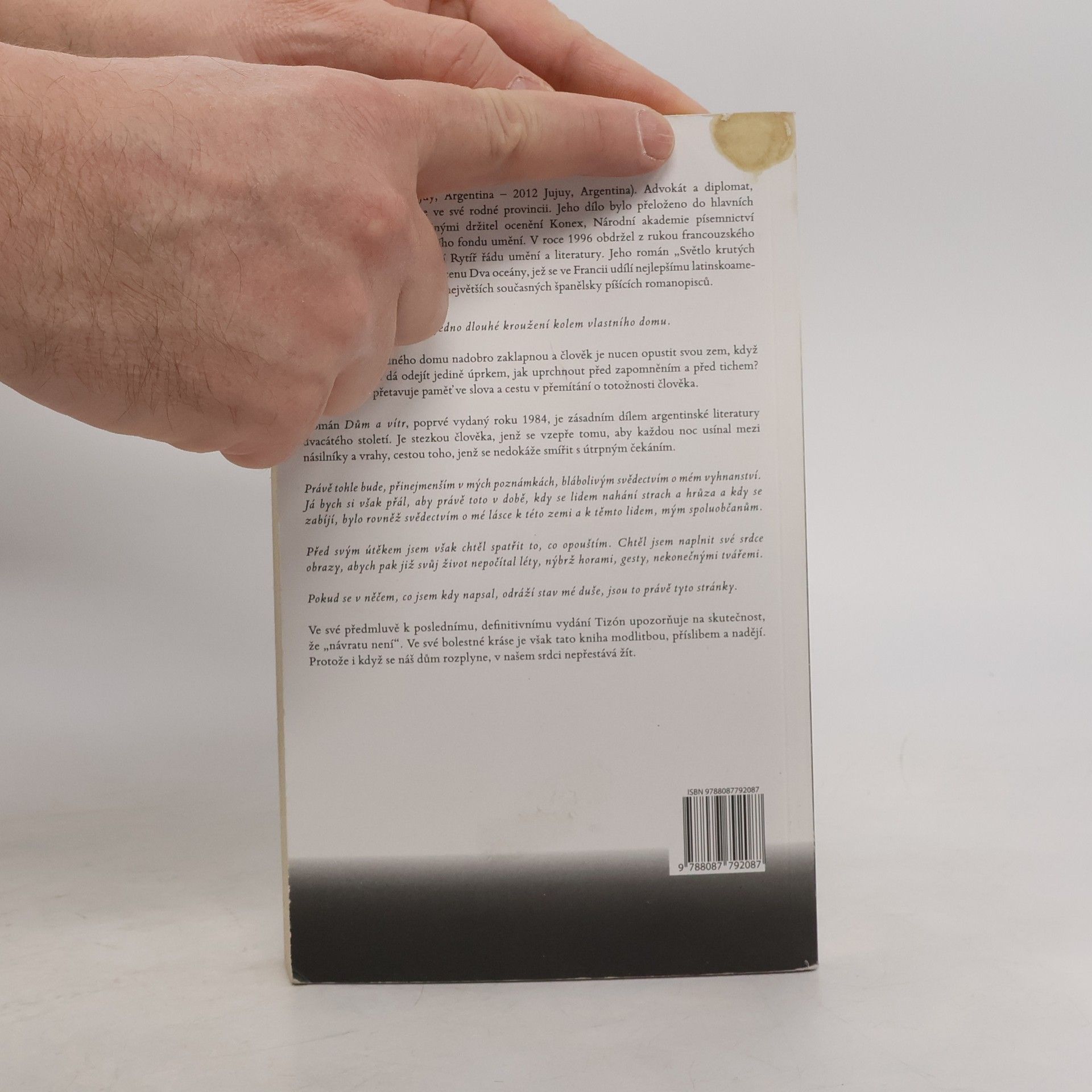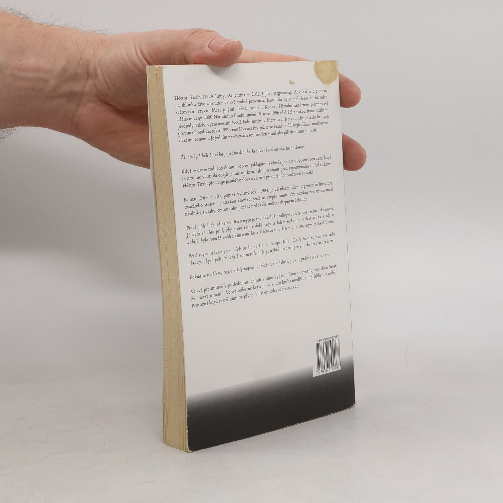 Životní příběh člověka je jedno dlouhé kroužení kolem vlastního domu. Když se dveře rodného domu nadobro zaklapnou a člověk je nucen opustit svou zem, když se z rodné vlasti dá odejít jedině úprkem, jak uprchnout před zapomněním a před tichem? Héctor Tizón přetavuje paměť ve slova a cestu v přemítání o totožnosti člověka. Román Dům a vítr, poprvé vydaný roku 1984, je zásadním dílem argentinské literatury dvacátého století. Je stezkou člověka, jenž se vzepře tomu, aby každou noc usínal mezi násilníky a vrahy, cestou toho, jenž se nedokáže smířit s útrpným čekáním. „Právě tohle bude, přinejmenším v mých poznámkách, blábolivým svědectvím o mém vyhnanství. Já bych si však přál, aby právě toto v době, kdy se lidem nahání strach a hrůza a kdy se zabíjí, bylo rovněž svědectvím o mé lásce k této zemi a k těmto lidem, mým spoluobčanům. Před svým útěkem jsem však chtěl spatřit to, co opouštím. Chtěl jsem naplnit své srdce obrazy, abych pak již svůj život nepočítal léty, nýbrž horami, gesty, nekonečnými tvářemi. Pokud se v něčem, co jsem kdy napsal, odráží stav mé duše, jsou to právě tyto stránky.“ Ve své předmluvě k poslednímu, definitivnímu vydání Tizón upozorňuje na skutečnost, že „návratu není“. Ve své bolestné kráse je však tato kniha modlitbou, příslibem a nadějí. Protože i když se náš dům rozplyne, v našem srdci nepřestává žít.