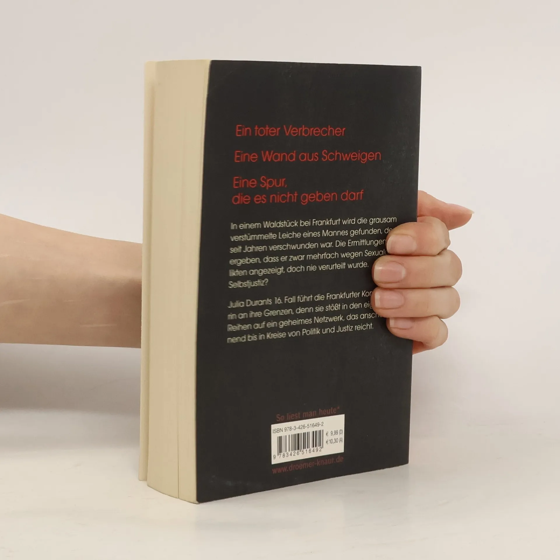 In einem Waldstück bei Frankfurt wird die Leiche eines Sexualstraftäters gefunden, der seit Jahren als vermisst galt. Die Ermittlungen ergeben, dass der Mann zwar mehrfach verdächtigt, doch nie verurteilt wurde. In den Akten tauchen immer wieder derselbe Richter und dieselben Anwälte auf – Zufall? Die brutalen Verletzungen des Mordopfers lassen auf ein sehr persönliches Motiv schließen. Und auf große Wut. Und während Julia Durant sich noch mit der Frage herumschlägt, wem sie hier eigentlich zu Gerechtigkeit verhilft, muss sie erkennen, dass ihr der Gegenwind auch aus den eigenen Reihen entgegenschlägt.