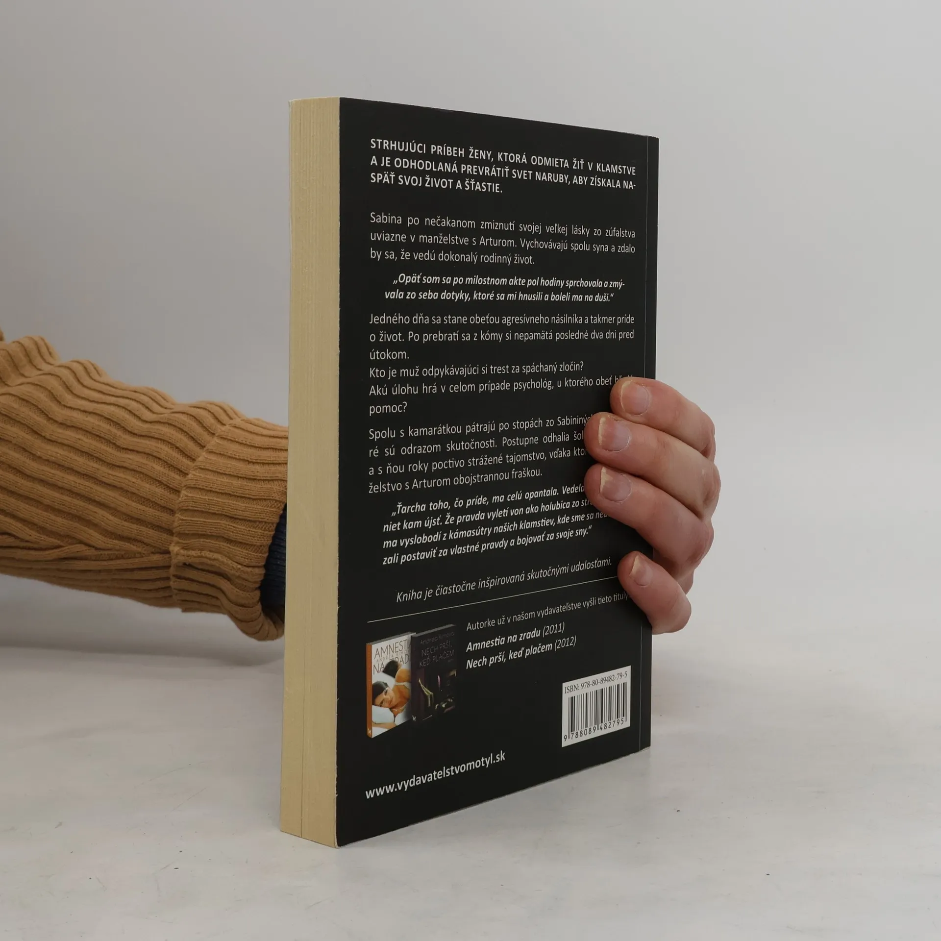 Sabina po nečakanom zmiznutí svojej veľkej lásky zo zúfalstva uviazne v manželstve s Arturom. Vychovávajú spolu syna a zdalo by sa, že vedú dokonalý rodinný život. „Opäť som sa po milostnom akte pol hodiny sprchovala a zmývala zo seba dotyky, ktoré sa mi hnusili a boleli ma na duši.“ Jedného dňa sa stane obeťou agresívneho násilníka a takmer príde o život. Po prebratí sa z kómy si nepamätá posledné dva dni pred útokom. Kto je muž, odpykávajúci si trest za spáchaný zločin? Akú úlohu hrá v celom prípade psychológ, u ktorého obeť hľadá pomoc? Spolu s kamarátkou pátrajú po stopách zo Sabininých snov, ktoré sú odrazom skutočnosti. Postupne odhalia šokujúcu pravdu a s ňou roky poctivo strážené tajomstvo, vďaka ktorému je manželstvo s Arturom obojstrannou fraškou. „Ťarcha toho, čo príde, ma celú opantala. Vedela som, že už niet kam ujsť. Že pravda vyletí von ako holubica zo strechy. A že ma vyslobodí z kámasútry našich klamstiev, kde sme sa nedokázali postaviť za vlastné pravdy a bojovať za svoje sny.“ Kniha je čiastočne inšpirovaná skutočnými udalosťami.