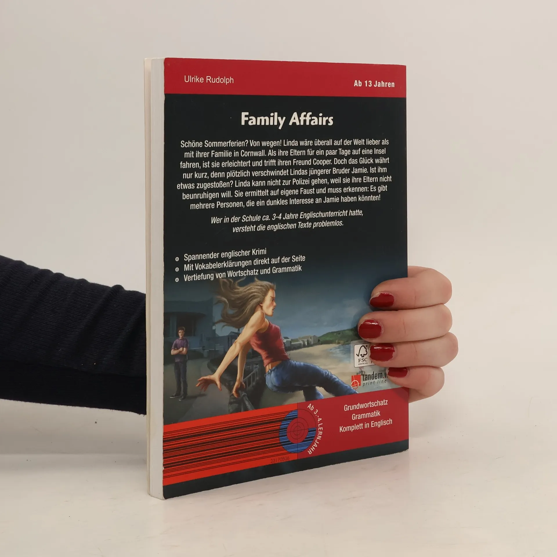 Diese Reihe englischsprachiger Kriminalromane bietet fesselnde Storys und intensives Englisch-Training zugleich. Im Laufe der Handlung sind ca. 100 Lernübungen eingestreut, die der Leser zwischendurch bearbeiten kann. Auf diese Weise wird das Gelesene vertieft und der Lernfortschritt überprüft. Wer in der Schule ca. 3-4 Jahre Englischunterricht hatte, versteht die englischen Texte in diesem Band problemlos. Inhalt: Schöne Sommerferien? Von wegen! Linda wäre überall auf der Welt lieber als mit ihrer Familie in Cornwall. Als ihre Eltern für ein paar Tage auf eine Insel fahren, ist sie erleichtert und trifft ihren Freund Cooper. Doch das Glück währt nur kurz, denn plötzlich verschwindet Lindas jüngerer Bruder Jamie. Linda ermittelt auf eigene Faust und muss erkennen: Es gibt mehrere Personen, die ein dunkles Interesse an Jamie haben könnten! Anspruchsvollere Vokabeln werden am Seitenende übersetzt. Ein Abschlussquiz stellt Fragen zur Handlung. Hier kann der Leser im Selbsttest prüfen, ob er die Handlung verstanden hat. Fremdsprachenkenntnisse auf unterhaltsame Weise verbessern, nach dem Motto: gespannt Krimis lesen – entspannt Englisch lernen.