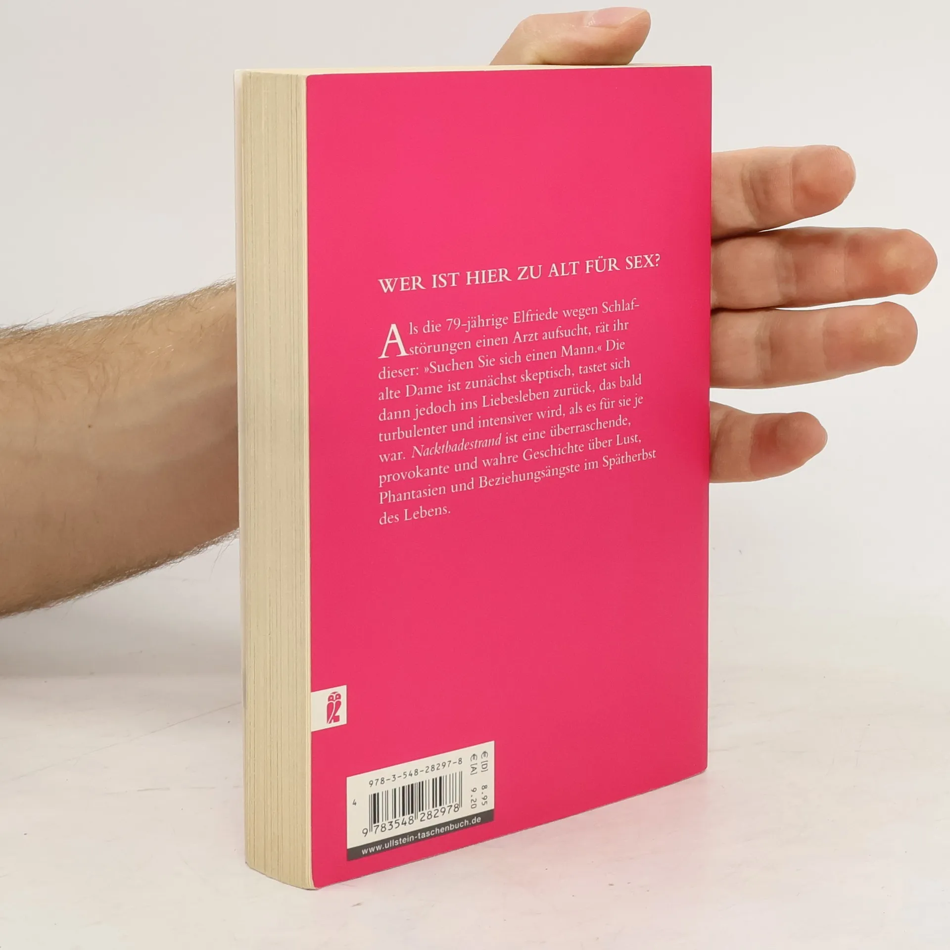 Als die 79-jährige Elfriede wegen Schlafstörungen einen Arzt aufsucht, rät ihr dieser: »Suchen Sie sich einen Mann.« Die alte Dame ist zunächst skeptisch, tastet sich dann jedoch ins Liebesleben zurück, das bald turbulenter und intensiver wird, als es für sie je war. Nacktbadestrand ist eine überraschende, provokante und wahre Geschichte über Lust, Phantasien und Beziehungsängste im Spätherbst des Lebens.
