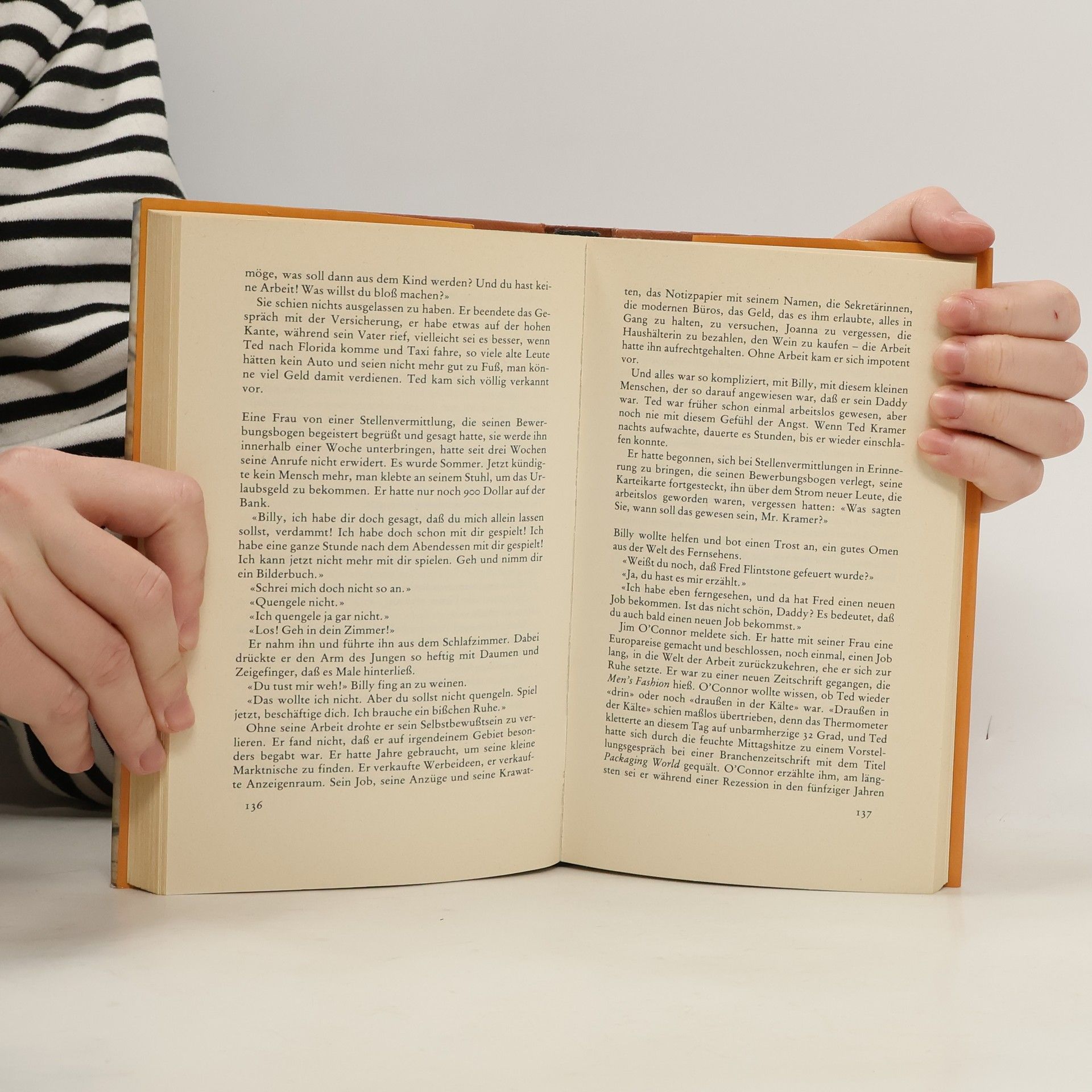Als die Ehefrau von einem Tag auf den anderen das Haus verläßt, um ihren eigenen Weg zu finden, ist der erfolgreiche Werbemanager plötzlich allein mit Kind und Haushalt. Ein Seiltanz zwischen Kinderspielplatz und Büroarbeit, geschäftlichen Verhandlungen und Küchenpflichten beginnt. Bald schon kann Ted Kramer sich ein Leben ohne seinen Sohn gar nicht mehr vorstellen, doch nun möchte die Mutter das Kind zu sich holen, und es entspinnt sich ein dramatisches «Duell» zwischen den Eltern. Avery Corman, dem mit diesem Buch ein Welterfolg gelang, erzählt die zärtliche Liebesgeschichte zwischen einem Vater und seinem kleinen Sohn. Denn Ted, der sich nicht einmal sicher war, ob er das Kind überhaupt wollte, muß erfahren, daß er sich 'ein Leben ohne Billy nicht mehr vorstellen kann.