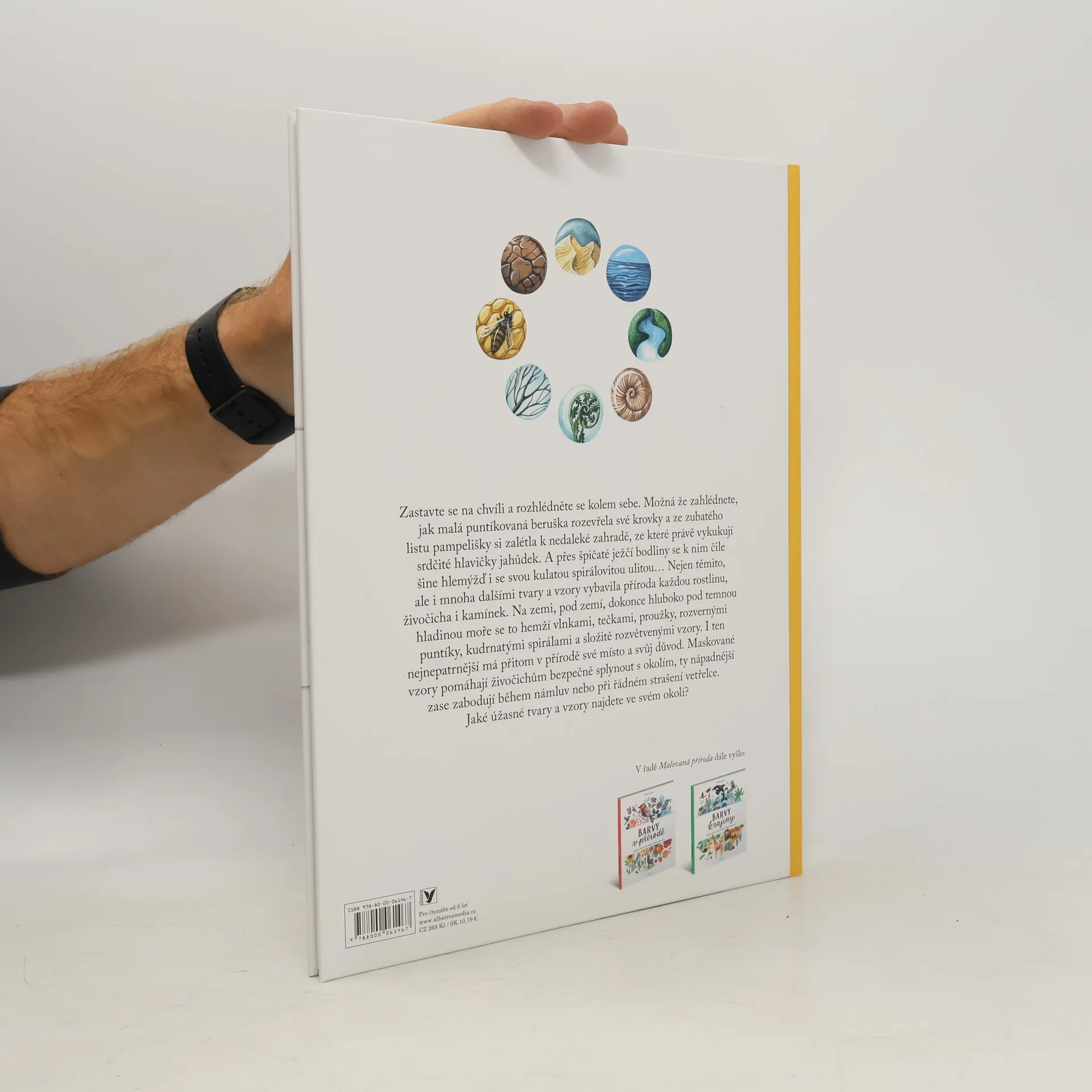 Zastavte se na chvíli a obdivujte pestrobarevné vzory přírody! Zastavte se na chvíli a rozhlédněte se kolem sebe. Možná že zahlédnete puntíkovanou berušku, zubatý lístek pampelišky anebo šnečí ulitu ve tvaru malé spirály... Nejen těmito, ale i mnoha dalšími tvary a vzory vybavila příroda každičkou rostlinu, živočicha nebo kamínek. Na zemi i pod zemí se to hemží vlnkami, tečkami, proužky, rozvernými puntíky, kudrnatými spirálami a složitě rozvětvenými vzory. I ten nejnepatrnější má přitom v přírodě své místo a svůj důvod. Jaké úžasné tvary a vzory najdete ve svém okolí?