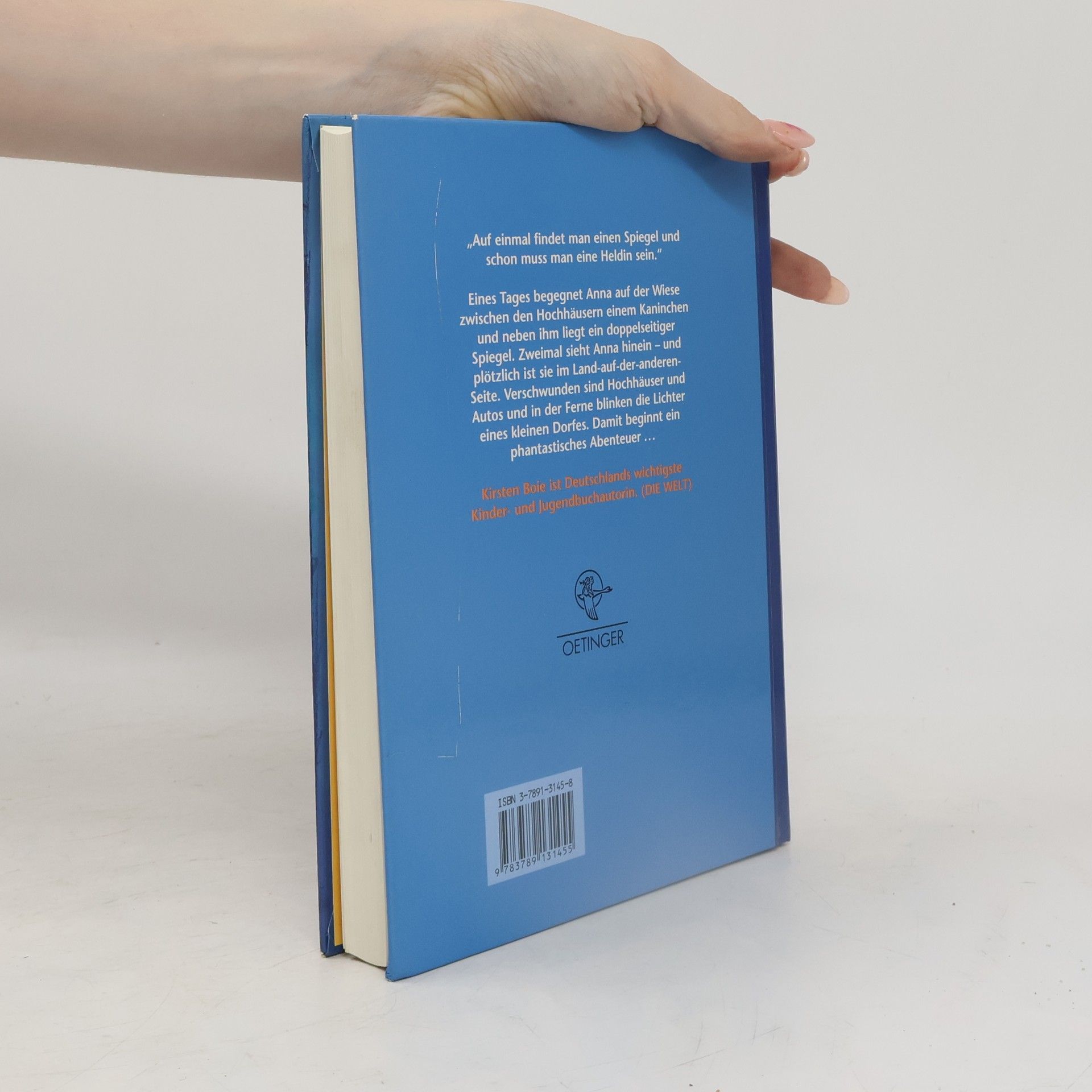 Eines Tages begegnet Anna auf der Wiese zwischen den Hochhäusern einem Kaninchen und neben ihm liegt ein doppelseitiger Spiegel. Zweimal sieht Anna hinein - und plötzlich ist sie im Land-auf-der-anderen-Seite. Verschwunden sind Hochhäuser und Autos, und in der Ferne blinken die Lichter eines kleinen Dorfes. Damit beginnt ein Abenteuer, das Anna später manchmal so gerne erzählen möchte, dass sie fast zerspringt - aber natürlich glaubt ihr niemand. Das Kaninchen nämlich sollte den Kühnen Kämpfer finden, den Einzigen, der Evil den Fürchterlichen besiegen kann. Aber unterwegs hat es seinen Plan verloren; und so holt es nun Anna, die zehn Jahre alt ist und nicht mal sehr groß für ihr Alter und auch nicht besonders mutig. Und plötzlich ist sie Der-durch-den-Spiegel-kommt, der Held, der das Land befreien soll. Bis zuletzt bleibt offen, ob Anna wirklich die Falsche ist. Kirsten Boie hat einen modernen phantastischen Roman geschrieben - spannend und zauberhaft. Aber mit einer Heldin, die eigentlich gar keine ist. Oder doch?