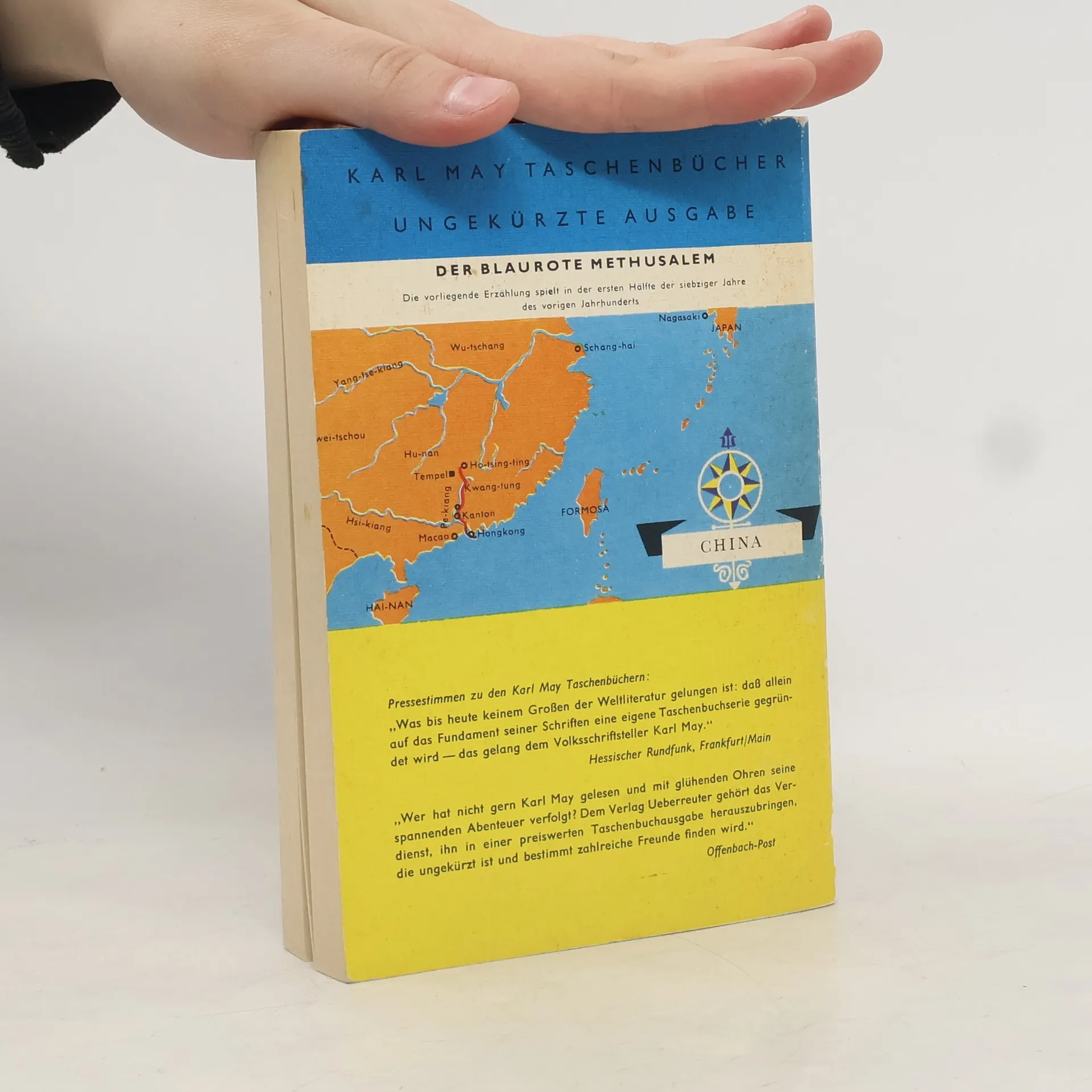 Der blaurote Methusalem ist eine der urwüchsigen Gestalten Karl Mays, der den Leser in das Reich der Mitte führt. Zwischen Dieben, die Götterbilder stehlen, Beamten, die gegen klingende Münze einsperren und wieder laufenlassen, und gefährlichen Dschunkenpiraten spielt sich das Geschehen ab