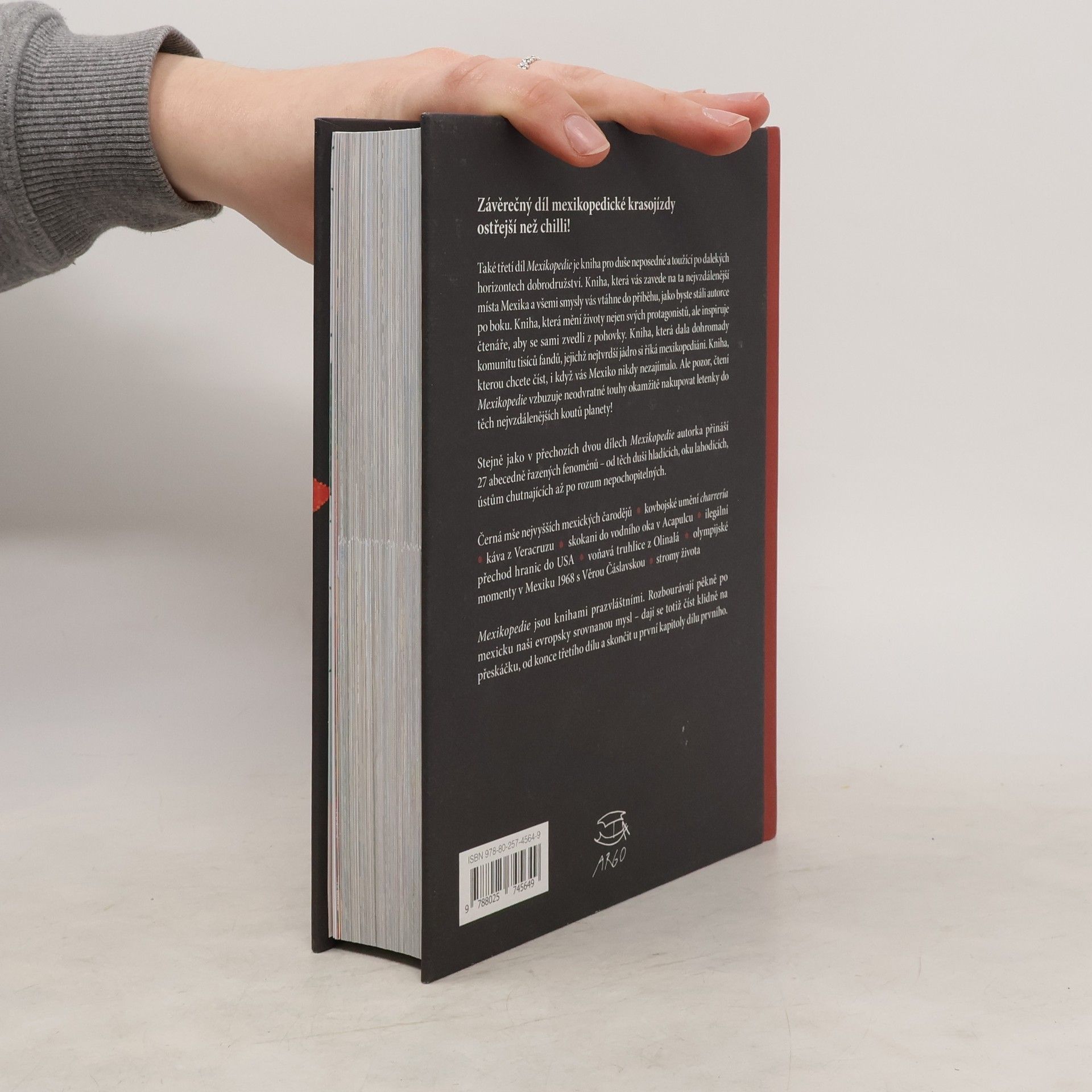 Také třetí díl Mexikopedie je kniha pro duše neposedné a toužící po dalekých horizontech dobrodružství. Kniha, která vás zavede na ta nejvzdálenější místa Mexika a všemi smysly vás vtáhne do příběhu, jako byste stáli autorce po boku. Kniha, která mění životy nejen svých protagonistů, ale inspiruje čtenáře, aby se sami zvedli z pohovky. Kniha, která dala dohromady komunitu tisíců fandů Mexika, jejichž nejtvrdší jádro si říká mexikopediáni. Kniha, kterou chcete číst, i když vás Mexiko nikdy nezajímalo. Ale pozor, čtení Mexikopedie vzbuzuje neodvratné touhy okamžitě nakupovat letenky do těch nejvzdálenějších koutů planety! Stejně jako v přechozích dvou dílech Mexikopedie autorka přináší 27 abecedně řazených fenoménů: například přijdeme na kloub kouzlu kovbojského umění charrería, ochutnáme tu nejvoňavější kávu z Veracruzu, dech se nám zatají při nebezpečných skocích do vodního oka v Acapulcu nebo najdeme poklad ve voňavé truhlici z Olinalá.