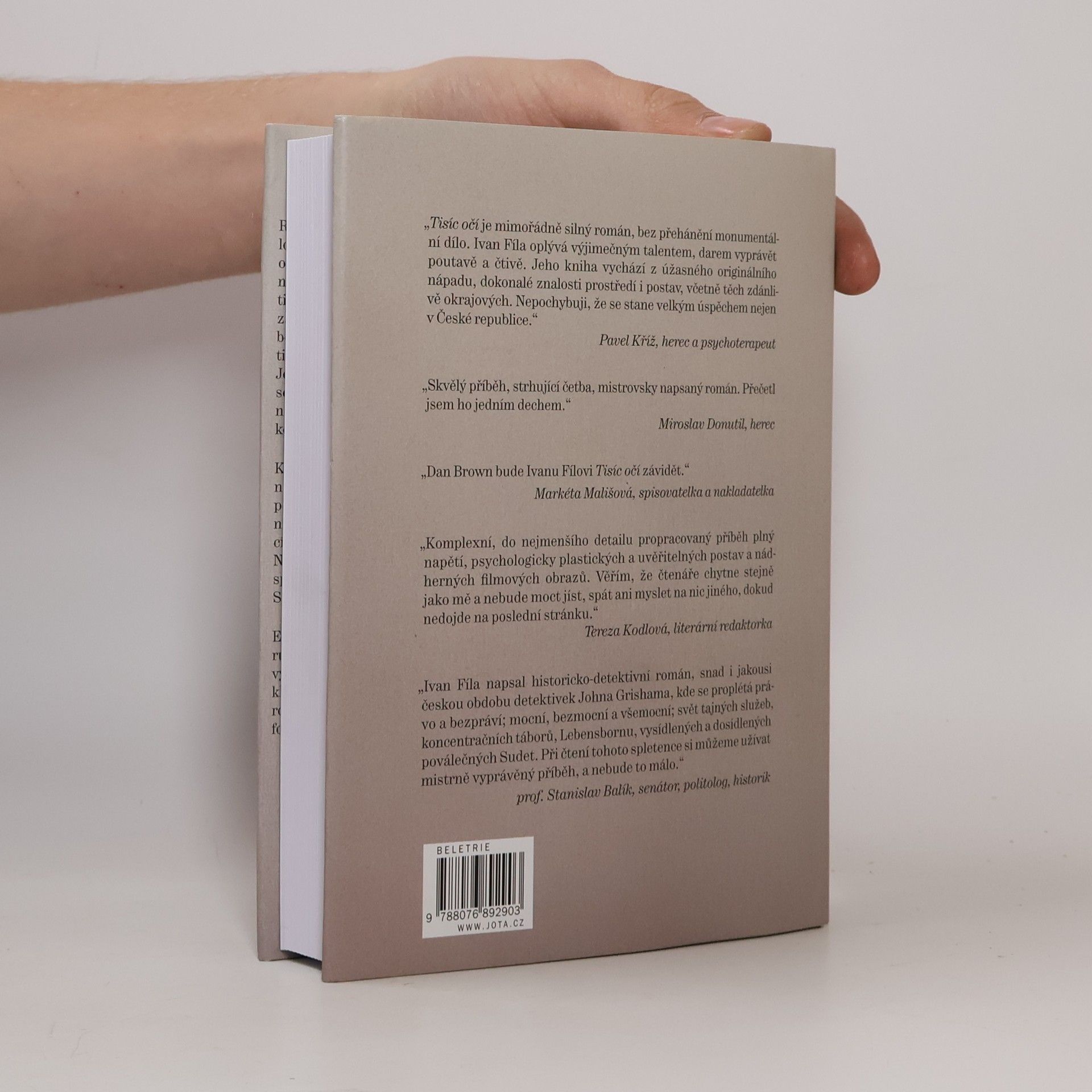 Román Ivana Fíly Tisíc očí, inspirovaný skutečnými událostmi, je příběh téměř detektivní, napínavá rodinná sága z období od druhé světové války až po dnešek. Hlavní hrdinka, oběť zrůdného nacistického programu Lebensborn, hledá čtyřicet let svou biologickou matku a také sebe sama. S pomocí bývalého soudce se dostane na stopu válečného zločince, pozdějšího agenta STB, který si pod falešnou identitou užívá zdánlivě spokojené stáří v Jeseníkách. Neobvykle čilý a vitální muž zprvu netuší, proč za ním žena přišla, a co od něj chce. Až když ho osloví přezdívkou, na kterou slyšel v koncentračním táboře Mauthausen, kde rozhodoval o životě a smrti tisíce týraných obětí, pochopí, že minulost dohnala i jeho. Jak ale potrestat osmadevadesátiletého muže, který už nežije pro radost, ale za trest? A také jak potvrdit nebo vyvrátit teorii, že v každém z nás je potenciální vrah? Fílovo existenciální drama s prvky mystického thrilleru z temného moravskoslezského severu, Berlína a Porúří se svým originálním vypravěčským stylem vymyká jakékoli jednoznačnosti a žánrovému klišé.