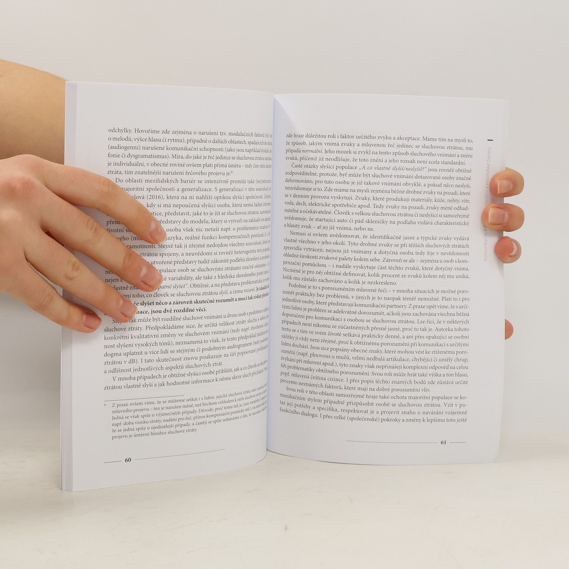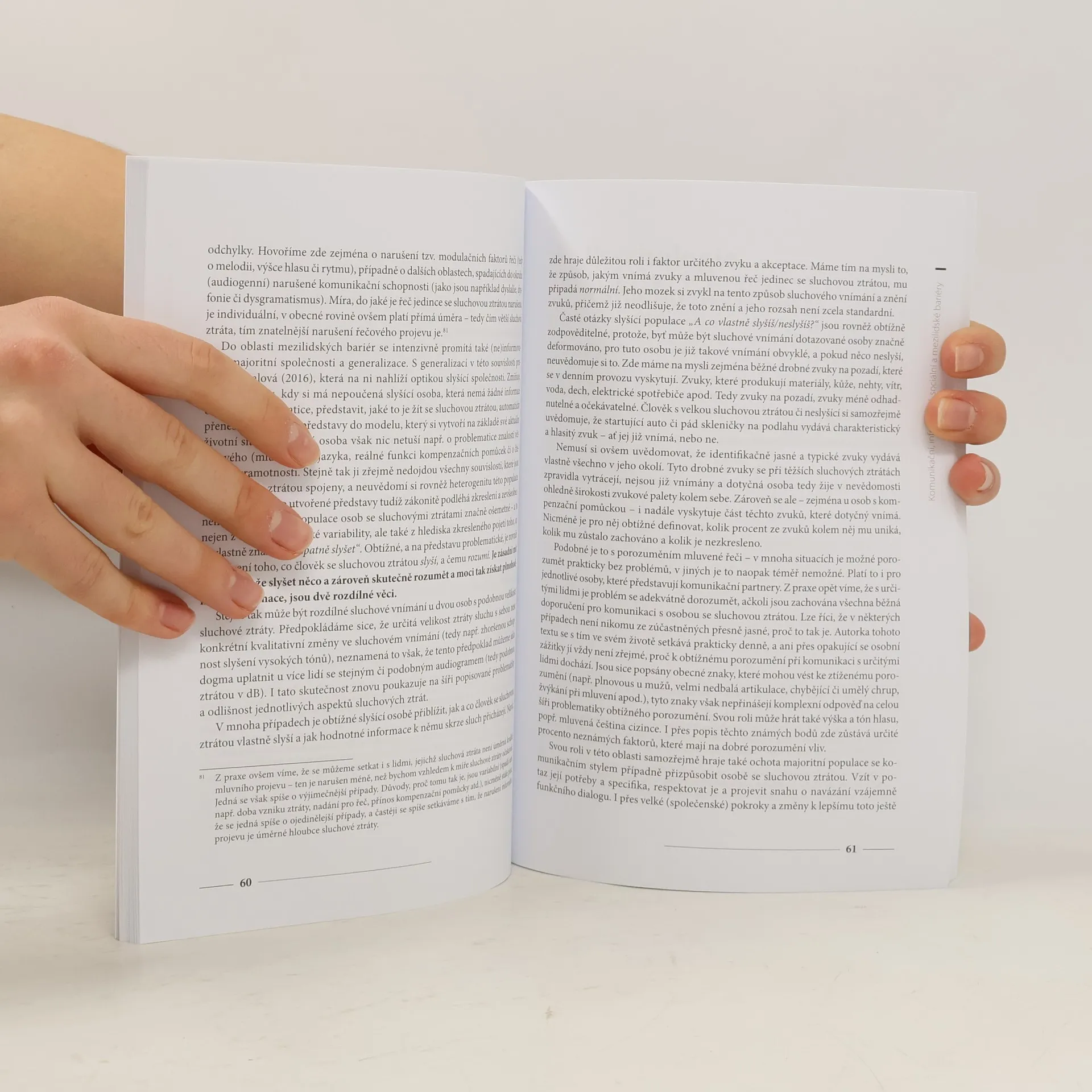 Publikace čtenáře provede aspekty zajímavých oblastí propojených s tematikou sluchového postižení či sluchové ztráty a nabídne vysvětlení spletité problematiky různých typů sluchového postižení. Pomůže nahlédnout do života osob s tímto postižením a nastínit témata týkající se jejich existence ve slyšícím světě.