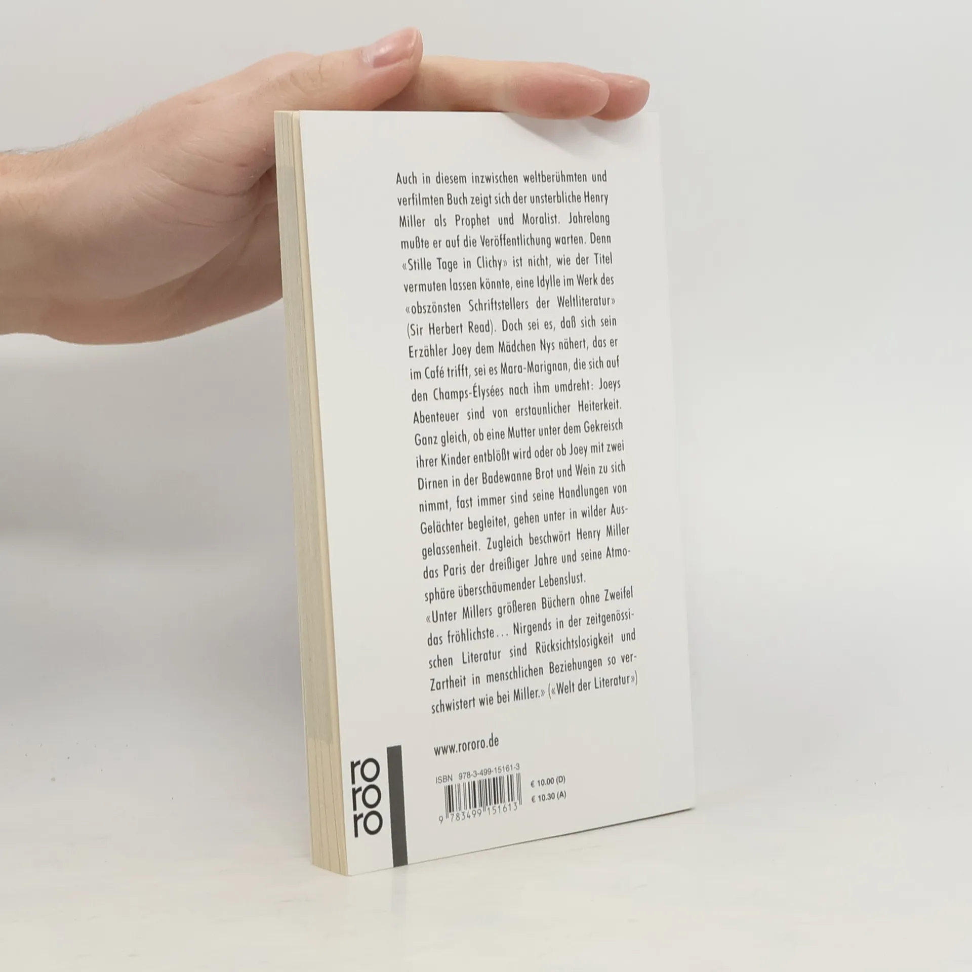 Auch in diesem inzwischen weltberühmten und verfilmten Buch zeigt sich der unsterbliche Henry Miller als Prophet und Moralist. Jahrelang musste er auf die Veröffentlichung warten. Denn «Stille Tage in Clichy» ist nicht, wie der Titel vermuten lassen könnte, eine Idylle im Werk des „obszönsten Schriftstellers der Weltliteratur“ (Sir Herbert Read). Doch sei es, dass sich sein Erzähler Joey dem Mädchen Nys nähert, das er im Café trifft, sei es Mara-Marignan, die sich auf dem Champs-Élysées nach ihm umdreht: Joeys Abenteuer sind von erstaunlicher Heiterkeit. Ganz gleich, ob eine Mutter unter dem Gekreisch ihrer Kinder entblößt wird oder ob Joey mit zwei Dirnen in der Badewanne Brot und Wein zu sich nimmt, fast immer sind seine Handlungen von Gelächter begleitet, gehen unter in wilder Ausgelassenheit. Zugleich beschwört Henry Miller das Paris der dreißiger Jahre und seiner Atmosphäre überschäumender Lebenslust.