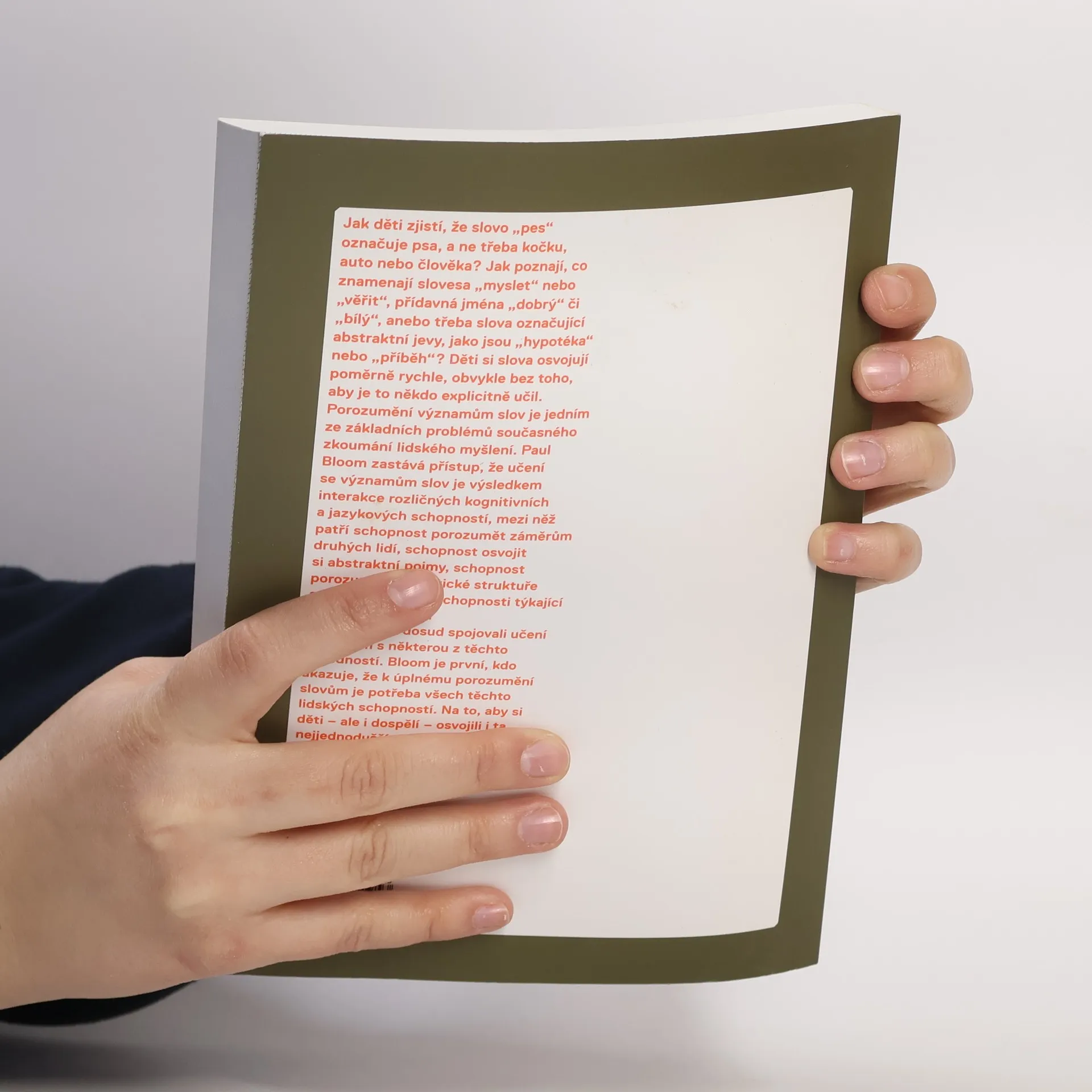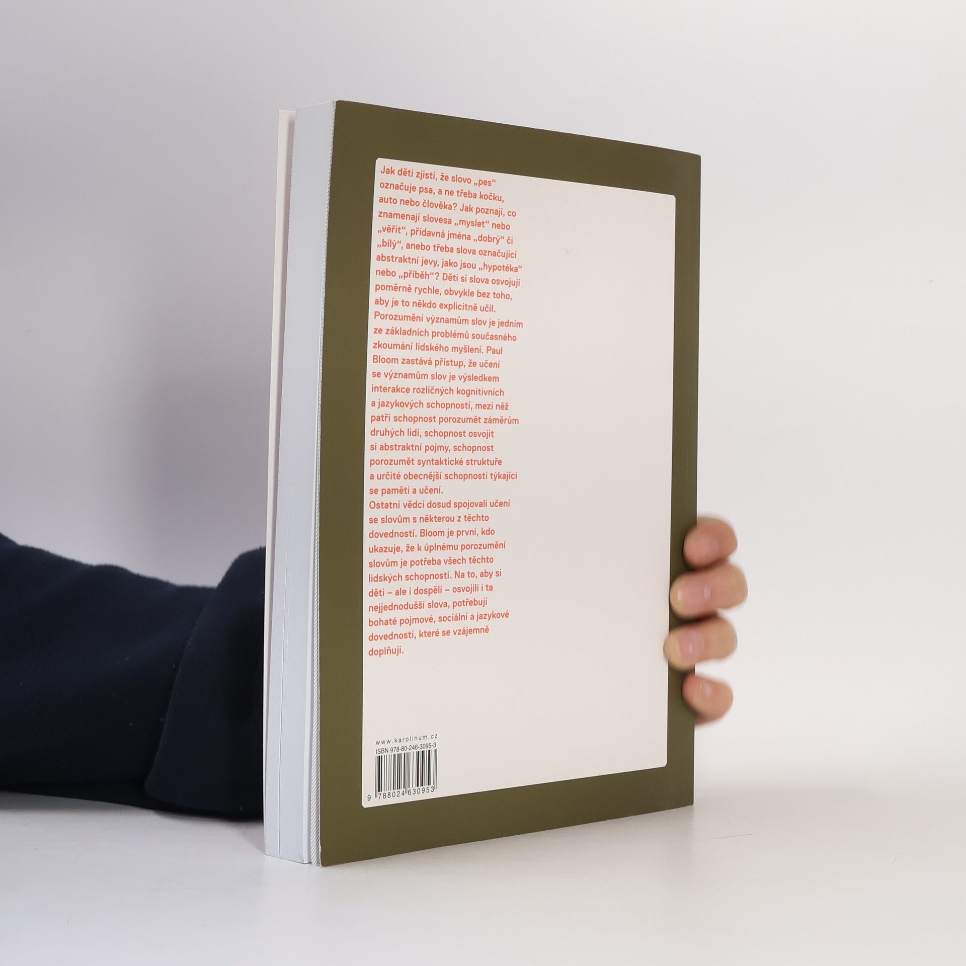Jak děti zjistí, že slovo „pes“ označuje psa a ne třeba kočku, auto anebo člověka? Jak poznají, co znamenají slovesa „myslet“ nebo „věřit“, přídavná jména „dobrý“ či „bílý“, anebo třeba slova označující abstraktní jevy, jako jsou „hypotéka“ nebo „příběh“? Děti si slova osvojují poměrně rychle, obvykle bez toho, aby je to někdo explicitně učil. Porozumění významům slov je jedním ze základních problémů současného zkoumání lidského myšlení. Paul Bloom zastává přístup, že učení se významům slov je výsledkem interakce rozličných kognitivních a jazykových schopností, mezi něž patří schopnost porozumět záměrům druhých lidí, schopnost osvojit si abstraktní pojmy, schopnost porozumět syntaktické struktuře a určité obecnější schopnosti týkající se paměti a učení. Ačkoli ostatní vědci dosud spojovali učení se slovům s některou z těchto dovedností, Bloom je první, kdo ukazuje, že k úplnému porozumění slovům je potřeba všech těchto lidských schopností. Na to, aby si děti – ale i dospělí – osvojili i ta nejjednodušší slova, potřebují bohaté pojmové, sociální a jazykové dovednosti, které se vzájemně doplňují.