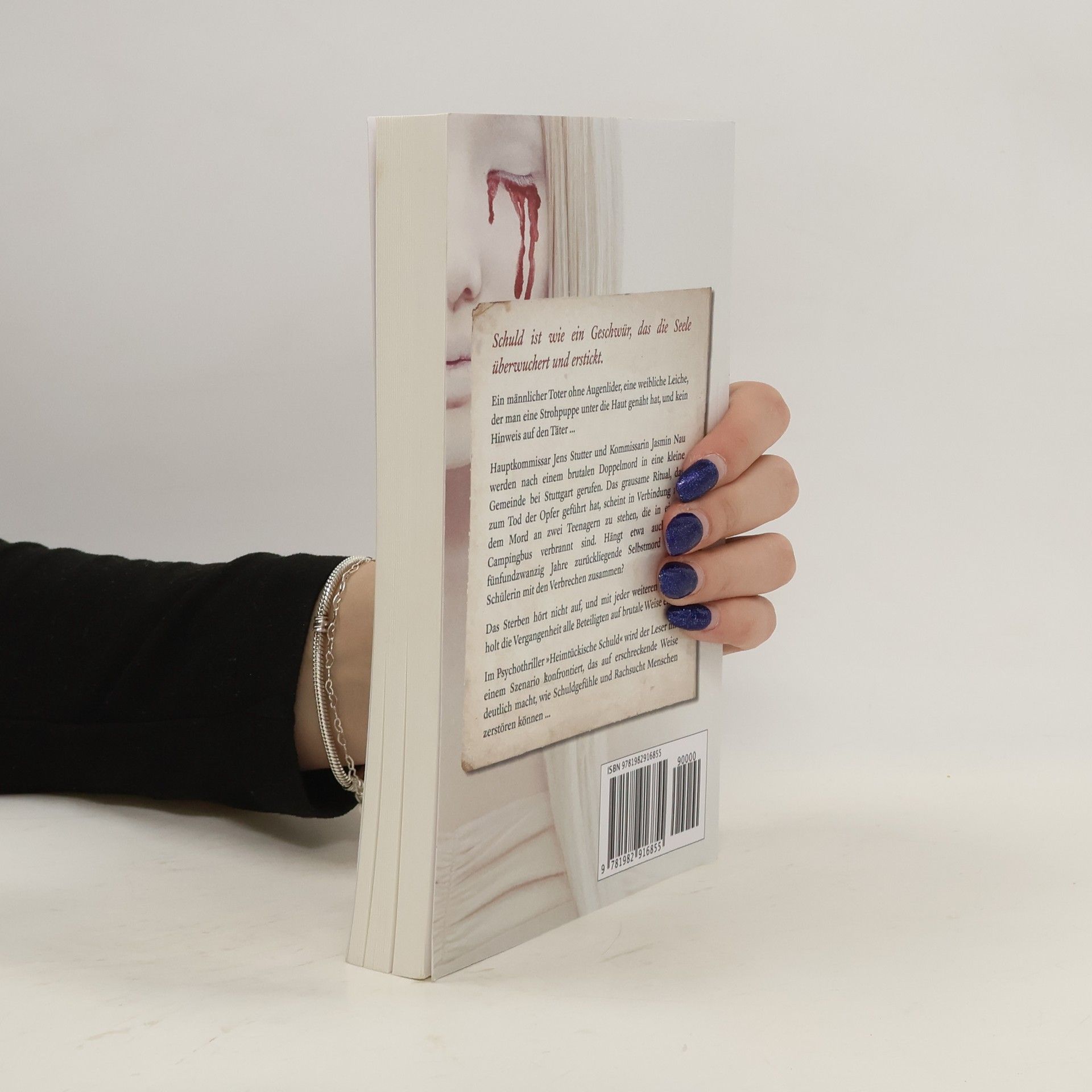 Schuld ist wie ein Geschwür, das die Seele überwuchert und erstickt. Ein männlicher Toter ohne Augenlider, eine weibliche Leiche mit einer Strohpuppe unter der Haut und kein Hinweis auf den Täter – Hauptkommissar Jens Stutter und Kommissarin Jasmin Nau werden nach einem brutalen Doppelmord in eine kleine Gemeinde bei Stuttgart gerufen. Das grausame Ritual, das zum Tod der Opfer führte, scheint mit dem Mord an zwei Teenagern in Verbindung zu stehen, die in einem Campingbus verbrannt sind. Hängt auch der fünfundzwanzig Jahre zurückliegende Selbstmord einer Schülerin mit den Verbrechen zusammen? Das Sterben hört nicht auf, und mit jeder weiteren Leiche holt die Vergangenheit alle Beteiligten brutal ein. In diesem Psychothriller wird der Leser mit einem Szenario konfrontiert, das auf erschreckende Weise zeigt, wie Schuldgefühle und Rachsucht Menschen zerstören können. Weitere Titel der Reihe sind »Blutmosaik«, »Der Sündenfänger«, »Verdorbene Ernte«, »Bitterblutige Wahrheit«, »Ufer der Angst«, »Schmutzige Tränen«, »Lautloser Hass«, sowie verschiedene Thriller und Kurzgeschichten, die unabhängig voneinander gelesen werden können.