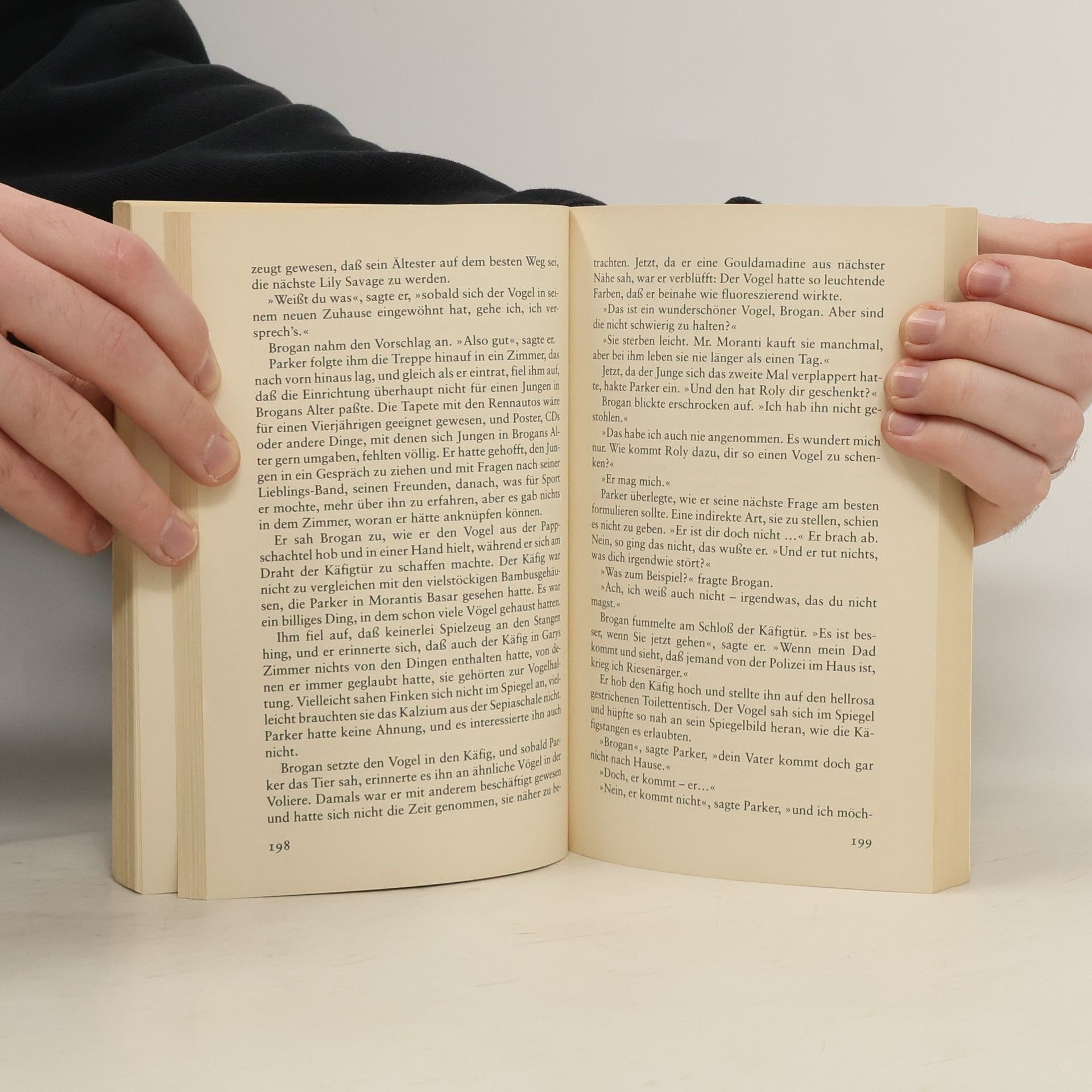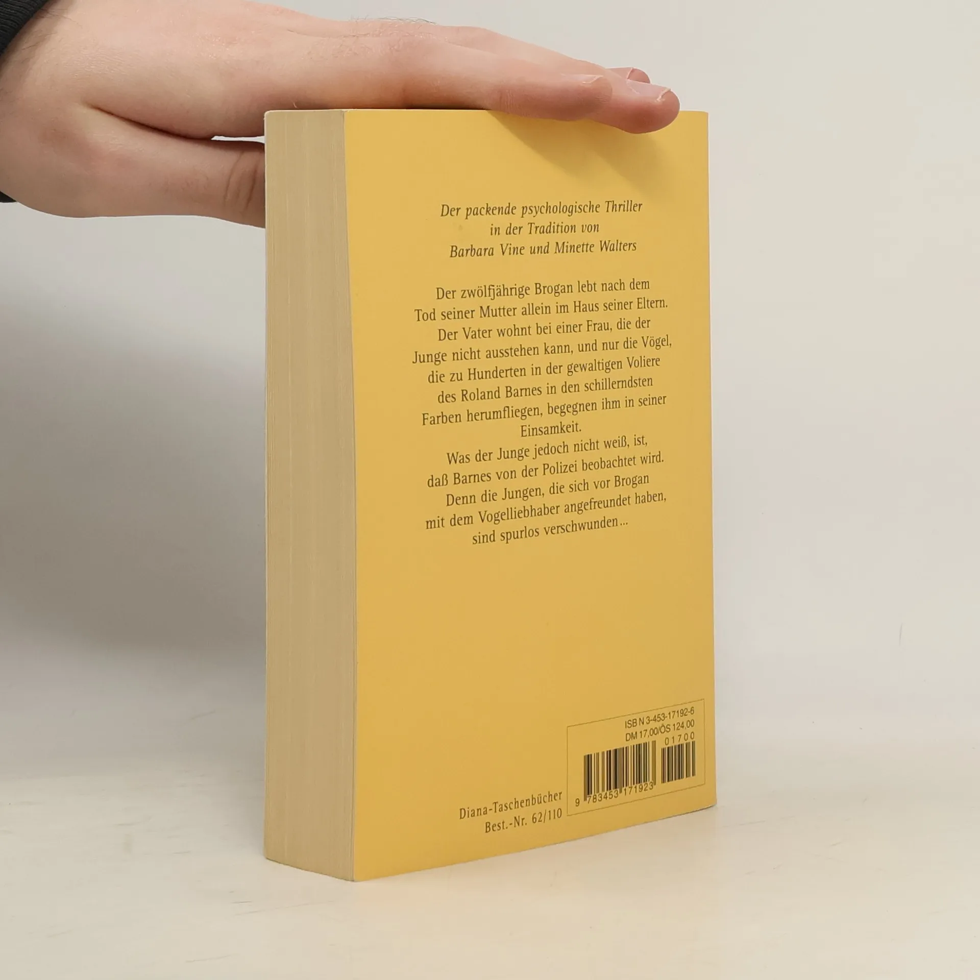Der zwölfjährige Brogan lebt nach dem Tod seiner Mutter allein, denn sein Vater ist zu einer anderen Frau gezogen. In seiner Einsamkeit freundet er sich mit Roland Barnes an, der hunderte von bunt schillernden, exotischen Finken besitzt. Doch Barnes wird von der Polizei beobachtet, denn alle Jungen, die sich mit ihm angefreundet haben, sind spurlos verschwunden. „Spannungs-Meisterin Minette Walters hat endlich Konkurrenz bekommen!“ FREUNDIN