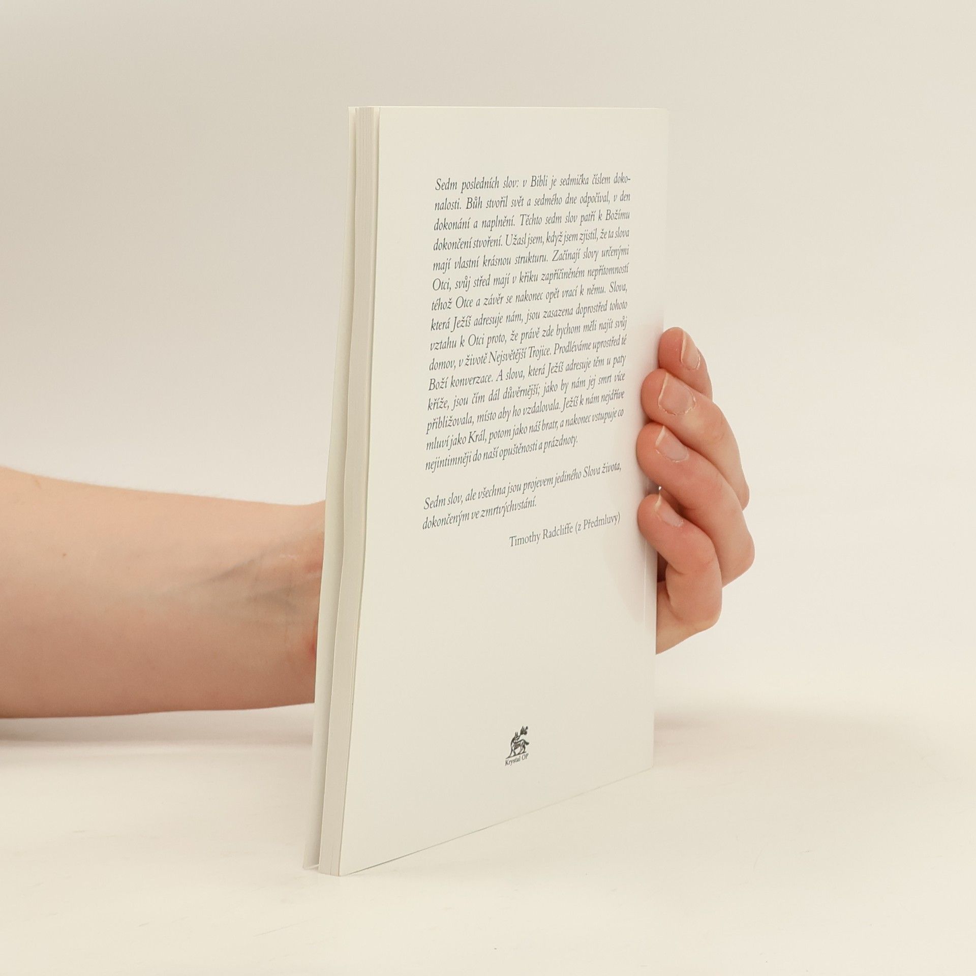 Sedm posledních slov: v Bibli je sedmička číslem dokonalosti. Bůh stvořil svět a sedmého dne odpočíval, v den dokonání a naplnění. Těchto sedm slov patří k Božímu dokončení stvoření. Užasl jsem, když jsem zjistil, že ta slova mají vlastní krásnou strukturu. Začínají slovy určenými Otci, svůj střed mají v křiku zapříčiněném nepřítomností téhož Otce a závěr se nakonec opět vrací k němu. Slova, která Ježíš adresuje nám, jsou zasazena doprostřed tohoto vztahu k Otci proto, že právě zde bychom měli najít svůj domov, v životě Nejsvětější Trojice. Prodléváme uprostřed té Boží konverzace. A slova, která Ježíš adresuje těm u paty kříže, jsou čím dál důvěrnější. Jako by nám jej smrt více přibližovala, místo aby ho vzdalovala. Ježíš k nám nejdříve mluví jako Král, potom jako náš bratr, a nakonec vstupuje co nejintimněji do naší opuštěnosti a prázdnoty. Timothy Radcliffe (z Předmluvy)