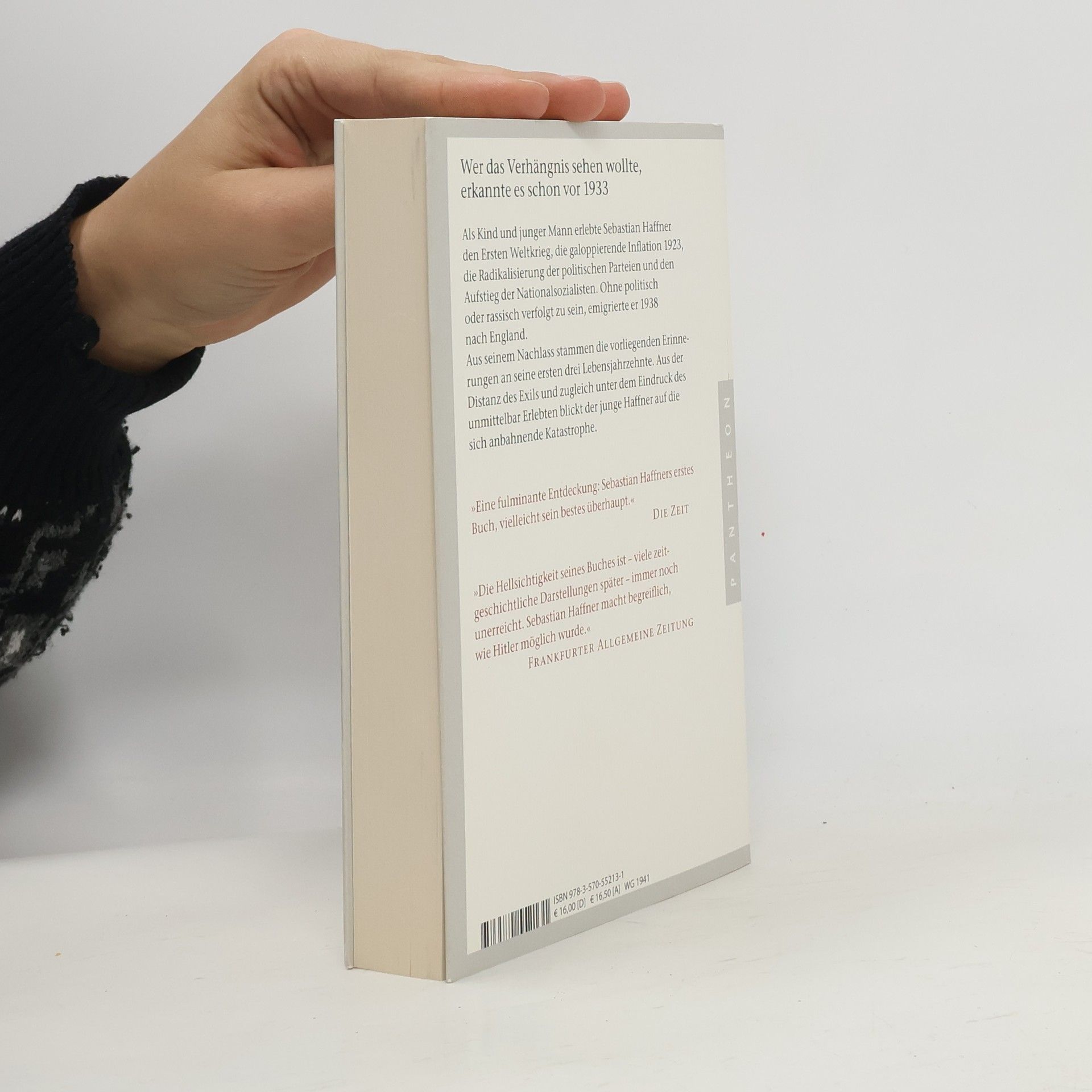 Ein einzigartiges Zeitzeugnis Als Kind und junger Mann erlebte Sebastian Haffner den Ersten Weltkrieg, die galoppierende Inflation 1923, die Radikalisierung der politischen Parteien, den unaufhaltsamen Aufstieg der Nationalsozialisten. Ohne politisch oder rassisch verfolgt zu sein, emigrierte er 1938. Aus dem Nachlass wurden diese Erinnerungen seiner ersten drei Lebensjahrzehnte veröffentlicht, die Haffner 1939 in England zu Papier gebracht hatte. Um zwei neu aufgefundene Manuskriptteile erweiterte Ausgabe.