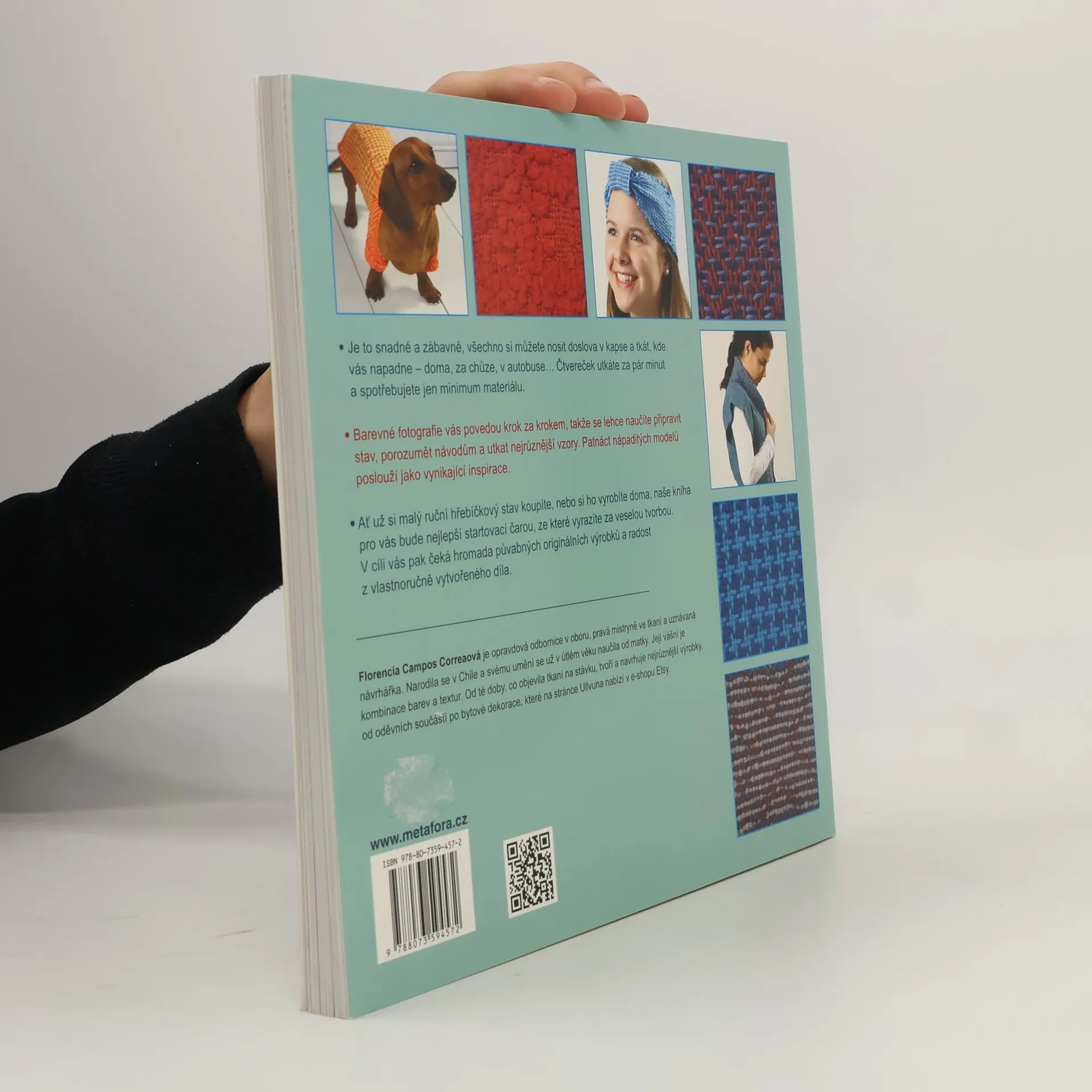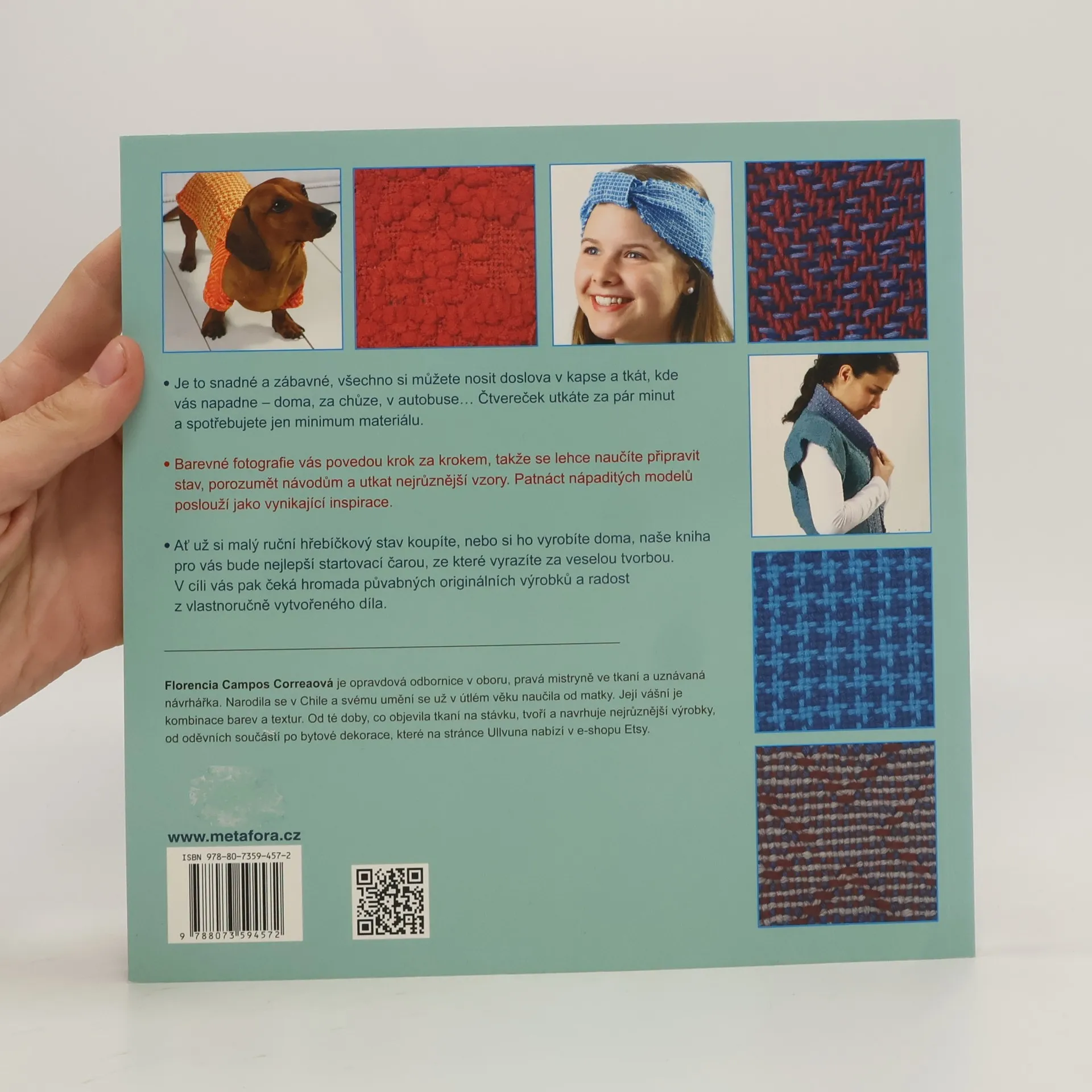Sto tkaných čtverečků a barevných kombinací, originální projekty Je to snadné a zábavné, všechno si můžete nosit doslova v kapse a tkát, kde vás napadne – doma, za chůze, v autobuse... Čtvereček utkáte za pár minut a spotřebujete jen minimum materiálu. Barevné fotografie vás povedou krok za krokem, takže se lehce naučíte připravit stav, porozumět návodům a utkat nejrůznější vzory. Patnáct nápaditých modelů poslouží jako vynikající inspirace. Ať už si malý ruční hřebíčkový stav koupíte, nebo si ho vyrobíte doma, naše kniha pro vás bude nejlepší startovací čarou, ze které vyrazíte za veselou tvorbou. V cíli vás pak čeká hromada půvabných originálních výrobků a radost z vlastnoručně vytvořeného díla.