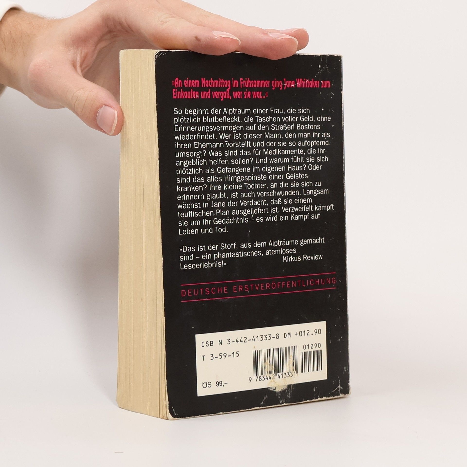 „An einem Nachmittag im Frühsommer ging Jane Whittaker zum Einkaufen und vergaß, wer sie war…“ So beginnt der Alptraum einer Frau, die sich plötzlich blutbefleckt, die Taschen voller Geld und ohne Erinnerungsvermögen auf den Straßen Bostons wiederfindet. Wer ist dieser Mann, den man ihr als ihren Ehemann vorstellt? Was sind das für Medikamente, die ihr angeblich helfen sollen? Und warum fühlt sie sich als Gefangene im eigenen Haus? Verzweifelt kämpft Jane von nun an um ihr Gedächtnis – es wird ein Kampf auf Leben und Tod …