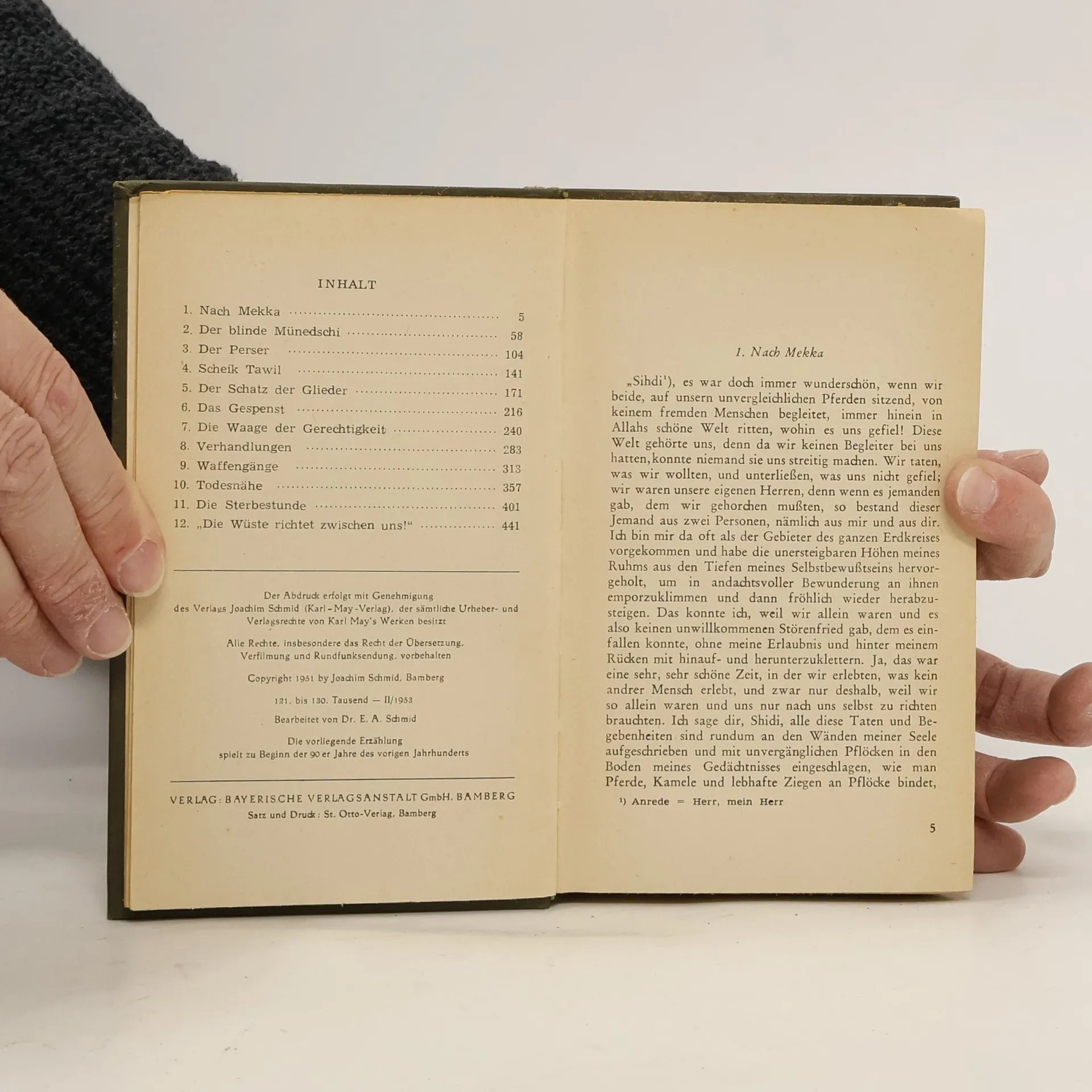 Auf einer Reise durch die arabische Wüste stoßen Kara Ben Nemsi und Hadschi Halef Omar auf einen geheimnisvollen blinden Seher, den ‚Münedschi‘, der von seinem verräterischen Begleiter ‚El Ghani‘ dort hilflos zurückgelassen wurde. Gemeinsam macht man sich auf den Weg Richtung Mekka. Wenig später stellt sich heraus, dass der üble ‚El Ghani‘ zudem den Schatz der heiligen Stätten von Meschhed Ali gestohlen hat. Die Freunde erklären sich bereit, dem Schatzwächter Khutab Aga bei der Jagd nach dem Räuber beizustehen. Ein gefährliches Unterfangen, denn dieser schreckt auch vor Mord nicht zurück. Das Buch markiert den Übergang von der romantischen Abenteuererzählung zu Mays Spätwerk. Besonders eindrucksvoll sind die Visionen vom Jüngsten Gericht gestaltet.
