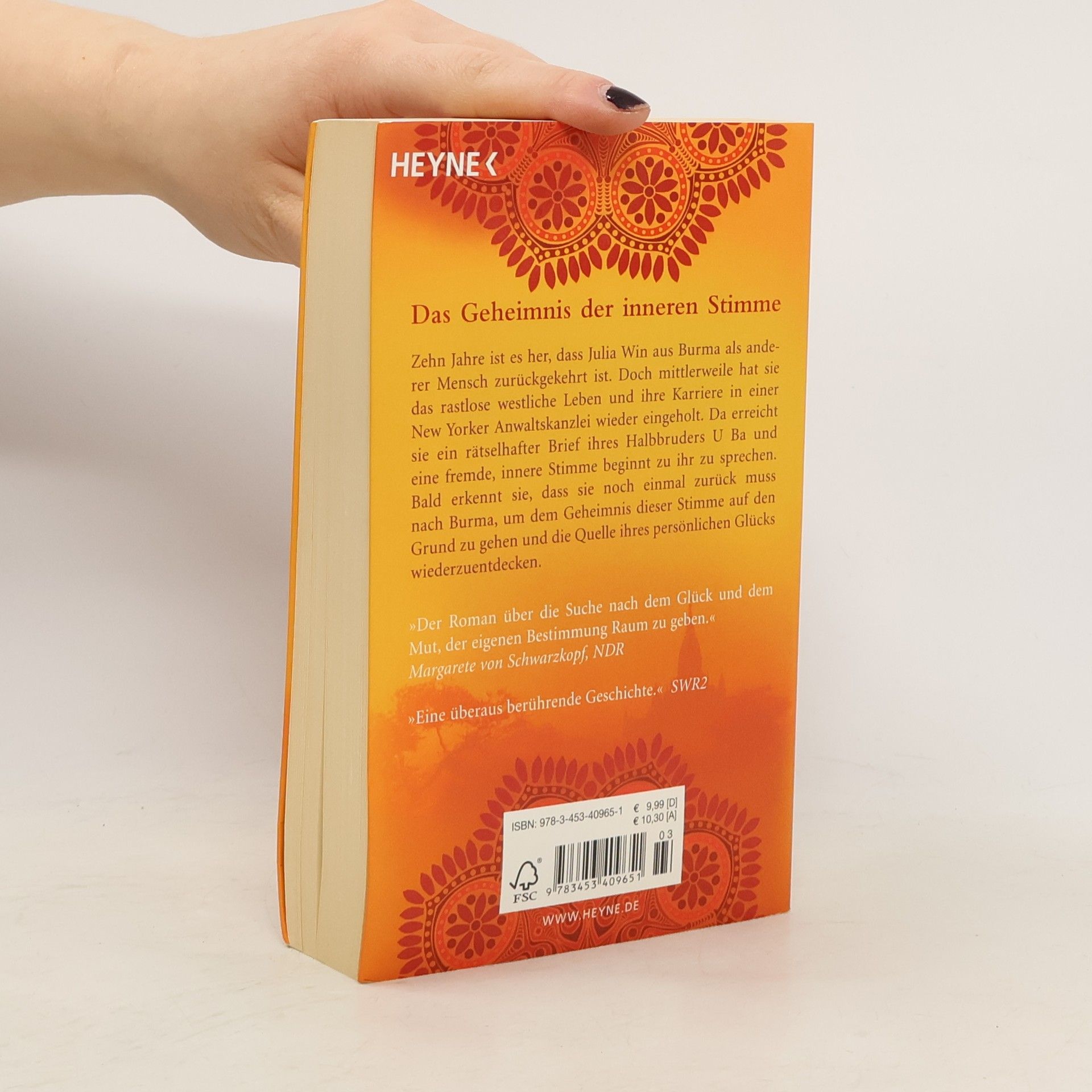 Die Fortsetzung des Bestsellers Zehn Jahre ist es her, dass Julia Win aus Burma als anderer Mensch zurückgekehrt ist. Doch mittlerweile hat sie das rastlose westliche Leben und ihre Karriere in einer New Yorker Anwaltskanzlei wieder eingeholt. Da erreicht sie ein rätselhafter Brief ihres Halbbruders U Ba, und eine fremde, innere Stimme beginnt zu ihr zu sprechen. Bald erkennt sie, dass sie noch einmal zurück muss nach Burma, um dem Geheimnis dieser Stimme auf den Grund zu gehen und die Quelle ihres persönlichen Glücks wiederzuentdecken.