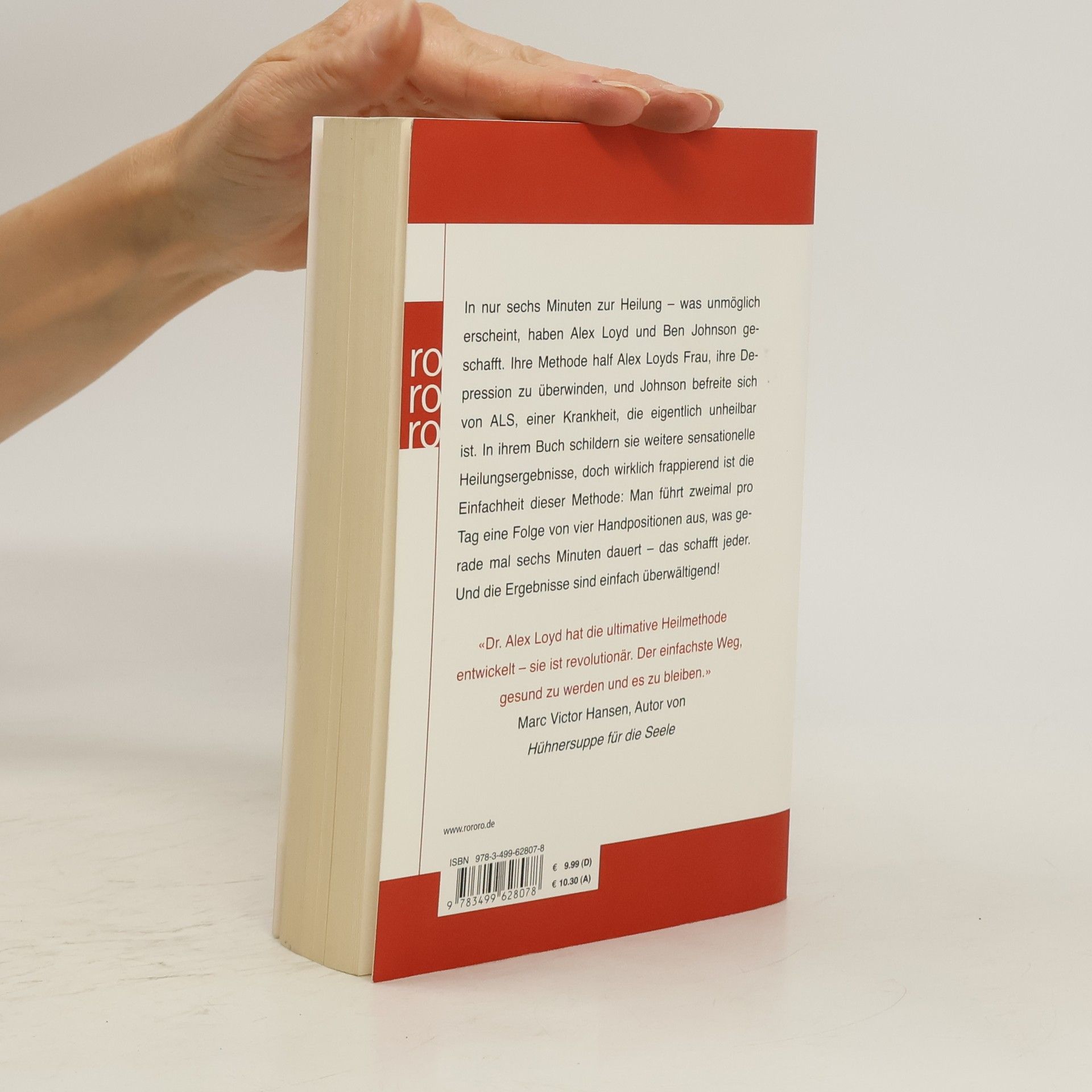 In nur sechs Minuten zur Heilung – was unmöglich erscheint, haben Alex Loyd und Ben Johnson geschafft. Ihre Methode half Alex Loyds Frau, ihre Depression zu überwinden, und Johnson befreite sich von ALS, einer Krankheit, die eigentlich unheilbar ist. In ihrem Buch schildern sie weitere sensationelle Heilungsergebnisse, doch wirklich frappierend ist die Einfachheit dieser Methode: Man führt zweimal pro Tag eine Folge von vier Handpositionen aus, was gerade mal sechs Minuten dauert – das schafft jeder. Und die Ergebnisse sind einfach überwältigend!«Dr. Alex Loyd hat die ultimative Heilmethode entwickelt – sie ist revolutionär. Der einfachste Weg, gesund zu werden und es zu bleiben.» Marc Victor Hansen, Autor von Hühnersuppe für die Seele