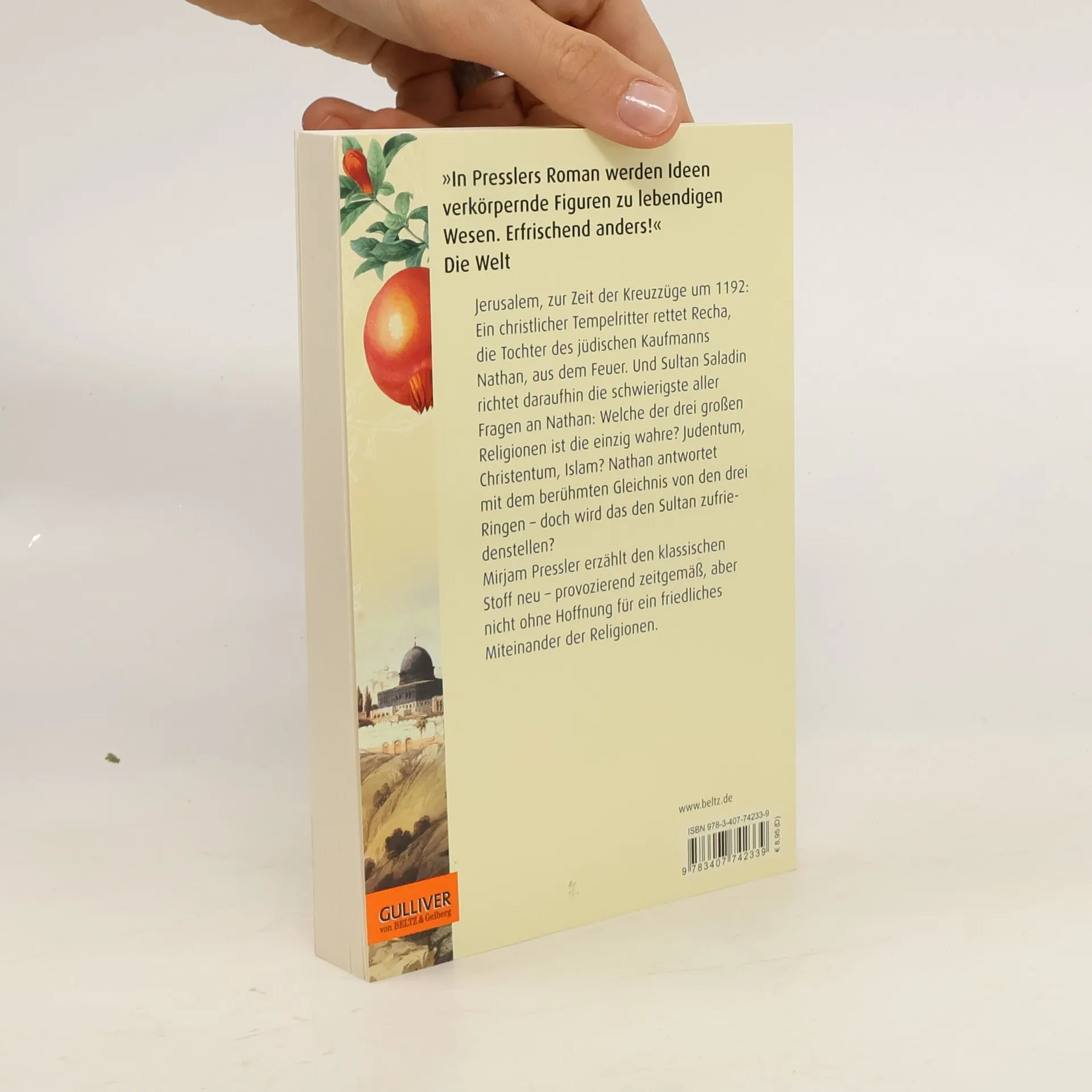 »Ein hochaktuelles, spannendes Buch über Toleranz und die Koexistenz der drei Religionen, die ja bis heute nicht gelingt.« Frankfurter Rundschau Jerusalem, zur Zeit der Kreuzzüge um 1192: Ein junger Tempelritter rettet Recha, die Tochter des jüdischen Kaufmanns Nathan, aus dem Feuer. Daraufhin richtet Sultan Saladin die schwierigste aller Fragen an Nathan: Welche Religion ist die einzig wahre? Nathan antwortet mit dem berühmten Gleichnis von den drei Ringen – doch wird das den Sultan zufriedenstellen? Außerdem ahnt Nathan nicht, dass ihm inzwischen der christliche Patriarch von Jerusalem und ein moslemischer Hauptmann nach dem Leben trachten ... Mirjam Pressler erzählt den klassischen Stoff neu – provozierend zeitgemäß, aber nicht ohne Hoffnung für ein friedliches Nebeneinander der Religionen.