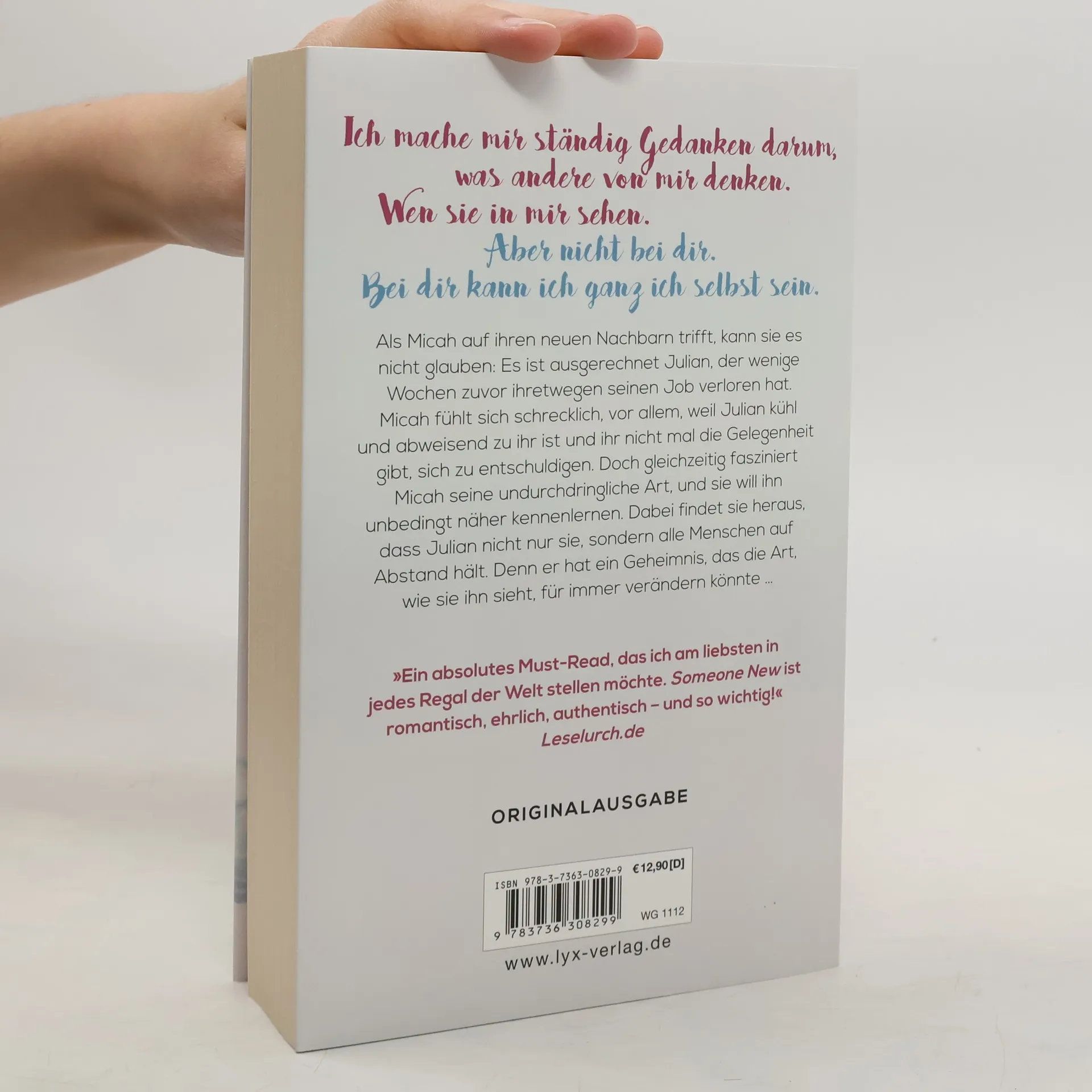 Ich mache mir ständig Gedanken darum, was andere Menschen von mir denken. Wen sie in mir sehen. Aber nicht bei dir. Bei dir kann ich ganz ich selbst sein. Als Micah auf ihren neuen Nachbarn trifft, kann sie es nicht glauben: Es ist ausgerechnet Julian, der wenige Wochen zuvor ihretwegen seinen Job verloren hat. Micah fühlt sich schrecklich, vor allem, weil Julian kühl und abweisend zu ihr ist und ihr nicht mal die Gelegenheit gibt, sich zu entschuldigen. Doch gleichzeitig fasziniert Micah seine undurchdringliche Art, und sie will ihn unbedingt näher kennenlernen. Dabei findet sie heraus, dass Julian nicht nur sie, sondern alle Menschen auf Abstand hält. Denn er hat ein Geheimnis, das die Art, wie sie ihn sieht, für immer verändern könnte ... „Ein absolutes Must-Read, das ich am liebsten in jedes Regal der Welt stellen möchte. Someone New ist romantisch, ehrlich, authentisch - und so wichtig!“ Leselurch Nach „Berühre mich. Nicht“ und „Verliere mich. Nicht.“ - der neue Roman von Platz-1-Spiegel-Bestseller-Autorin Laura Kneidl