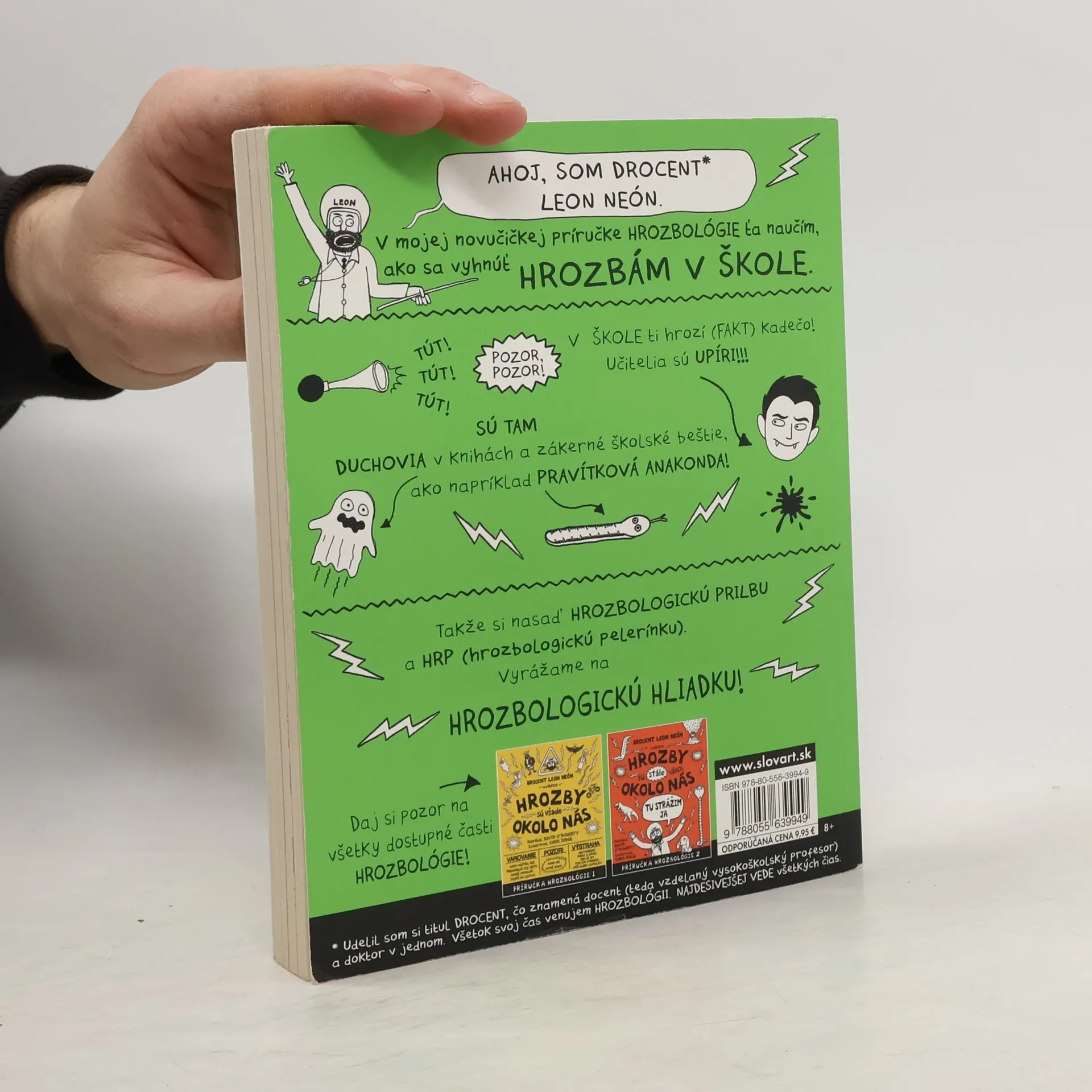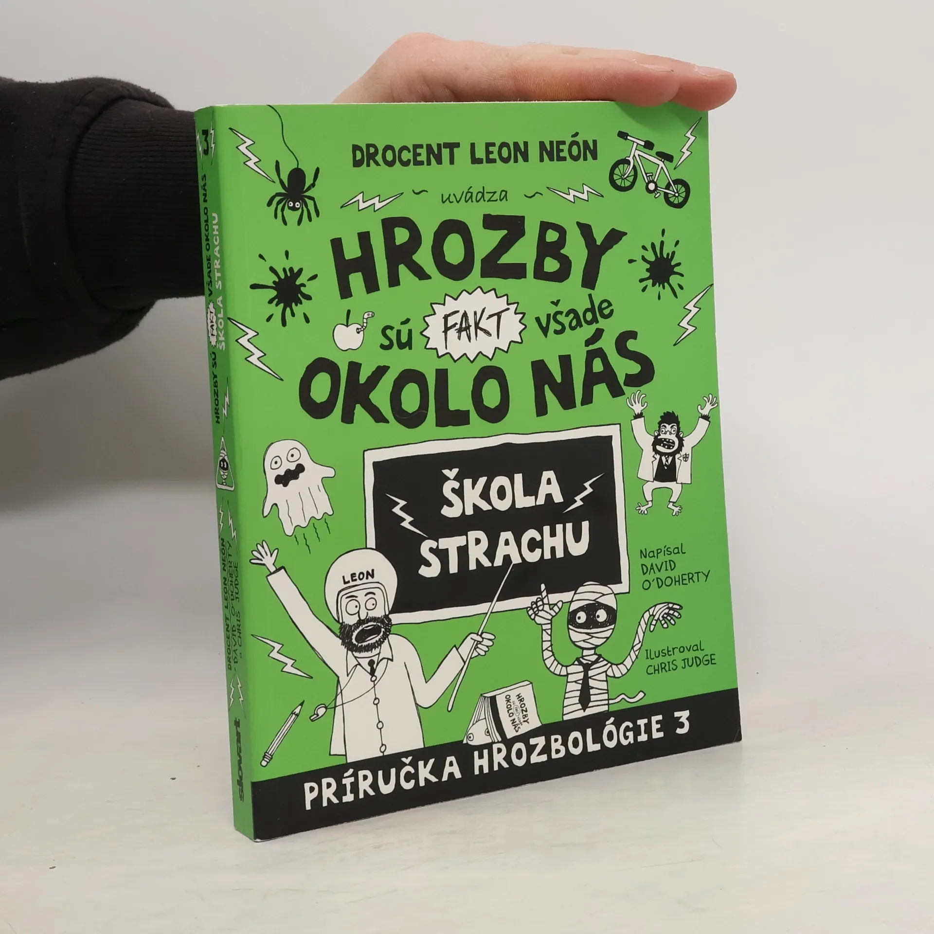 V tretej časti HROZBOLÓGIE rýchlo zistíte, že HROZBY SÚ FAKT VŠADE OKOLO NÁS. A navyše ešte aj to, že dosiahnuť vyššiu hrozbologickú úroveň nie je vôbec ľahké. Drocent Leon Neón o tom jednoducho musel napísať ďalšiu príručku, a ako už naznačil v prvých dvoch častiach, medzi naozaj, ale fakt naozaj najnebezpečnejšie a najhoršie miesta na celom svete patrí ŠKOLA. Že to ste už vedeli? No určite ste netušili, že Leon sa nešťastnou náhodou stane zamestnancom školy. Žeby sa aj hrozbológ mohol stať súčasťou niečoho takého hrôzostrašného?! Hrozby tam striehnu nielen v triedach, jedálni či telocvični. Sú všade okolo! Je dobré mať poruke odborníka! Knihu plnú hrozieb a desov by si mal povinne prečítať každý. Je v nej toľko obrázkov, že ju ocení i ten najlenivejší čitateľ. Aj tí predsa potrebujú vedieť, ako sa vyhnúť všetkým hrôzam a nebezpečenstvám a prežiť v hrôzostrašnej džungli dnešného sveta. Alebo ešte niečo horšie – V ŠKOLE!!!