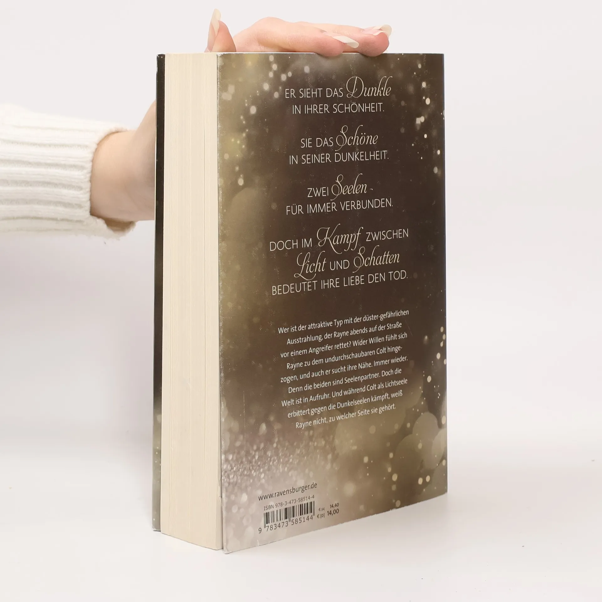 Wer ist der attraktive Typ mit der düster-gefährlichen Ausstrahlung, der Rayne abends auf der Straße vor einem Angreifer rettet? Wider Willen fühlt sich Rayne zu dem undurchschaubaren Colt hingezogen, und auch er sucht ihre Nähe. Immer wieder. Denn die beiden sind Seelenpartner. Doch die Licht- und Schattenwelt ist im Aufruhr, und während Colt auf der Seite der Lichtseelen steht, weiß Rayne nicht, zu wem sie gehört.