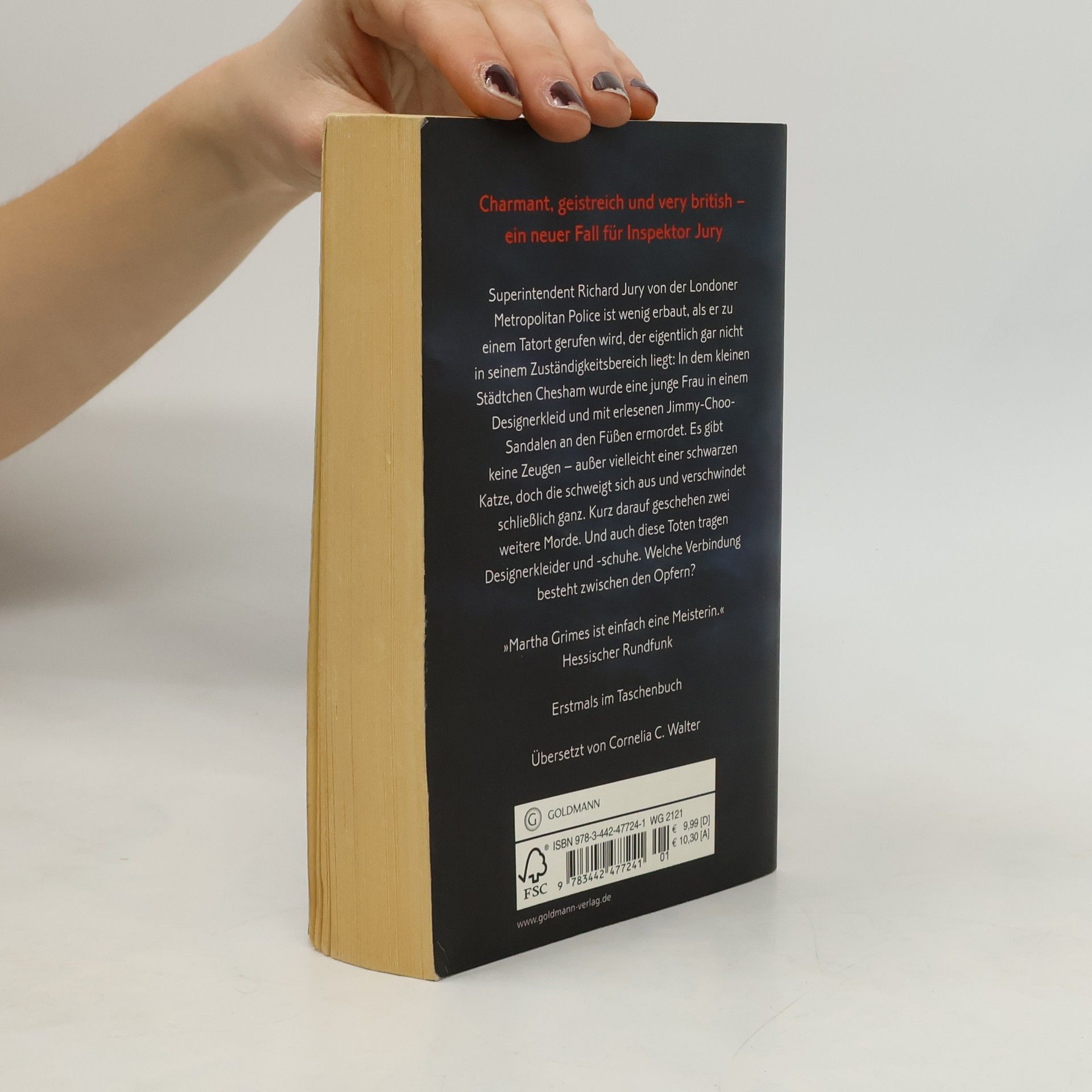 Sex and Grimes. Niemand mordet britischer. Superintendent Richard Jury von der Londoner Metropolitan Police ist wenig erbaut, als er zu einem Tatort gerufen wird, der eigentlich gar nicht in seinem Zuständigkeitsbereich liegt: In dem kleinen Städtchen Chesham wurde eine junge Frau in einem Designerkleid und mit erlesenen Jimmy-Choo-Sandalen an den Füßen ermordet. Es gibt keine Zeugen – außer vielleicht einer schwarzen Katze, doch die schweigt sich aus und verschwindet schließlich ganz. Kurz darauf geschehen zwei weitere Morde. Und auch diese Toten tragen Designerkleider und -schuhe. Welche Verbindung besteht zwischen den Opfern?